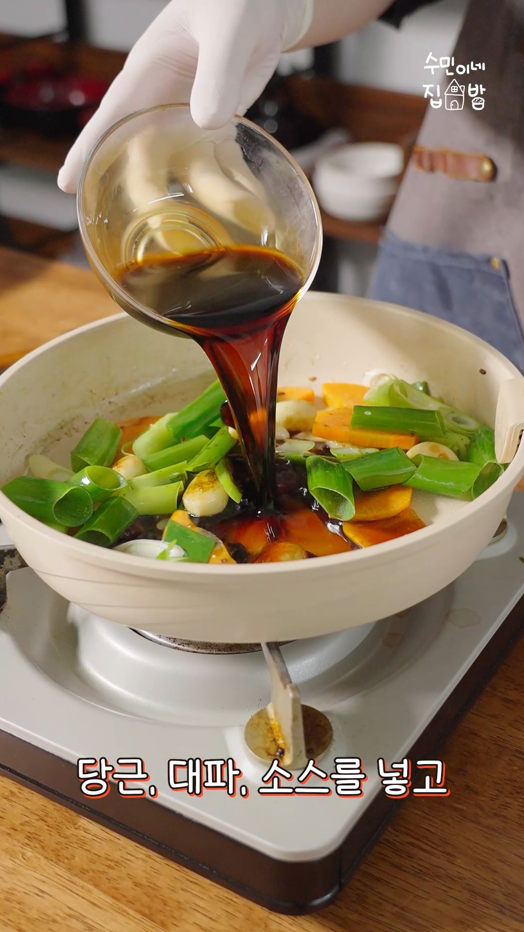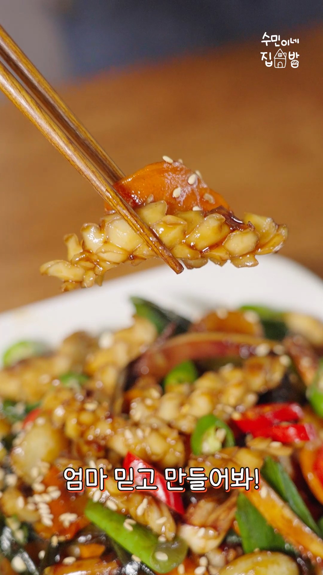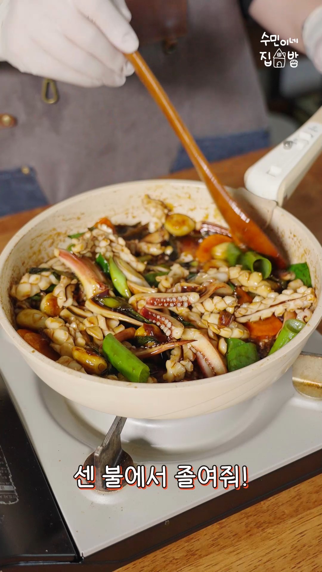오징어 2마리청양고추 2개홍고추 1개당근 1/5개대파 2대통마늘 10개진간장 3T굴소스 1/2T맛술 2T올리고당 3T통깨후추
