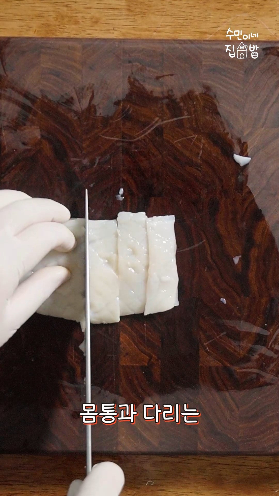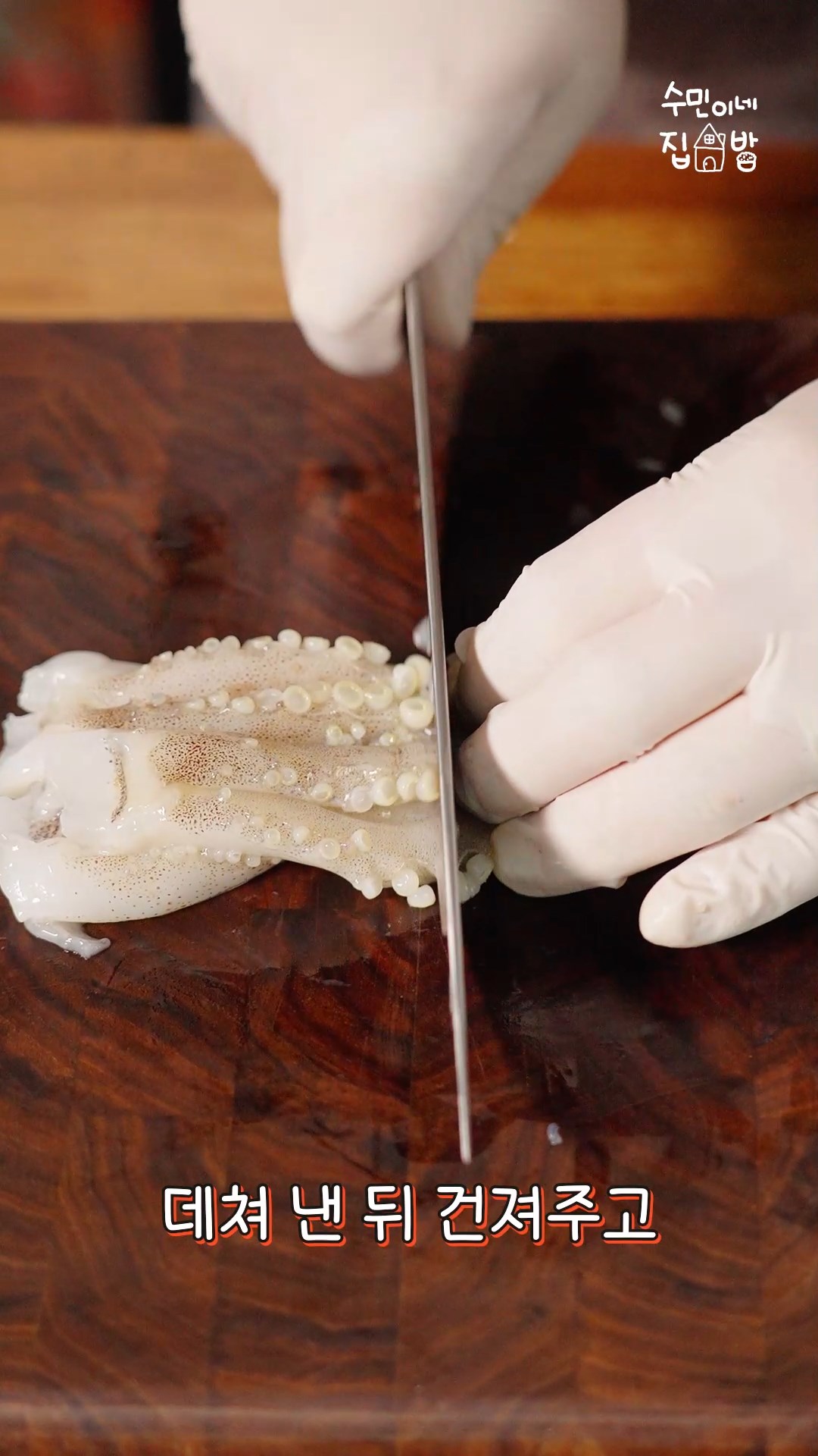1. 오징어에 격자 칼집을 넣어 먹기좋게 자른 뒤 끓는 물에 데쳐주세요.