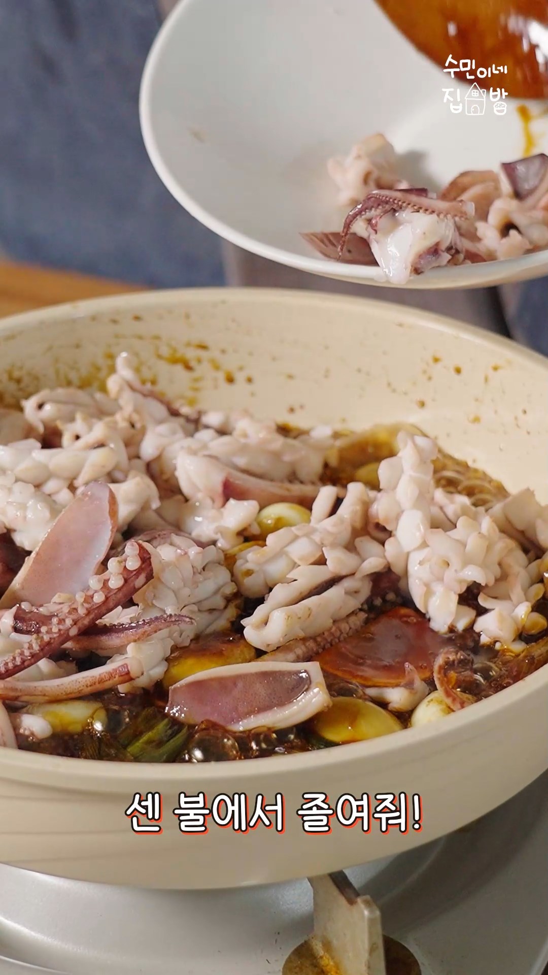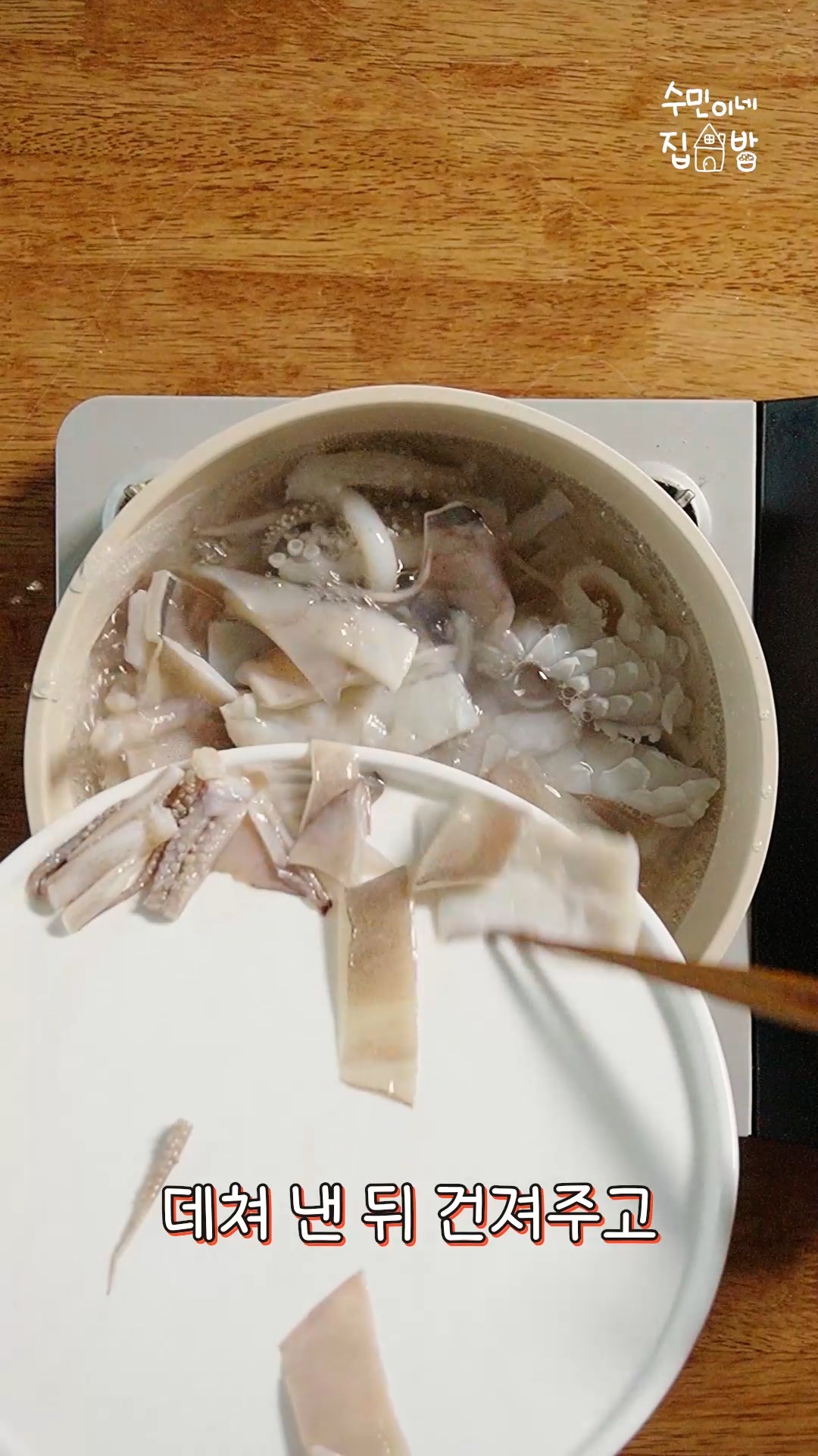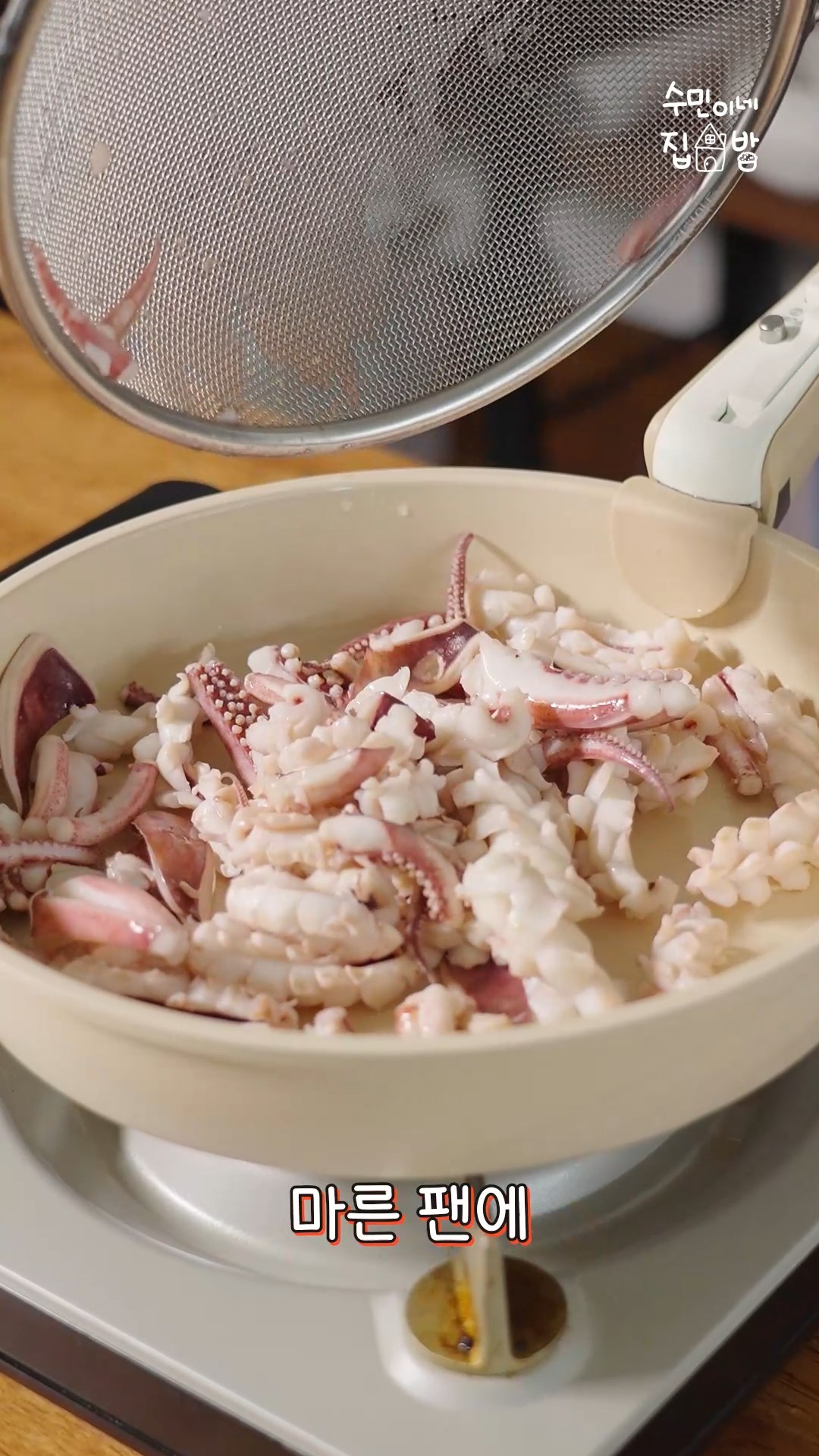 2. 데친 오징어는 마른팬에 약불로 볶아 수분을 날려주세요.