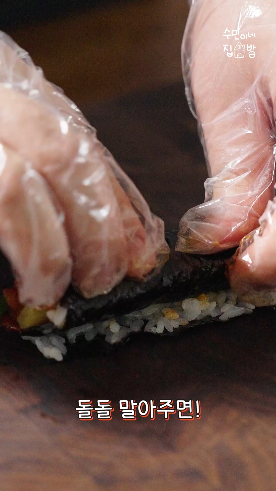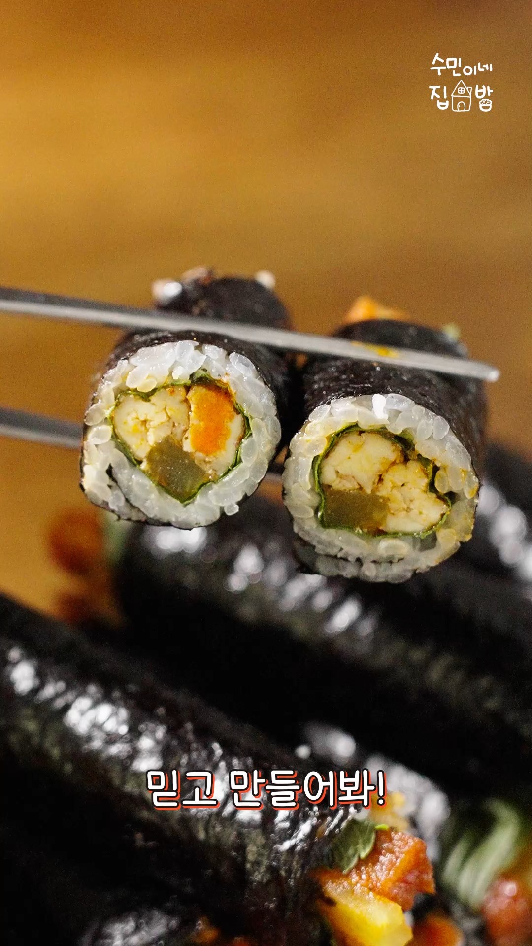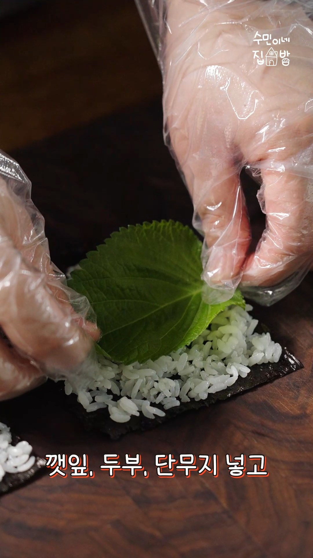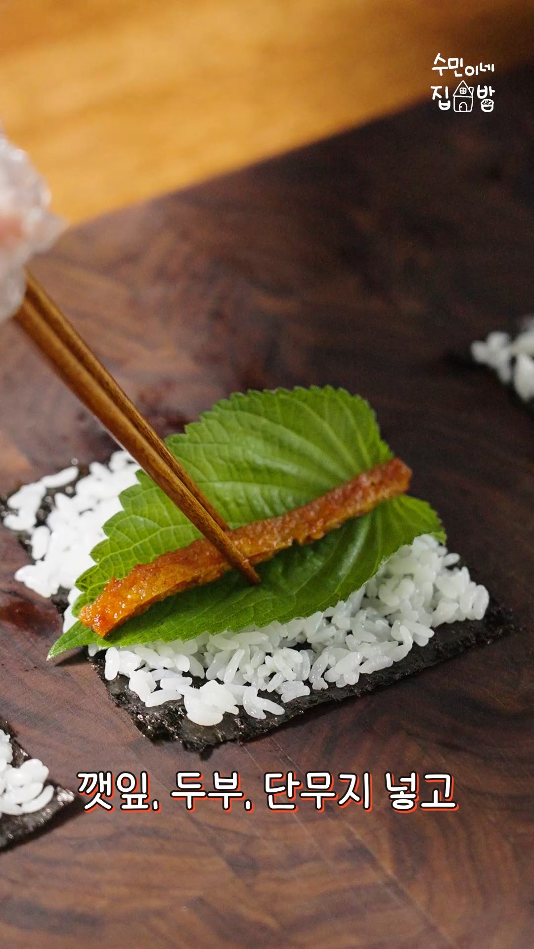 5. 김에 밥을 펼치고 깻잎,두부,단무지를 넣고 돌돌 말아주시면 완성!!