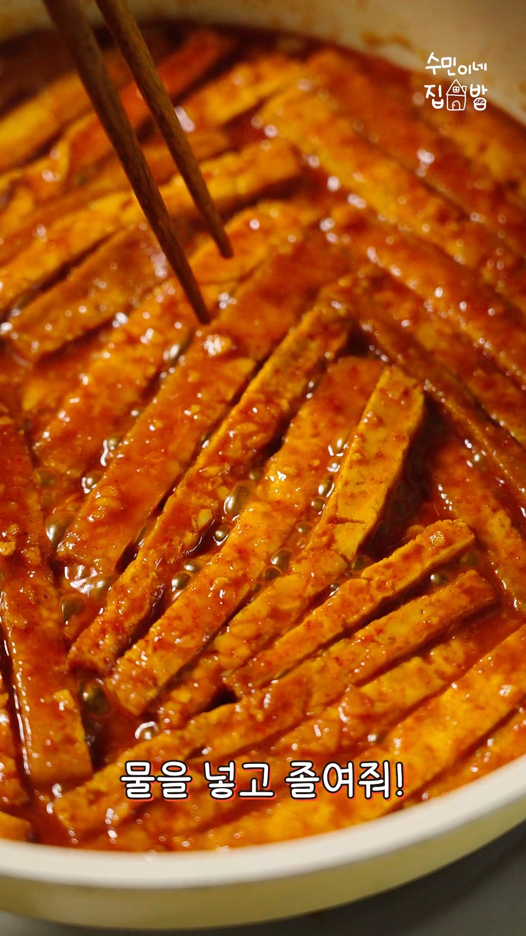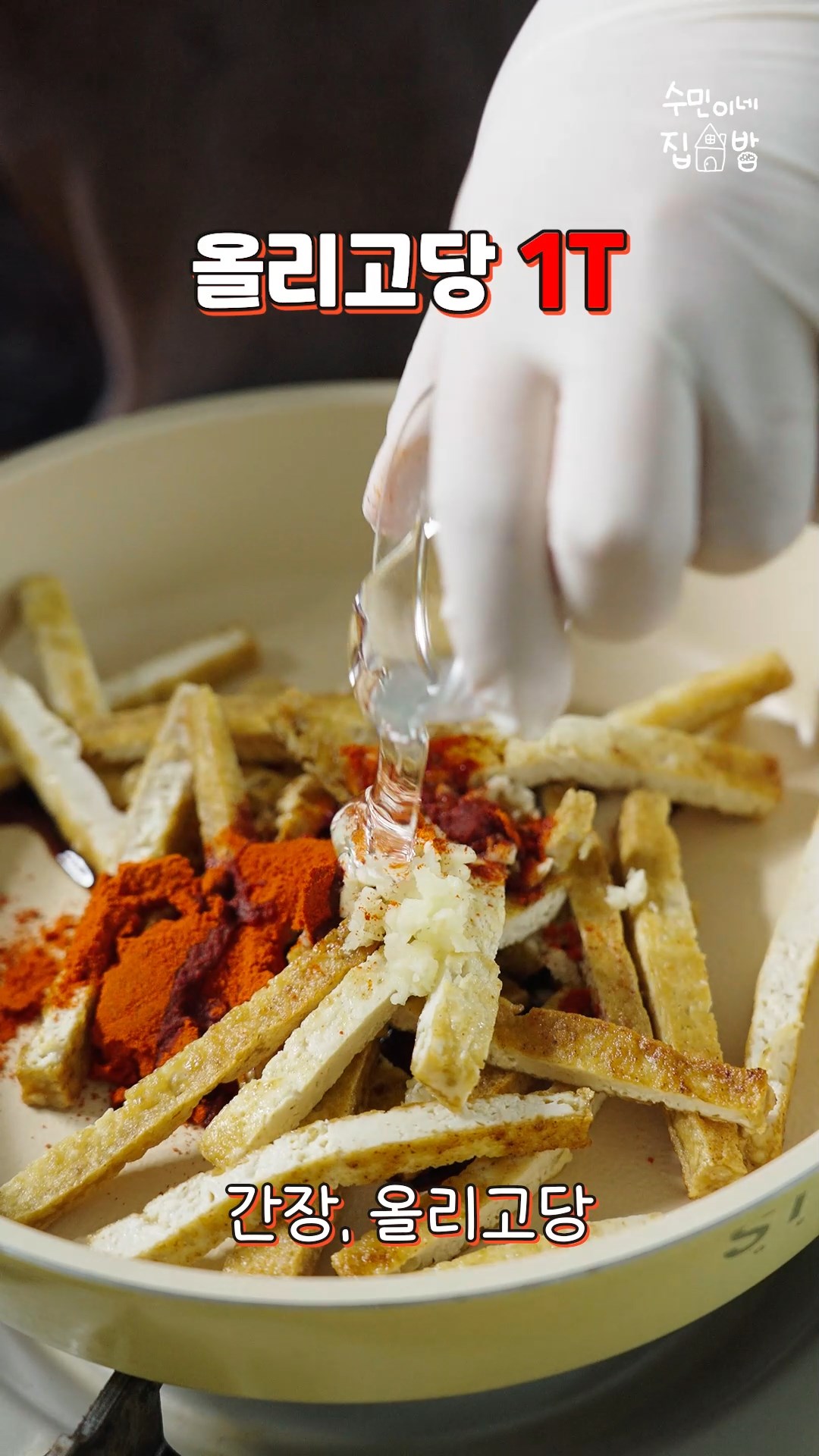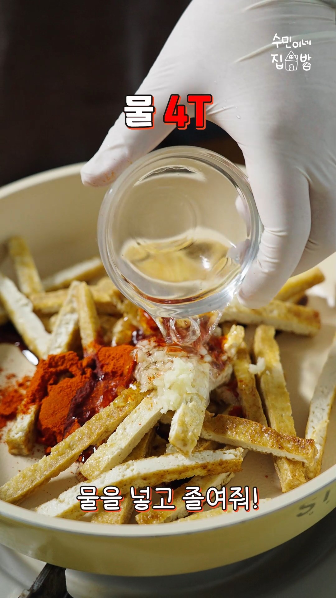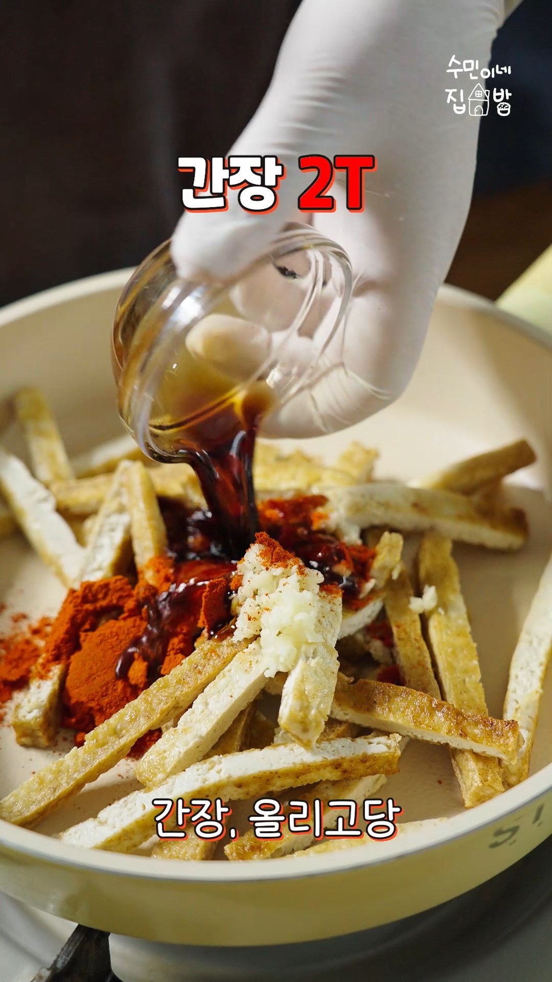 4. 식힌 두부는 채썰어서 팬에 넣고 다진마늘,고춧가루,간장,올리고당,물을 넣고 졸여주세요.