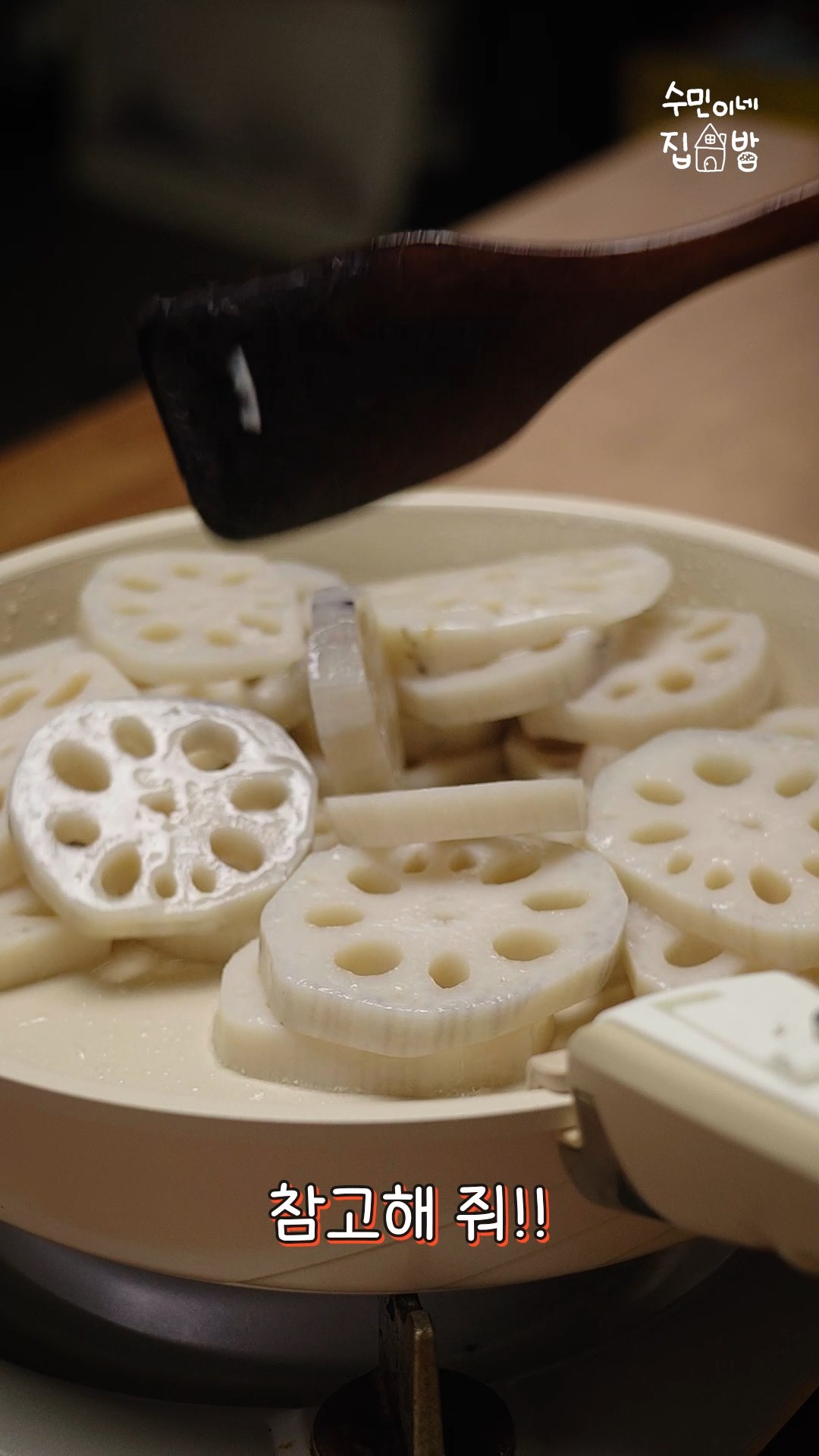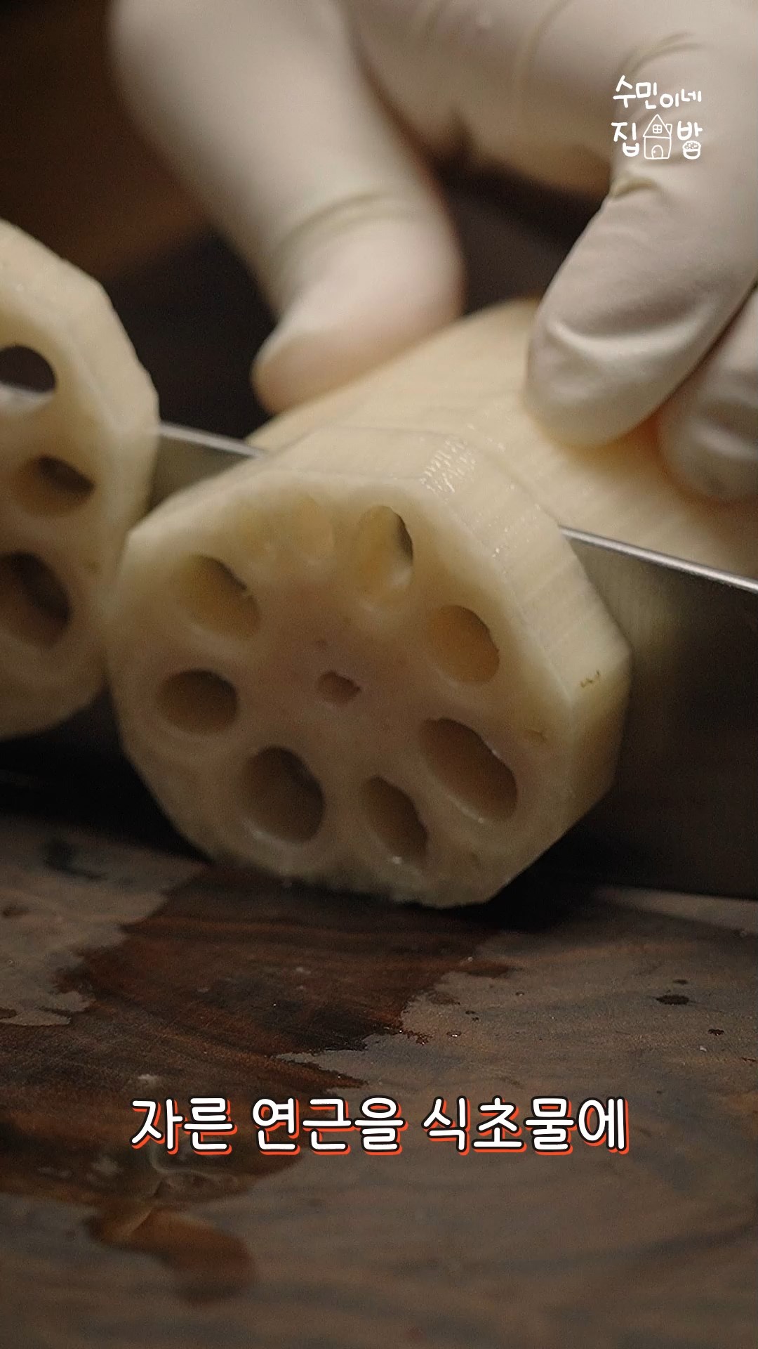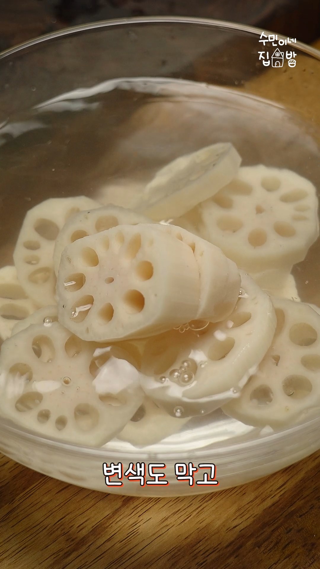 1. 연근은 껍질 제거 후 먹기 좋은 두께로 잘라 식초물에 3분정도 담가주세요.