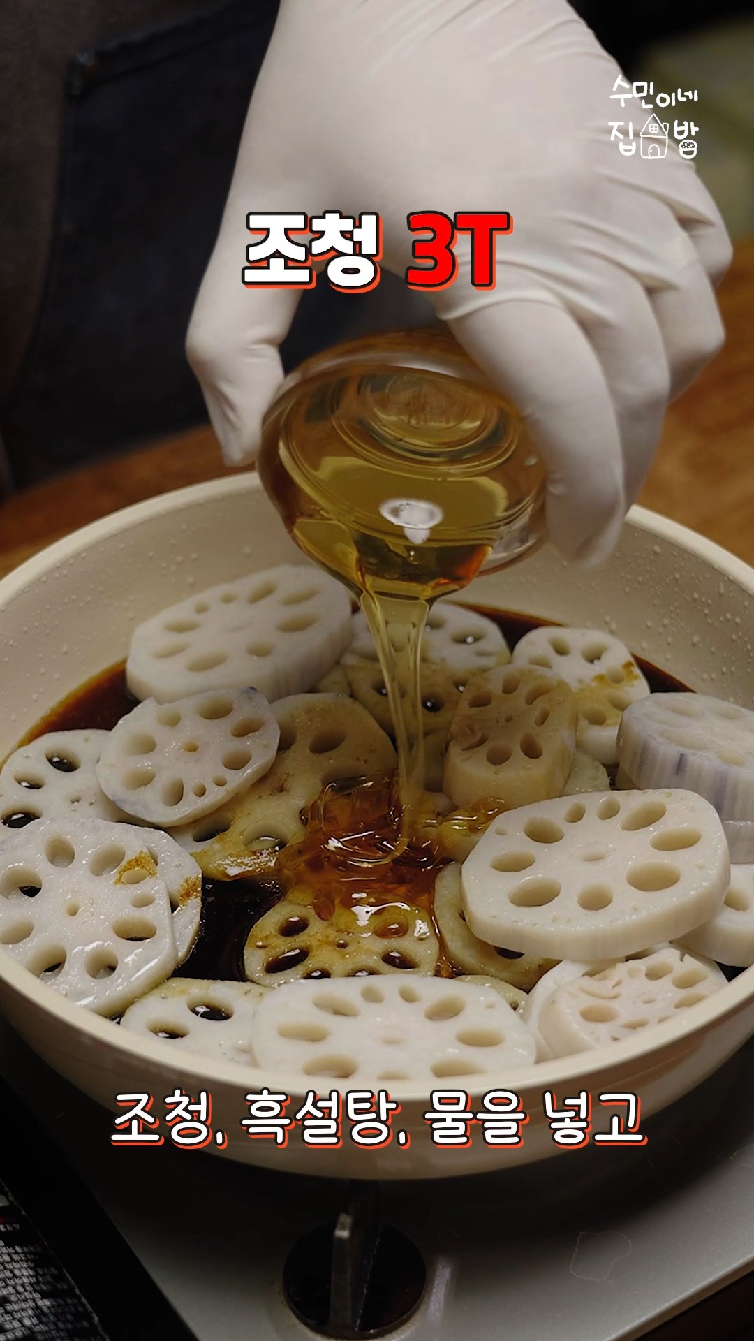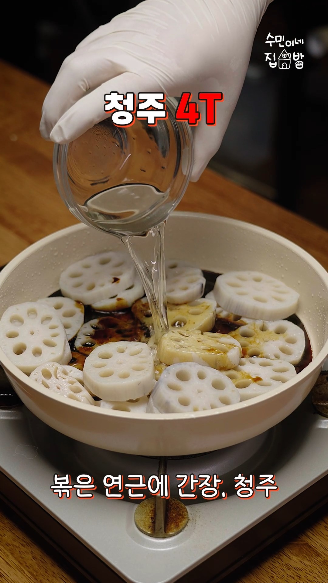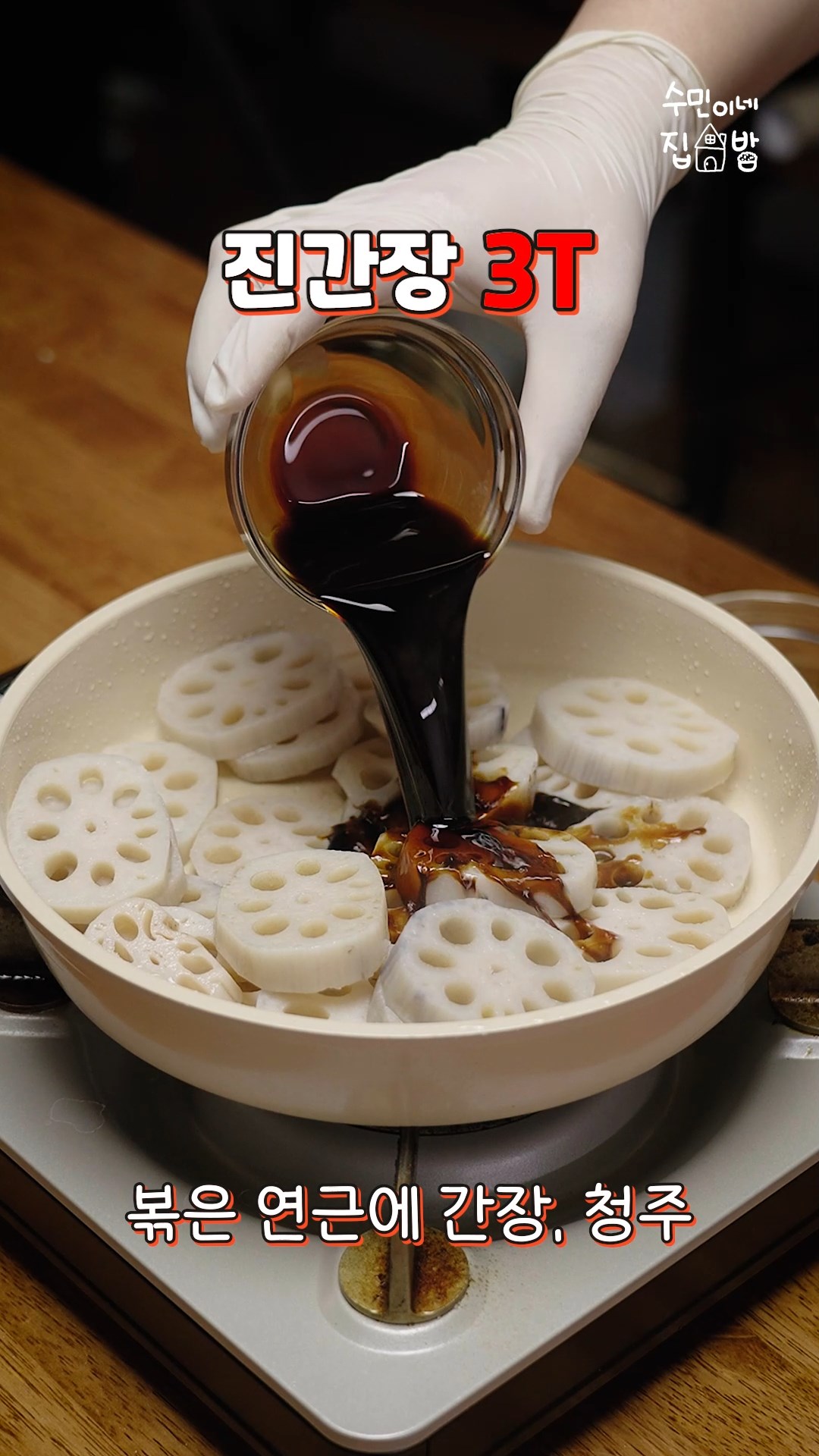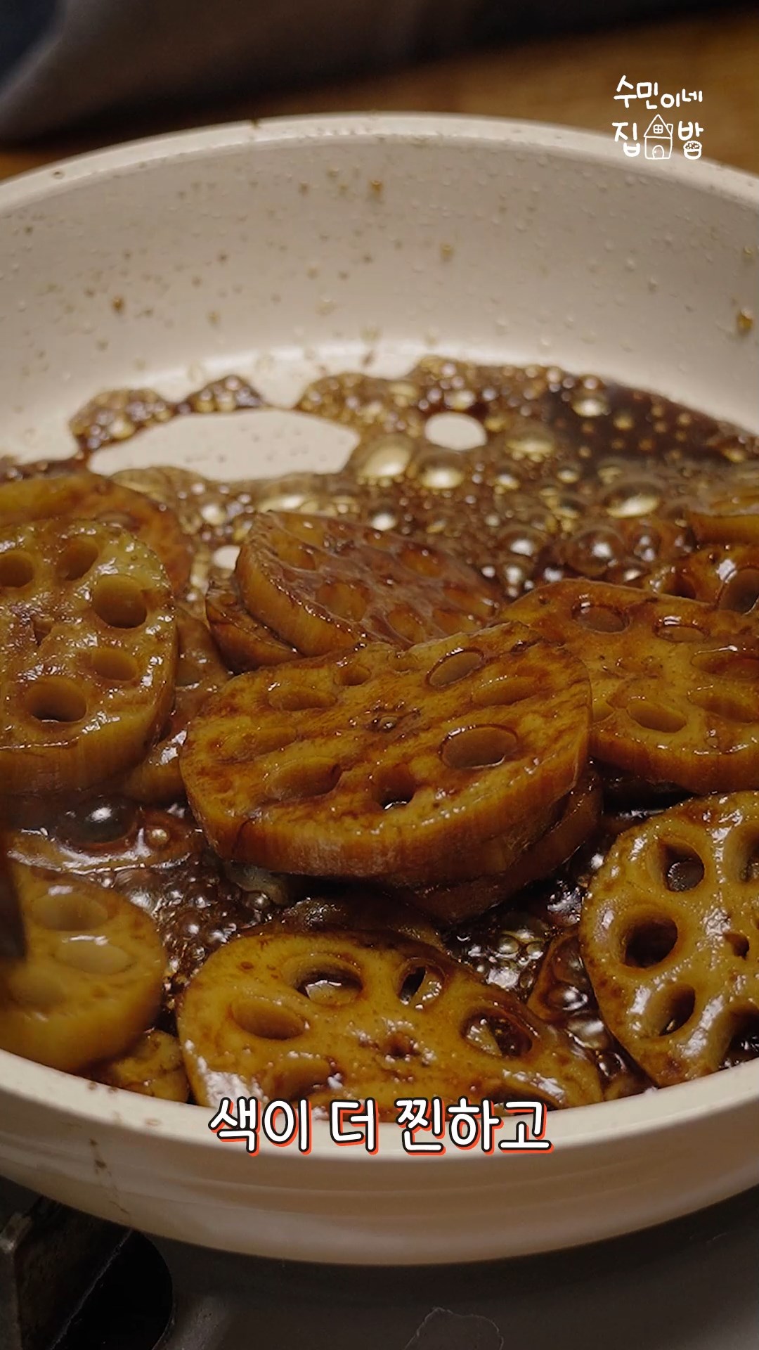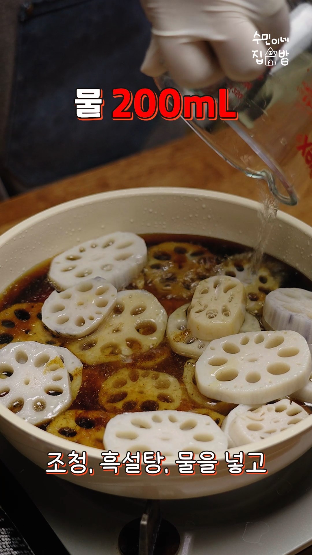 3. 팬에 기름을 두르고 연근을 볶은 뒤 간장, 청주, 조청, 흑설탕, 물을 넣고 센불에서 5분정도 졸여주세요.
