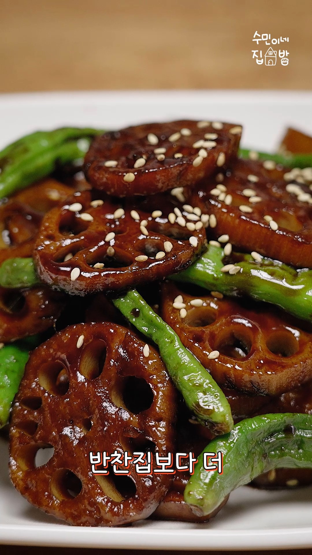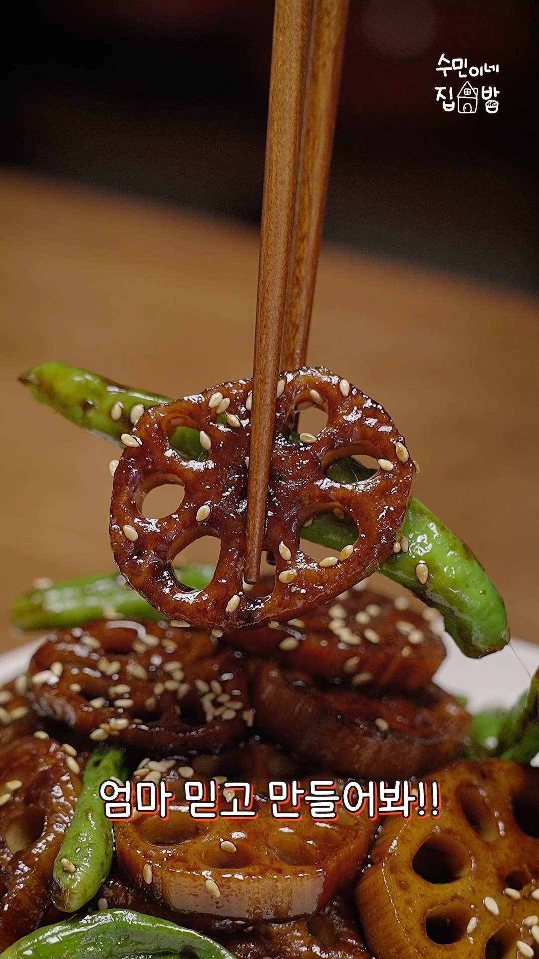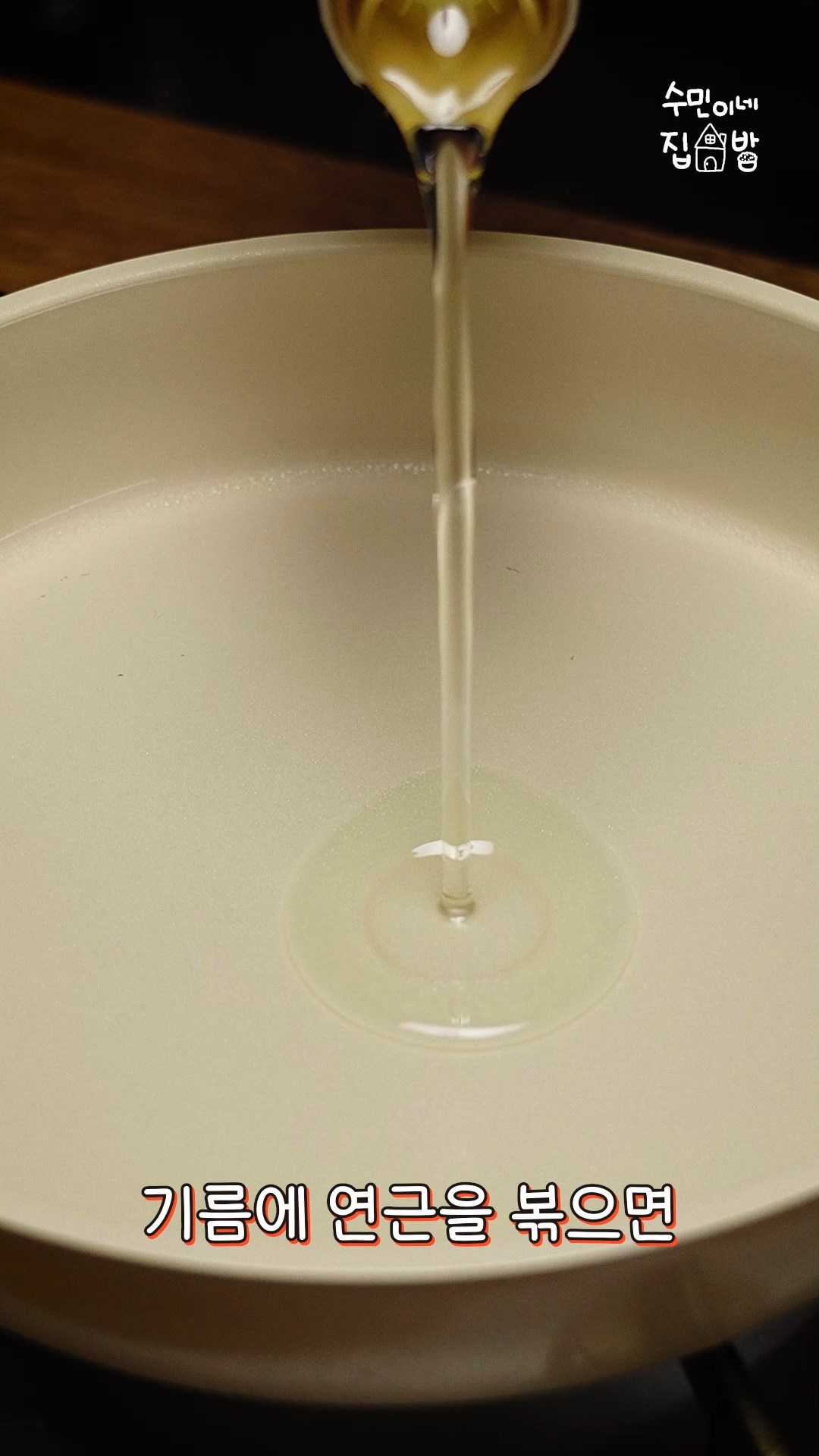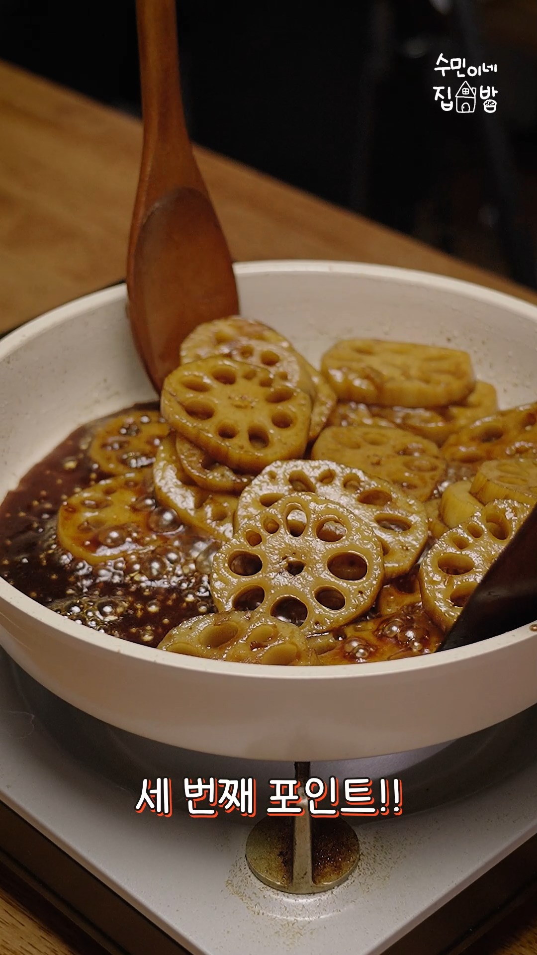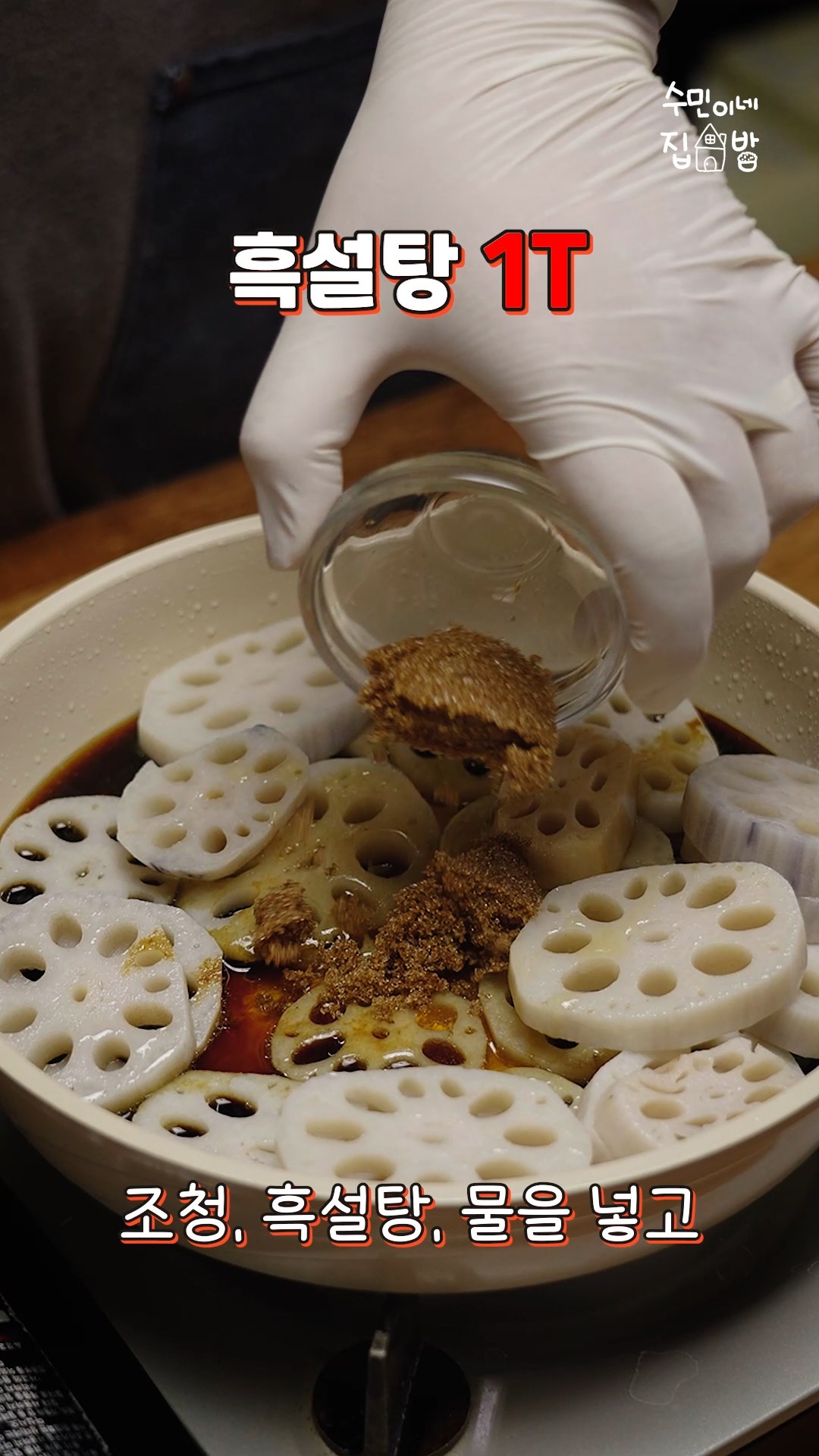 3. 팬에 기름을 두르고 연근을 볶은 뒤 간장, 청주, 조청, 흑설탕, 물을 넣고 센불에서 5분정도 졸여주세요.