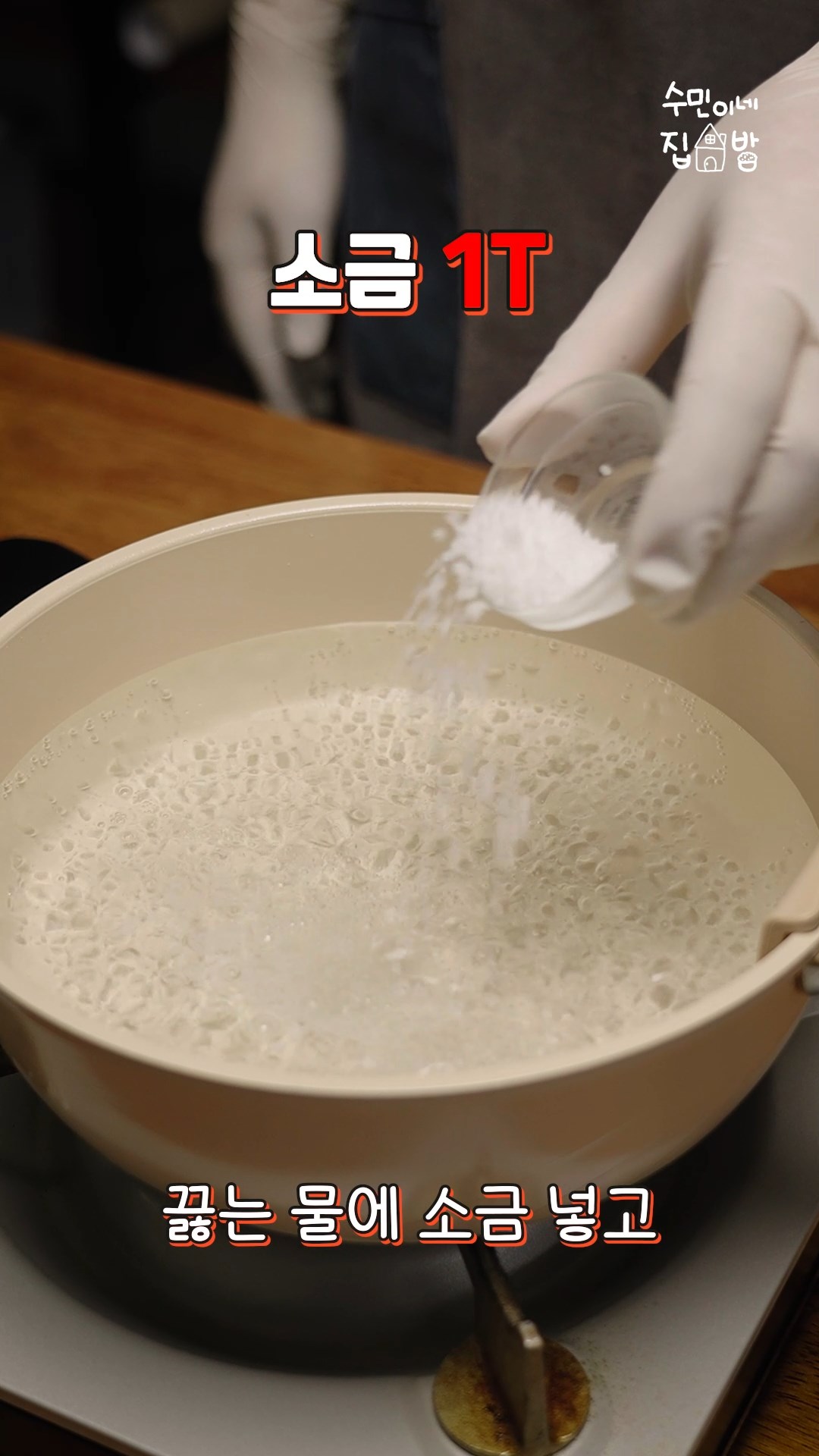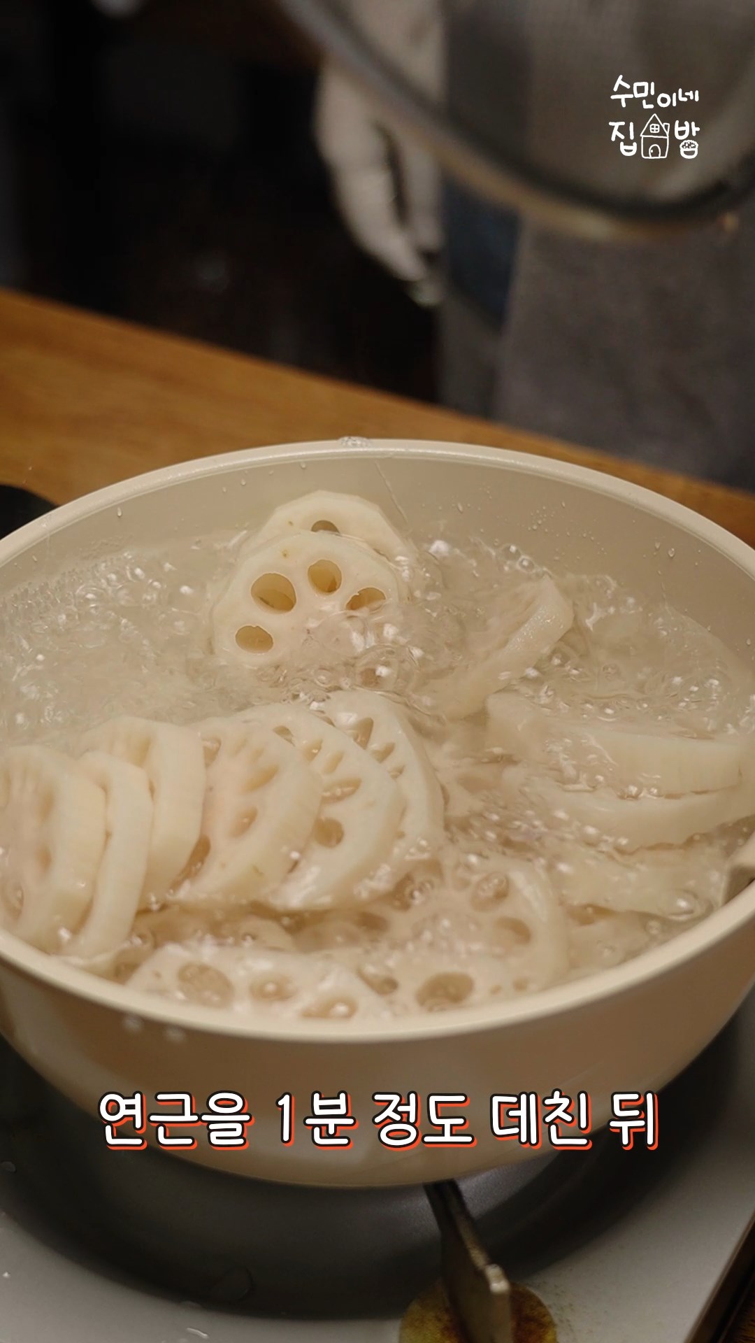 2. 끓는 물에 소금을 넣고 연근을 1분정도 데쳐 찬물에 식혀 물기제거를 해주세요.