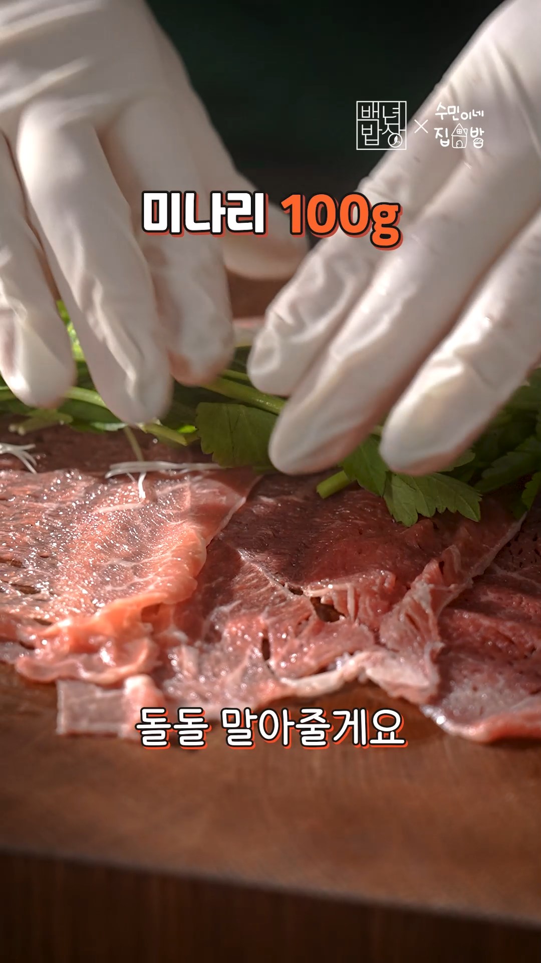 3. 도마에 고기를 깔고 세척 후 손질한 미나리, 팽이버섯을 넣고 말아주세요.