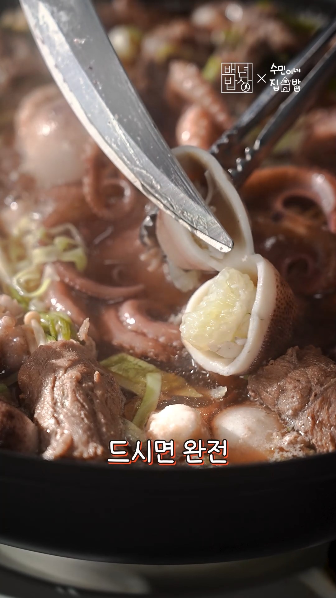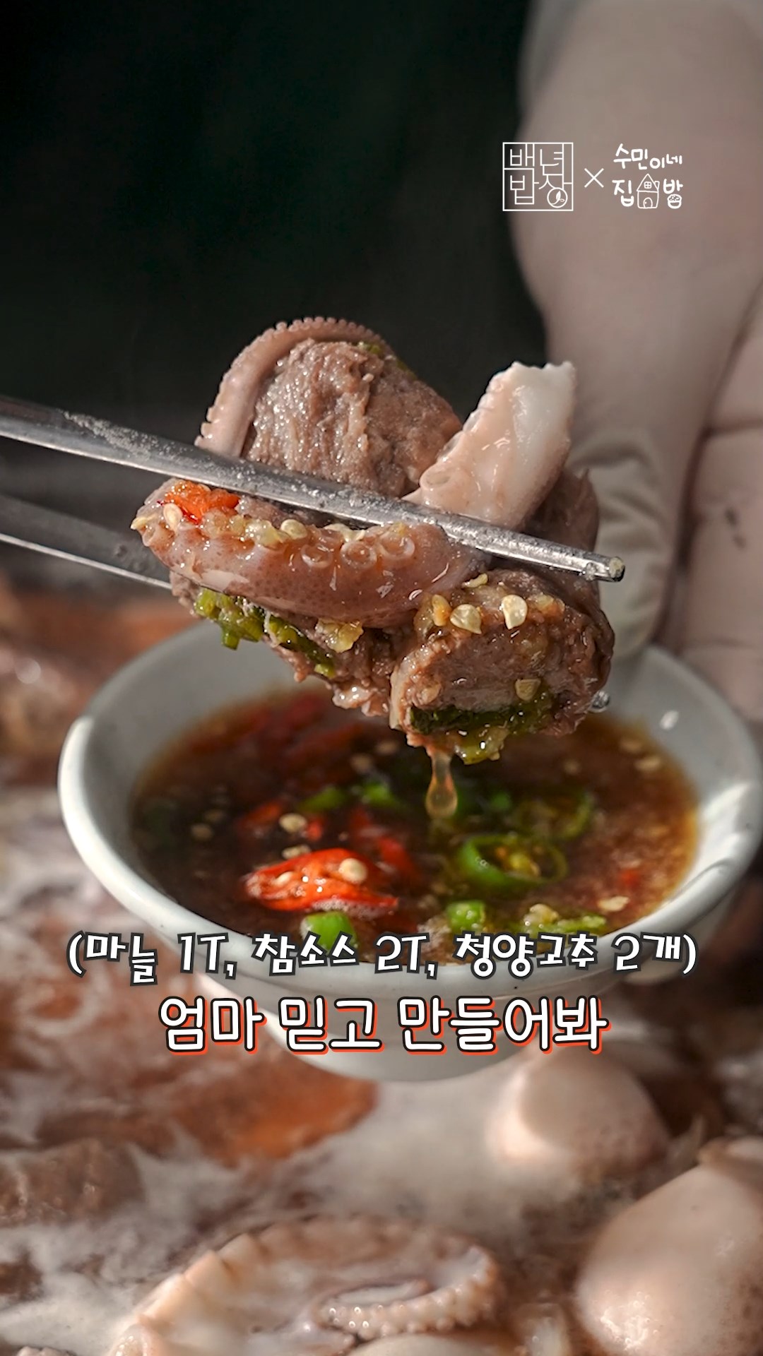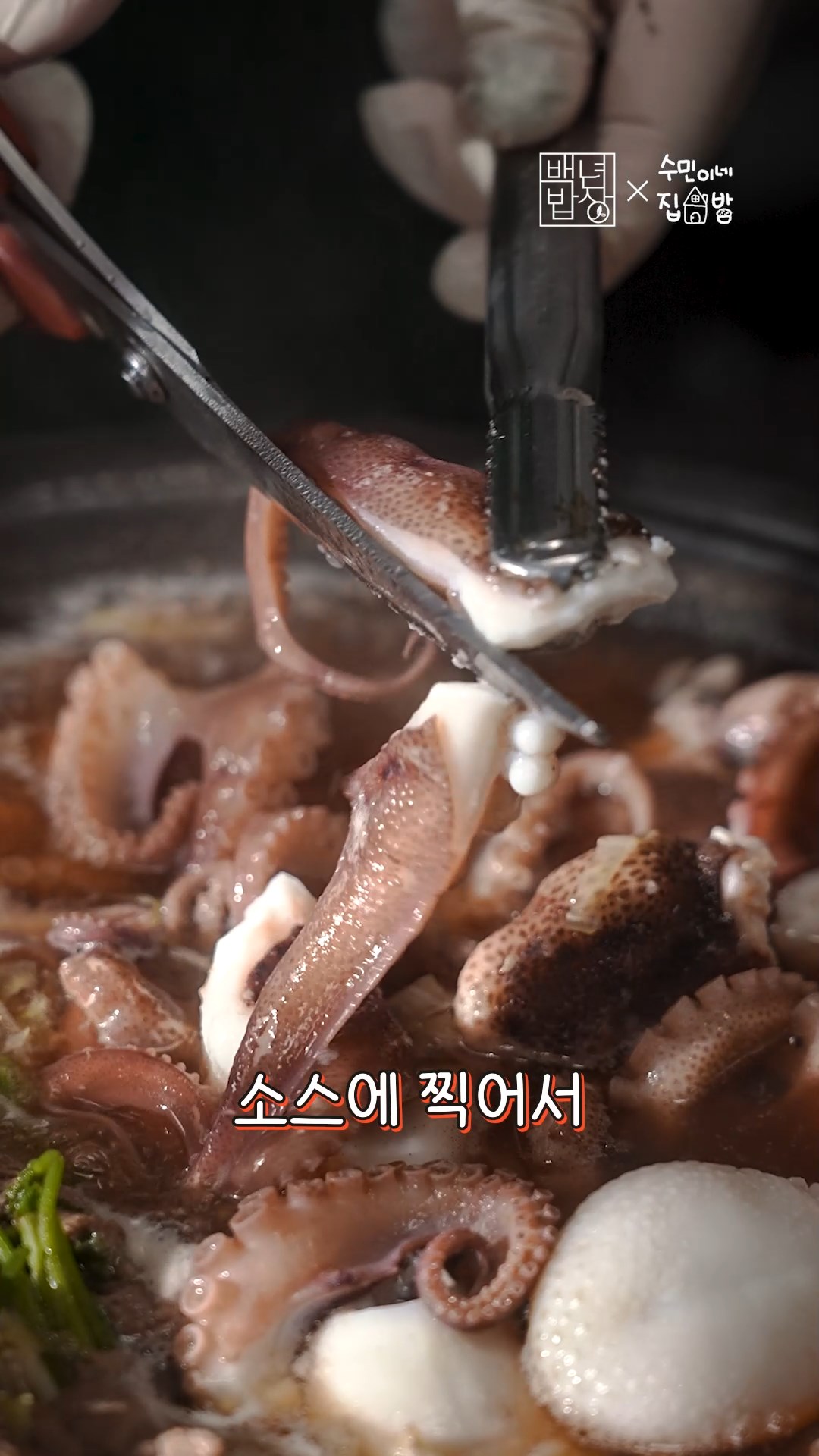 5. 고기와 쭈꾸미가 익으면 가위로 잘라 소스에 찍어먹으면 완성!