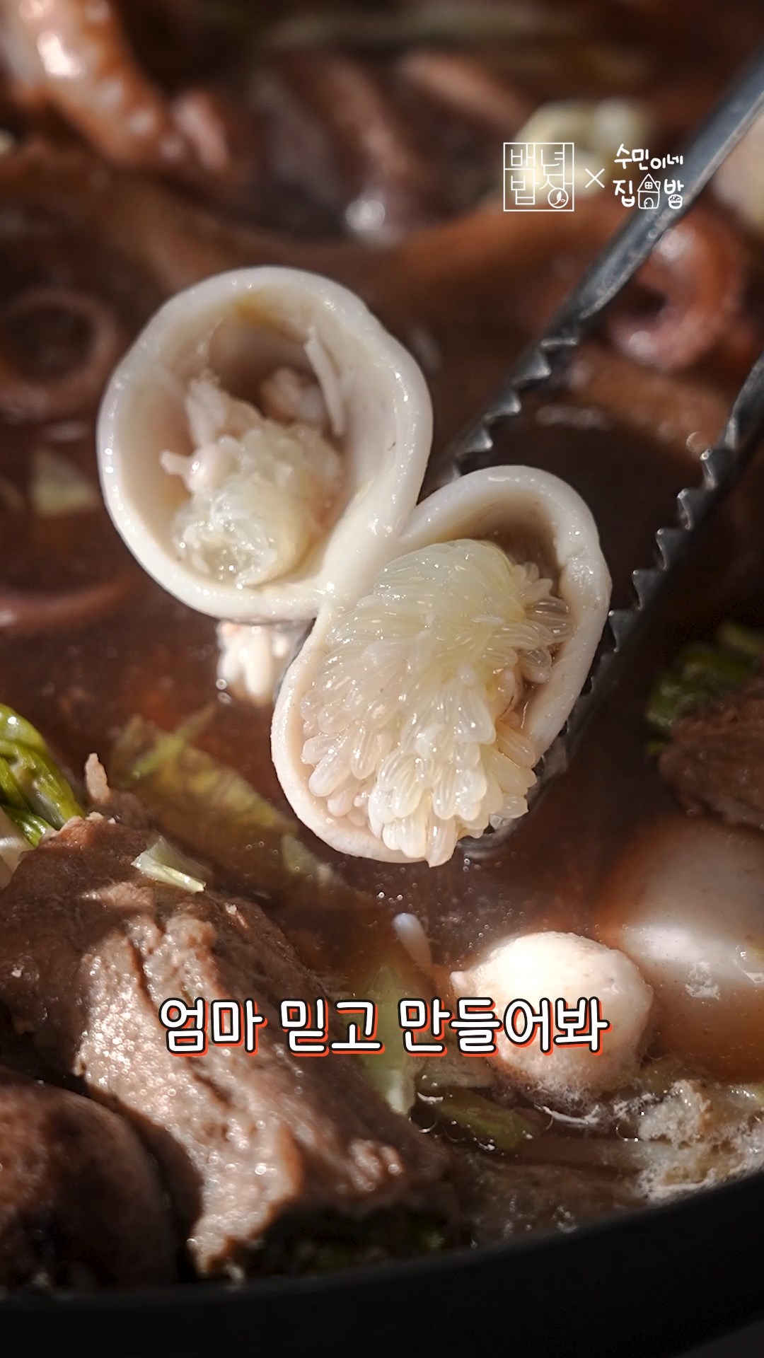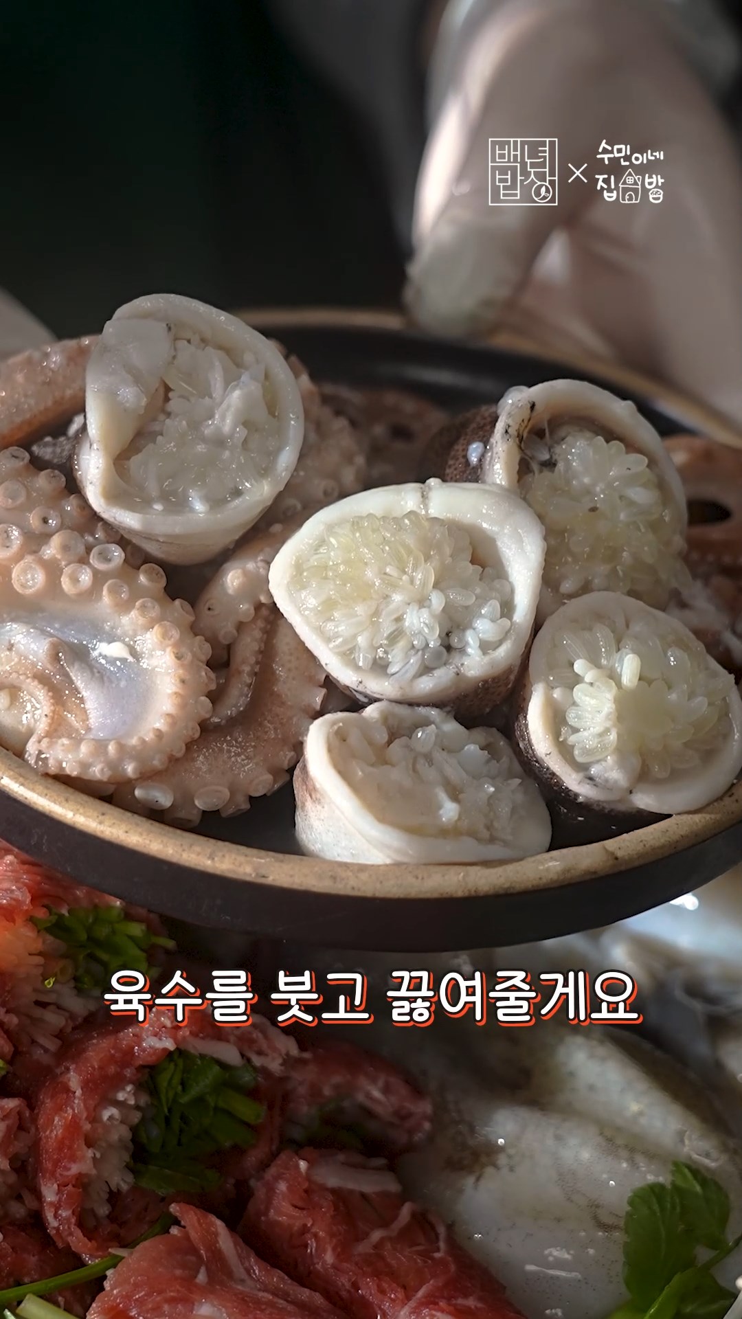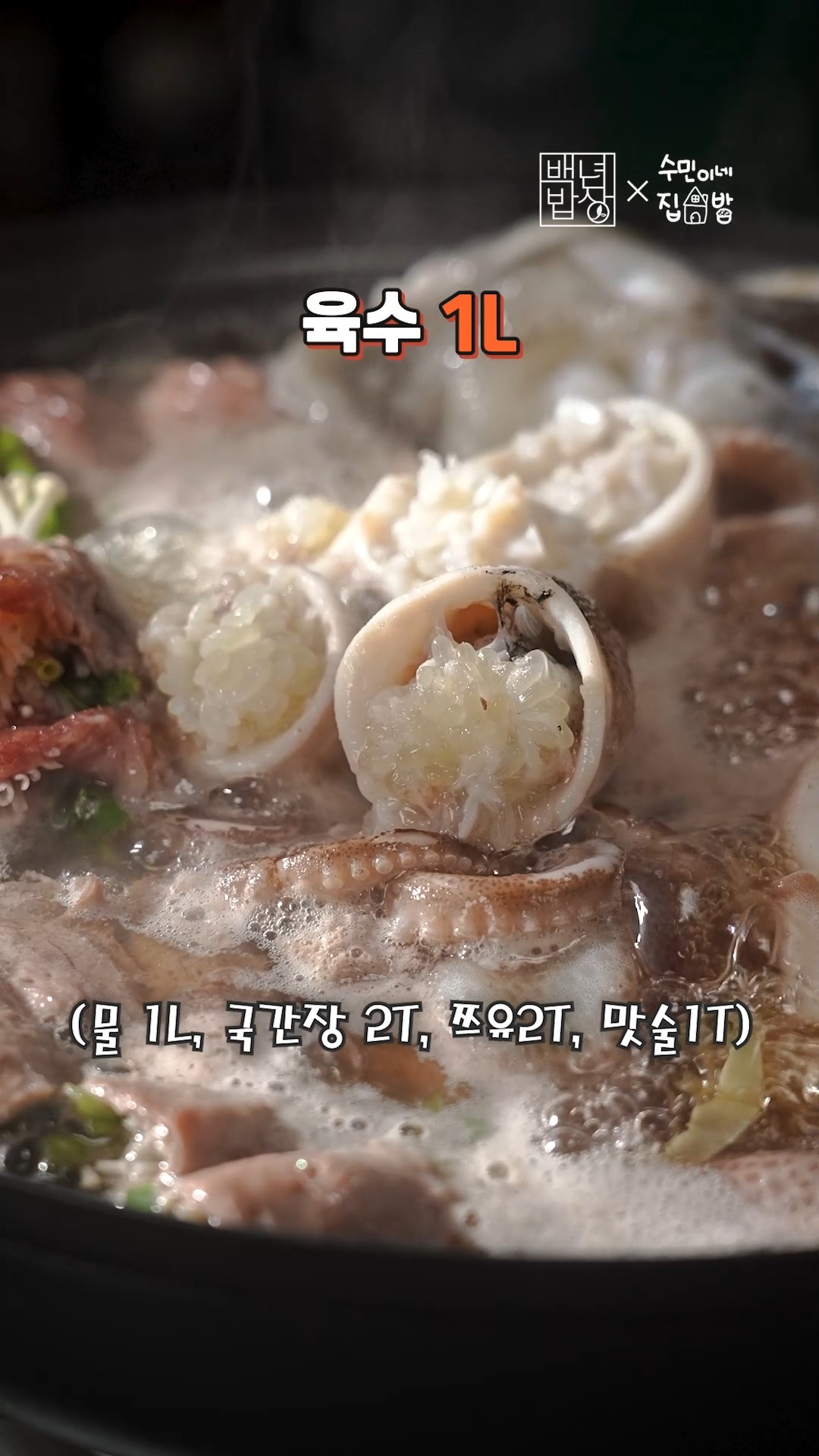 4. 냄비에 양배추를 깔고 쭈꾸미, 고기말이를 얹어 육수를 부어 끓여주세요.