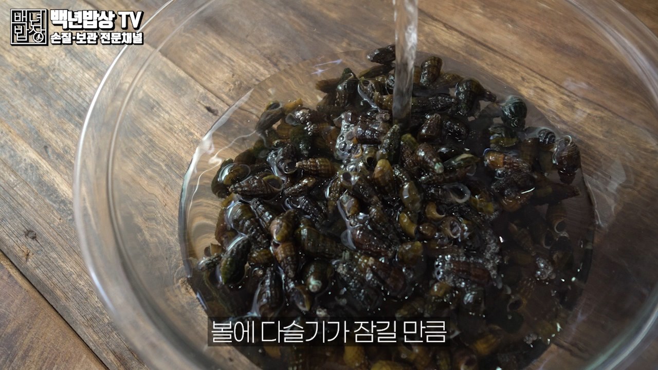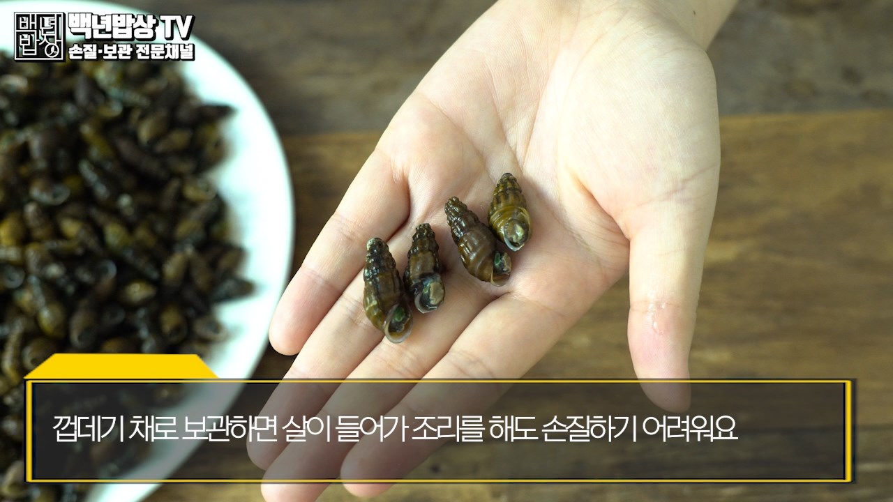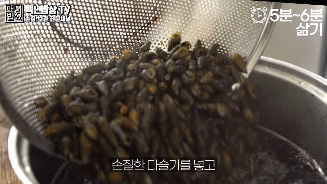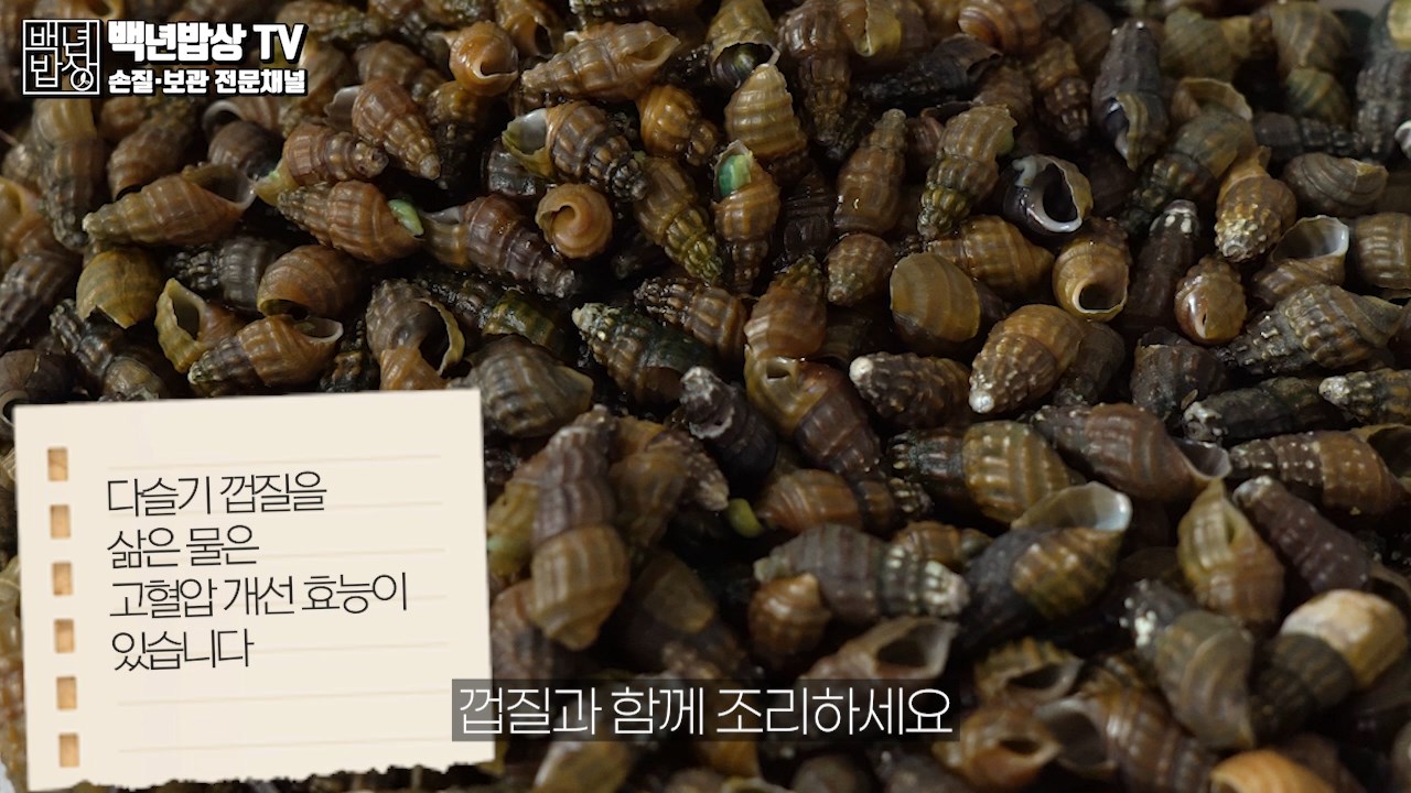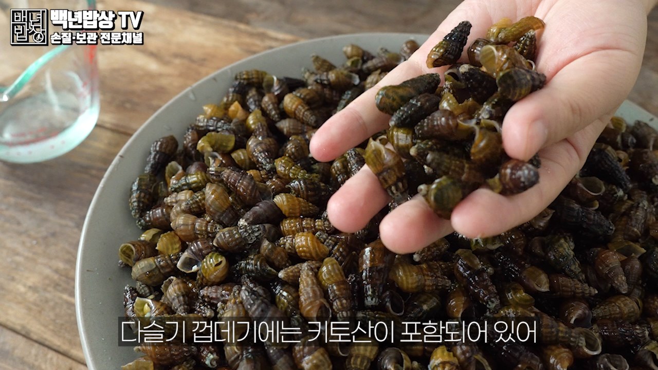 다슬기 껍데기에는 키토산이 포함되어 있어 유익하므로 요리를 할 때는 껍질과 함께 조리하세요. (다슬기 물은 고혈압 개선 효능이 있습니다.)