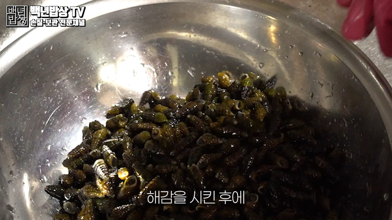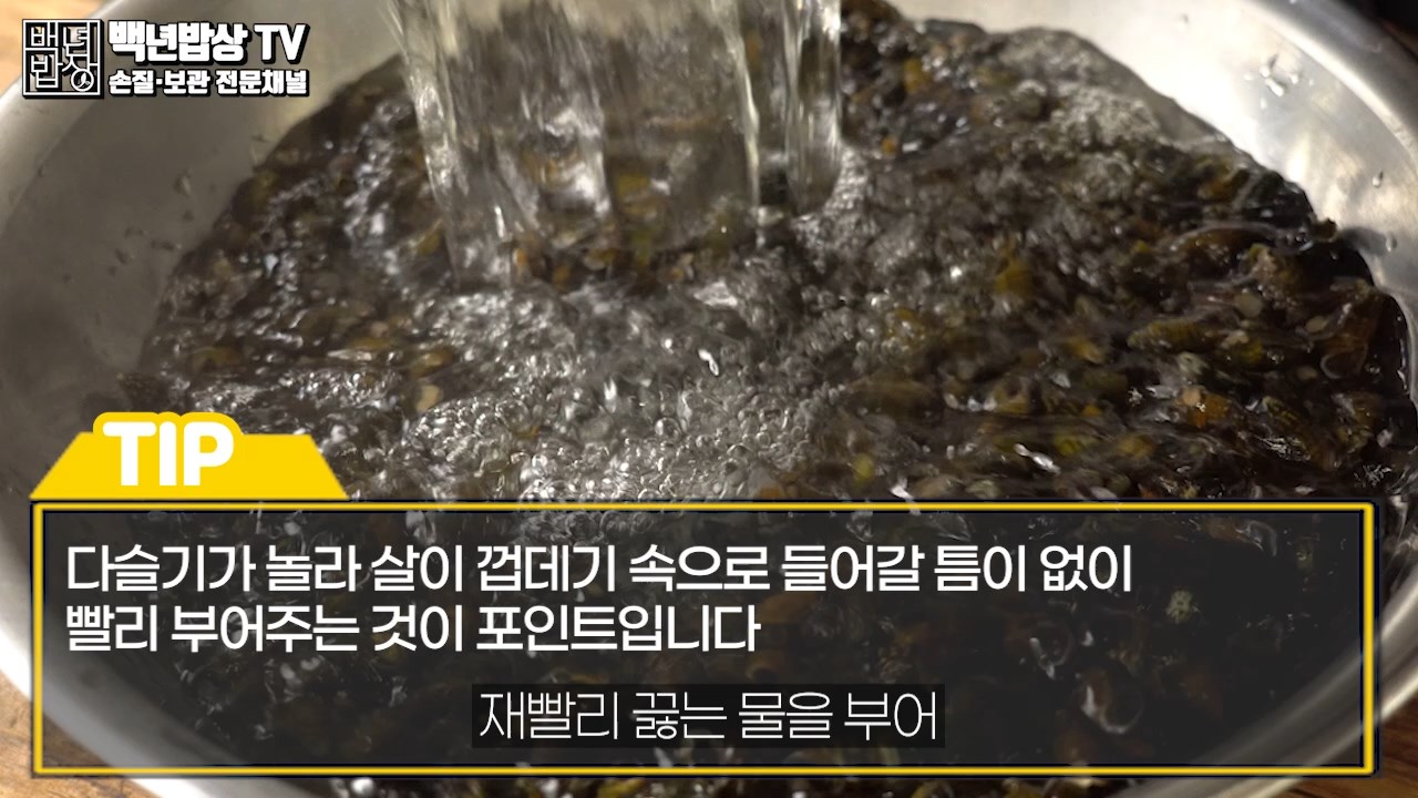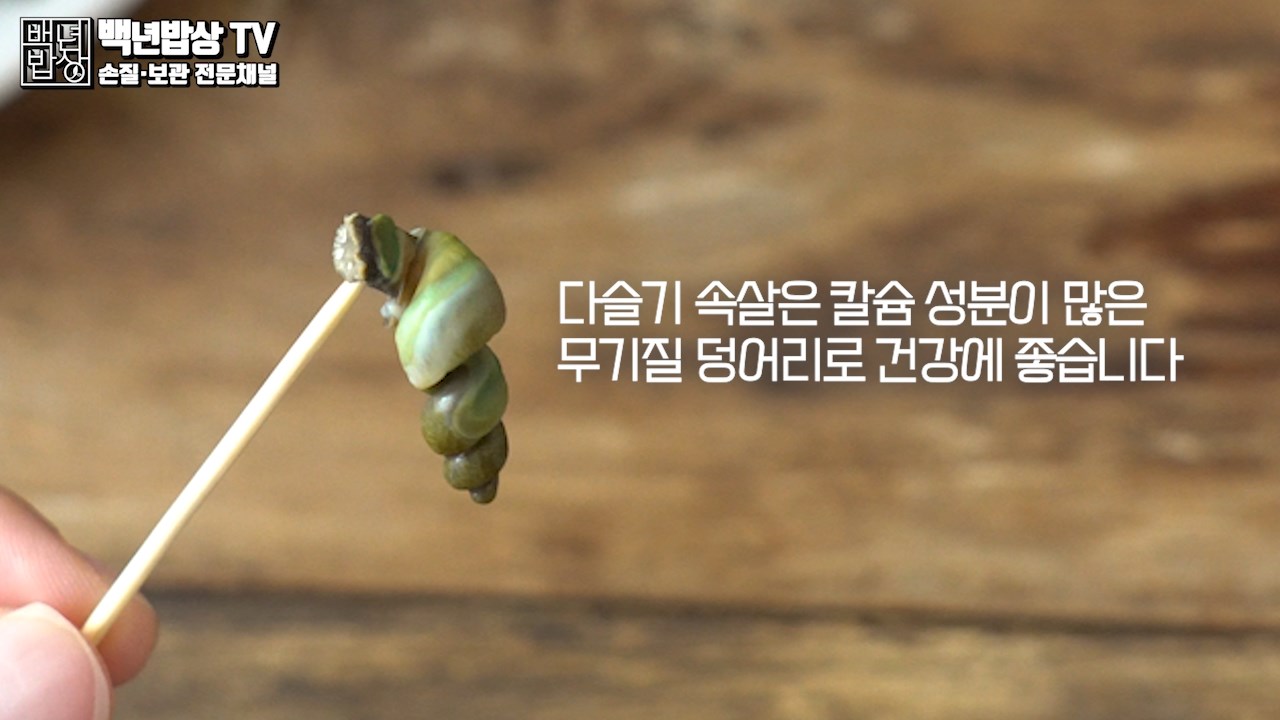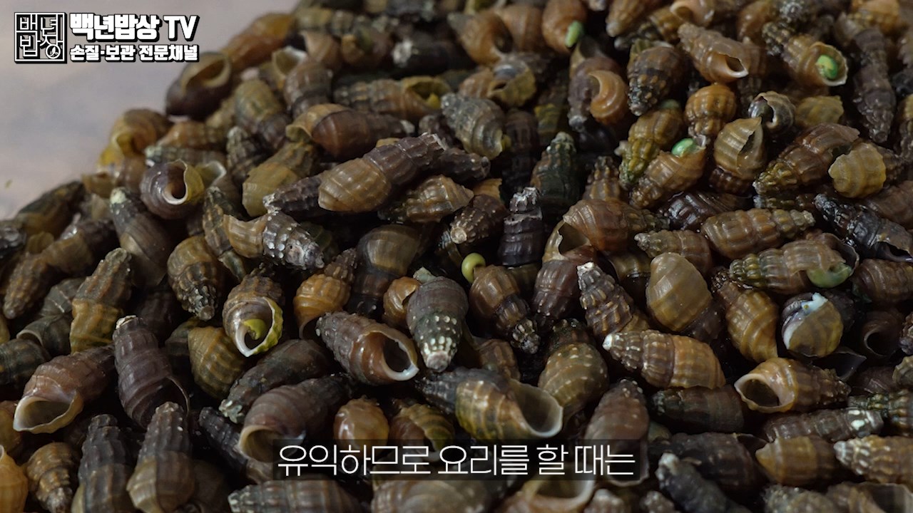 다슬기 껍데기에는 키토산이 포함되어 있어 유익하므로 요리를 할 때는 껍질과 함께 조리하세요. (다슬기 물은 고혈압 개선 효능이 있습니다.)