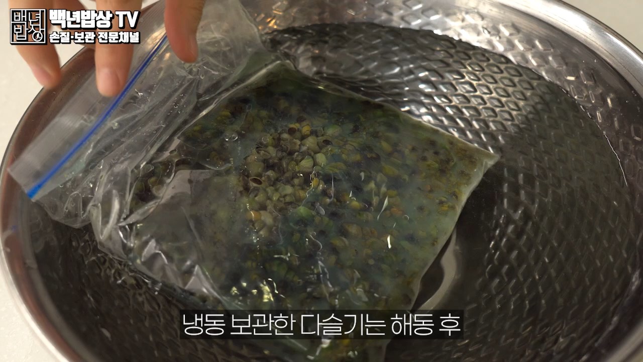 손질하여 발라낸 살은 지퍼백에 넣고 물을 자작하게 넣은 뒤 냉동고에 넣으면 1개월 정도 다슬기 보관이 가능합니다. 껍데기 채로 보관하면 살이 들어가 조리를 해도 손질하기 어려워요.