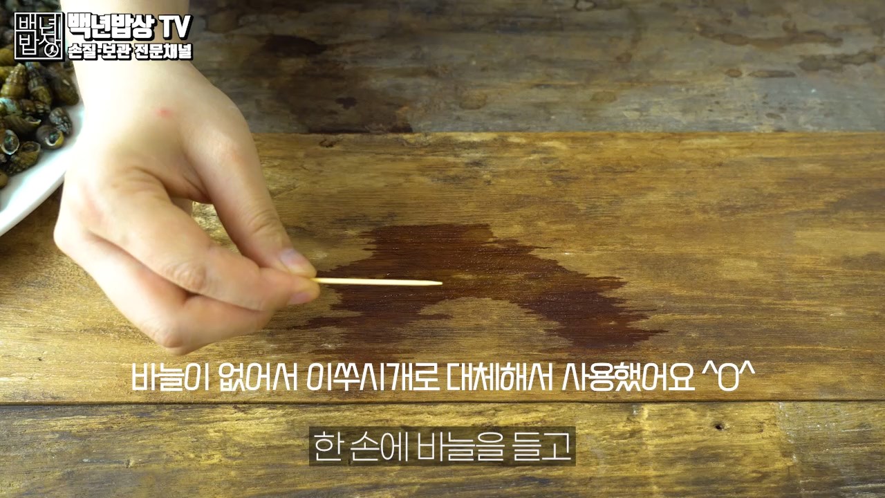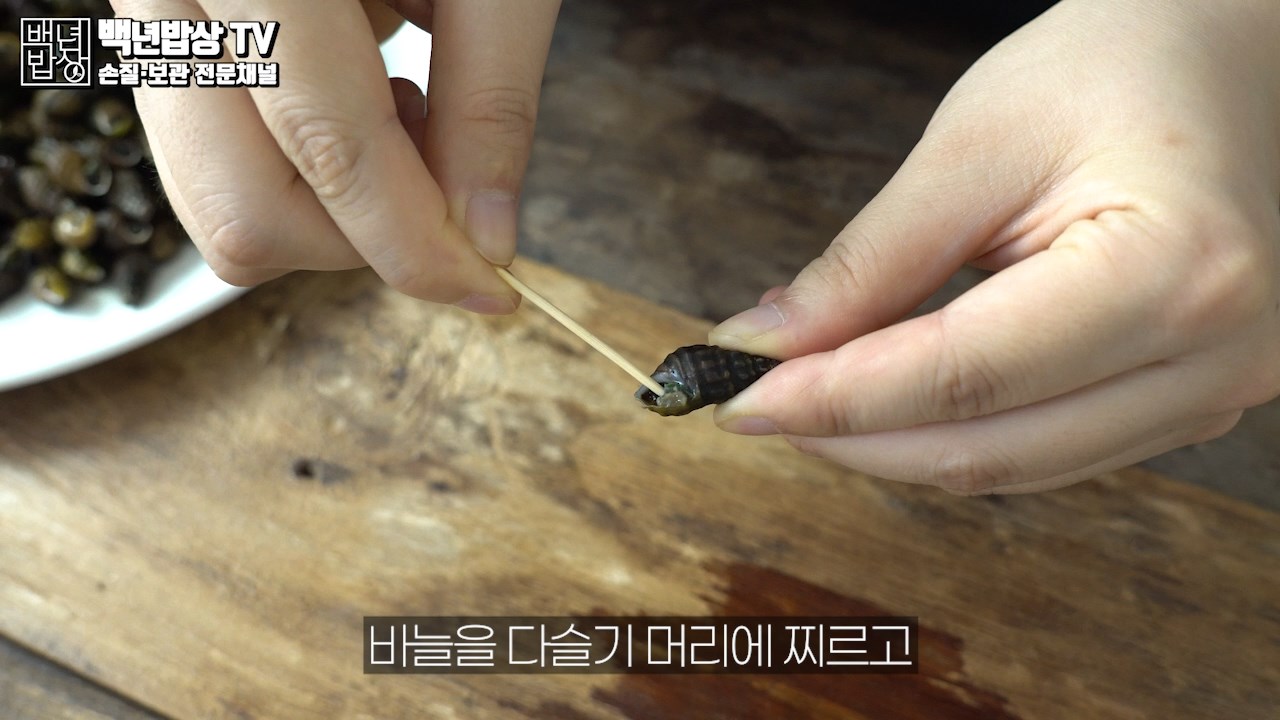 한 손에 바늘을 들고 다른 한손엔 다슬기를 눕혀 잡고 준비를 해줍니다. (바늘이 없어서 이쑤시개로 대체해서 사용 했어요^^)
