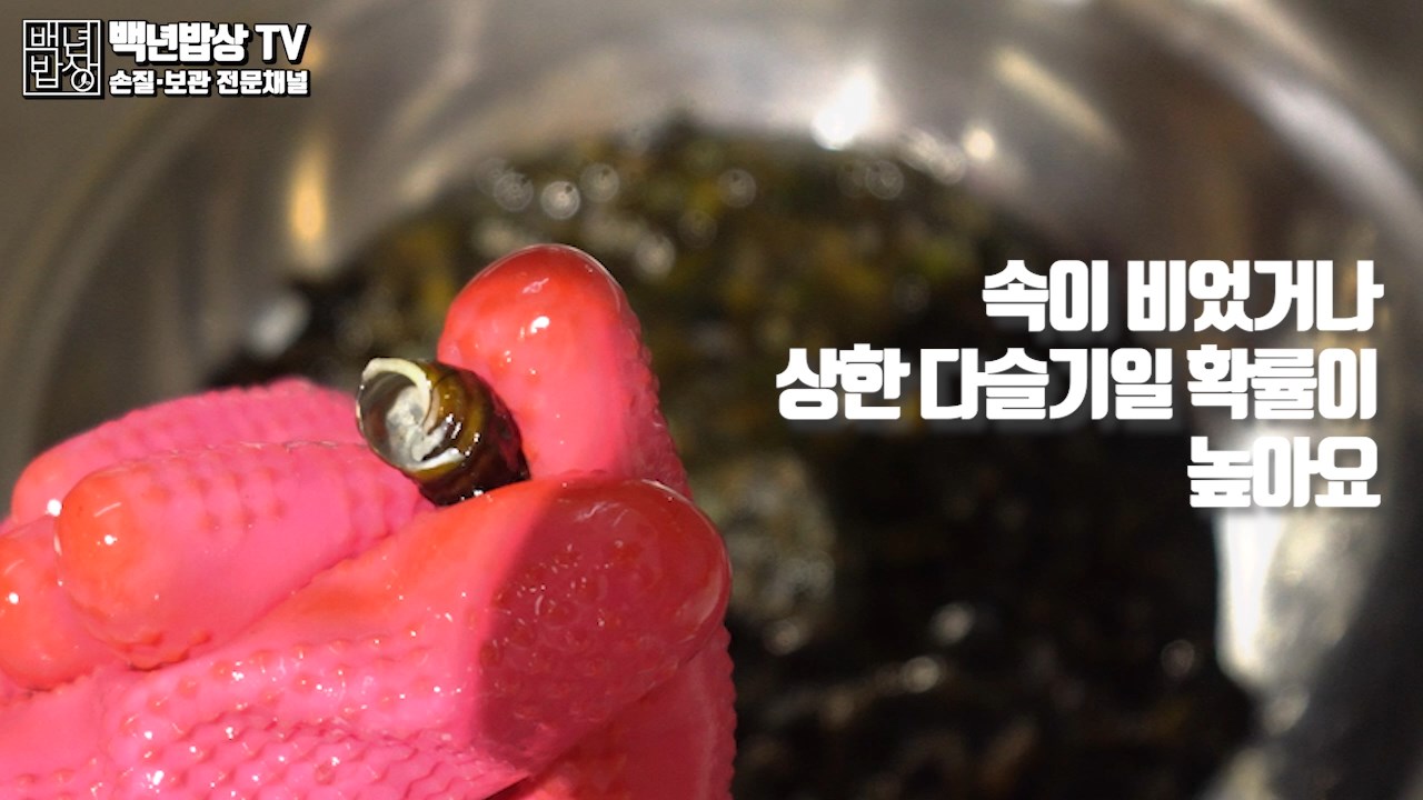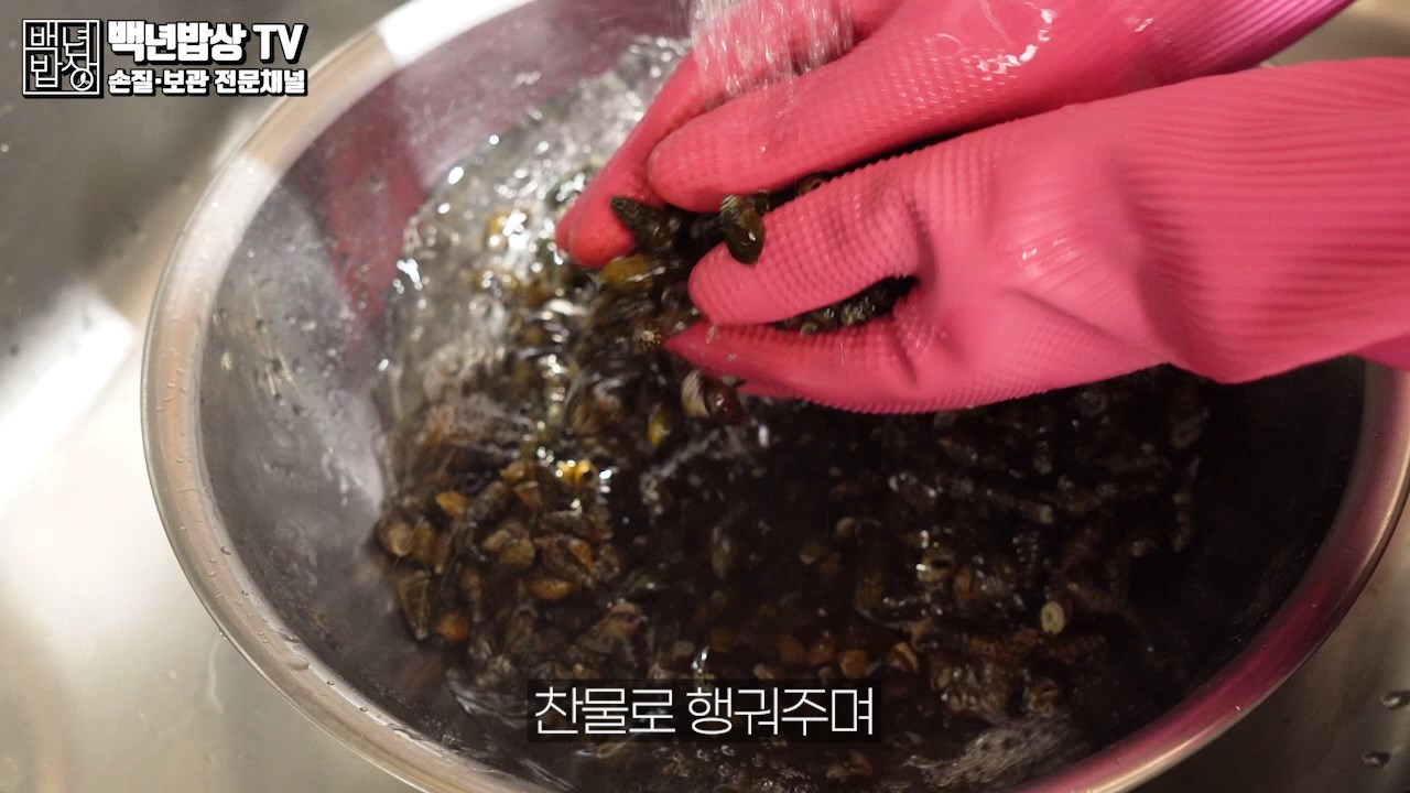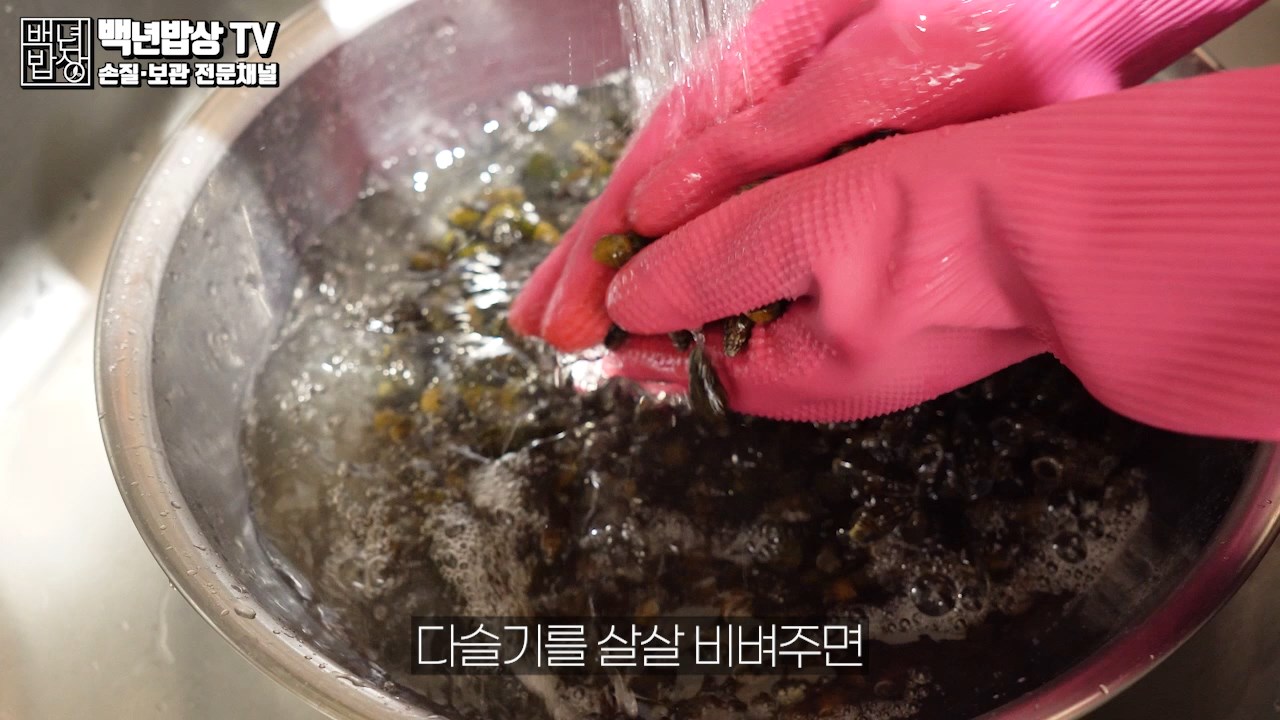 헹구는 과정에서 다슬기가 물에 둥둥 뜨거나 떴다가 가라앉는 다슬기는 골라 버려 주세요. (속이 비었거나 상한 다슬기일 확률이 높아요.)