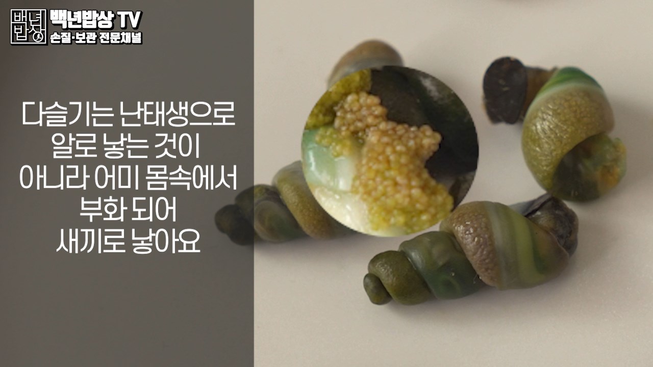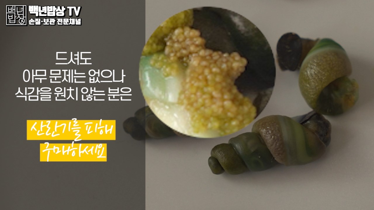 다슬기는 난태생으로 알로 낳는 것이 아니라 어미 몸속에서 부화 되어 새끼로 낳아요. 식감을 원치 않는 분은 산란기를 피해 구매하세요.