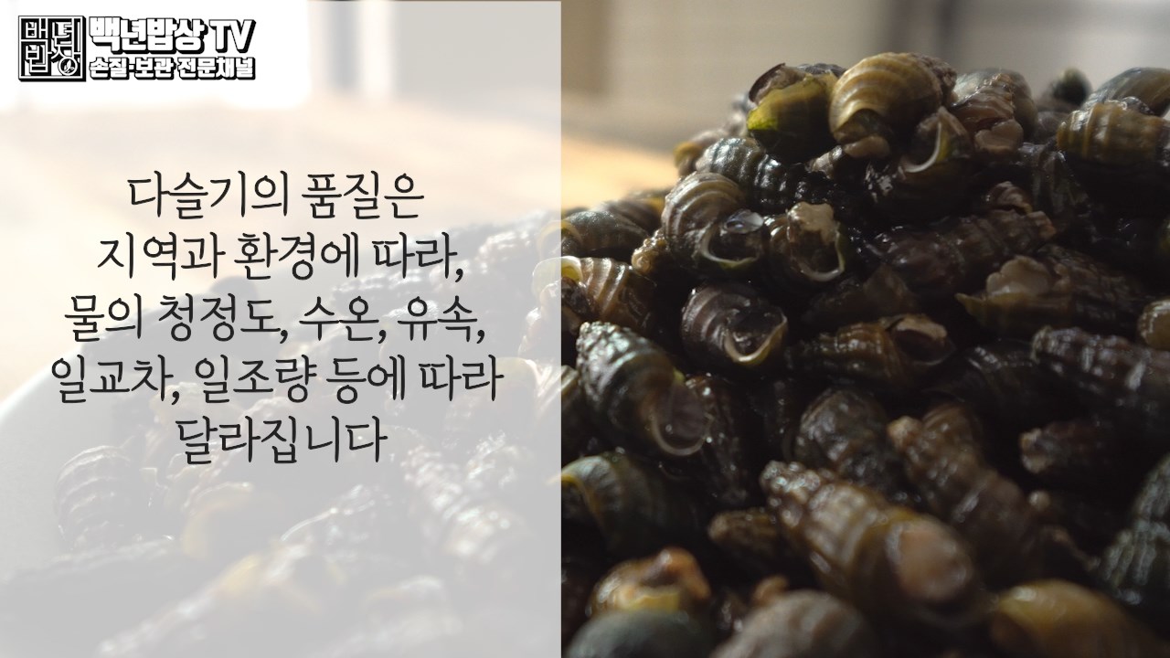 다슬기는 껍질이 깨지지 않고 표면이 깨끗하며 매끄럽고 길쭉한 것이 좋으며 비교적 알이 작은 것일수록 품질이 좋은 다슬기예요. (다슬기의 품질은 지역과 환경에 따라, 물의 청정도, 수온, 유속, 일교차, 일조량 등에 따라 달라집니다.)