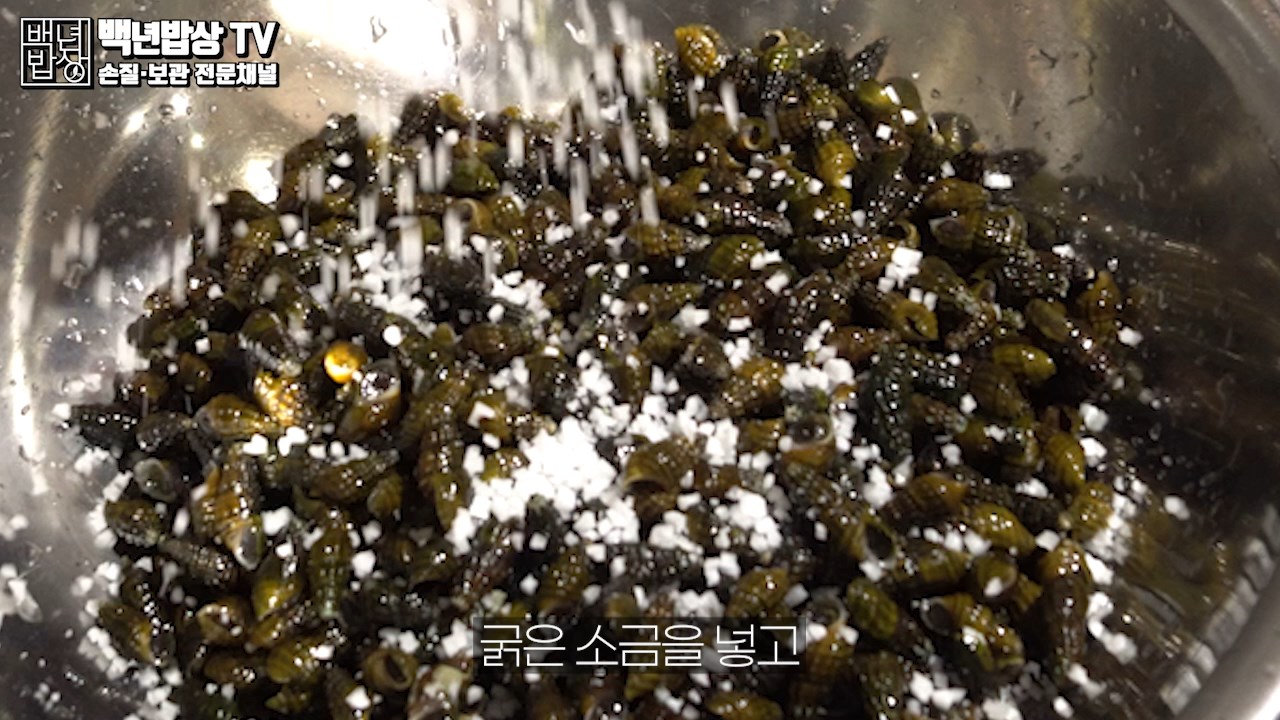 볼에 다슬기가 잠길 만큼 수돗물을 부어 3시간 정도 해감을 시켜 주세요. 해감을 시킨 후에 굵은 소금을 넣고 한 번 더 박박 문질러 헹궈 줍니다. (굵은 소금을 넣으면 비린내도 줄여 줍니다.)