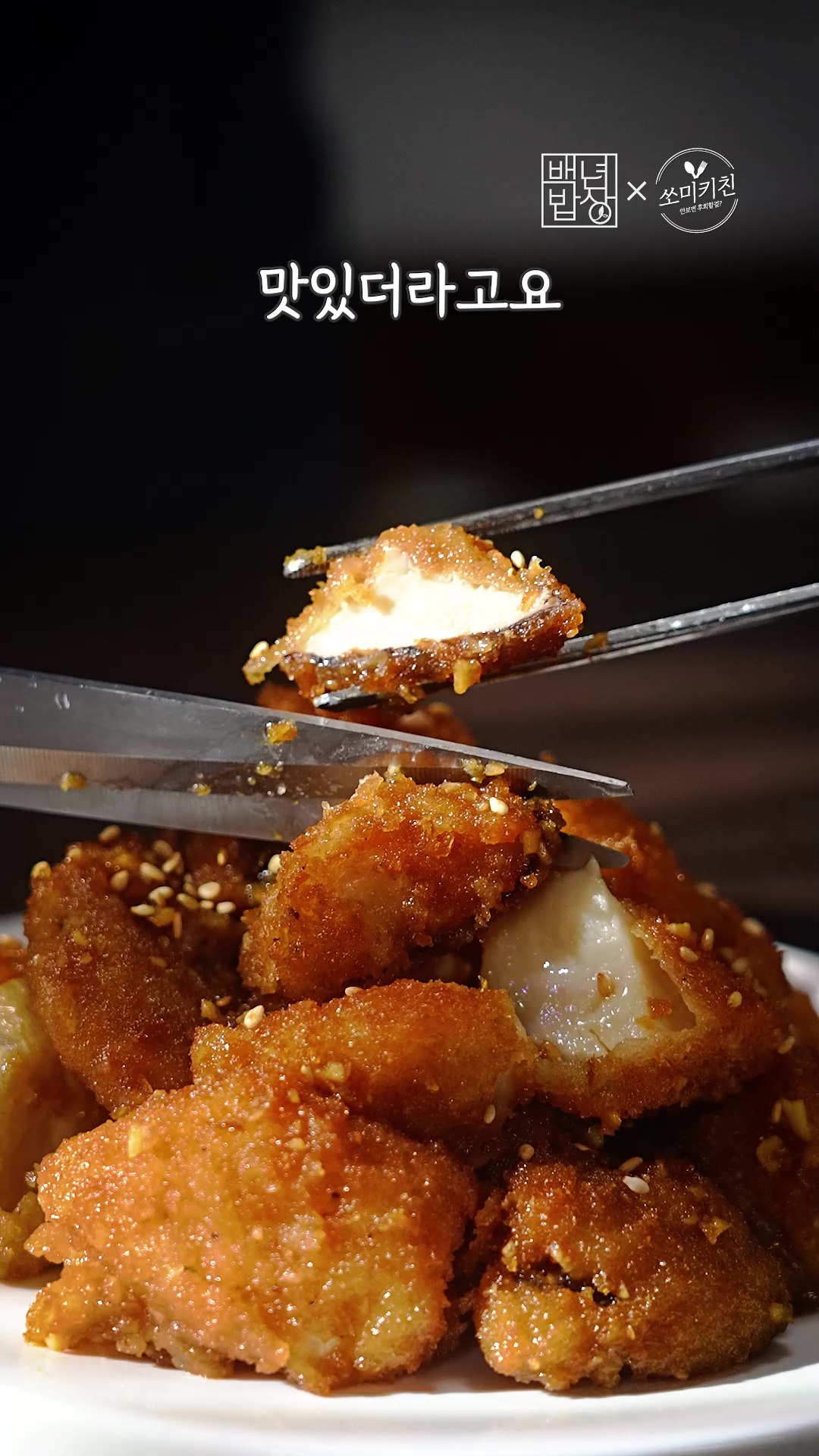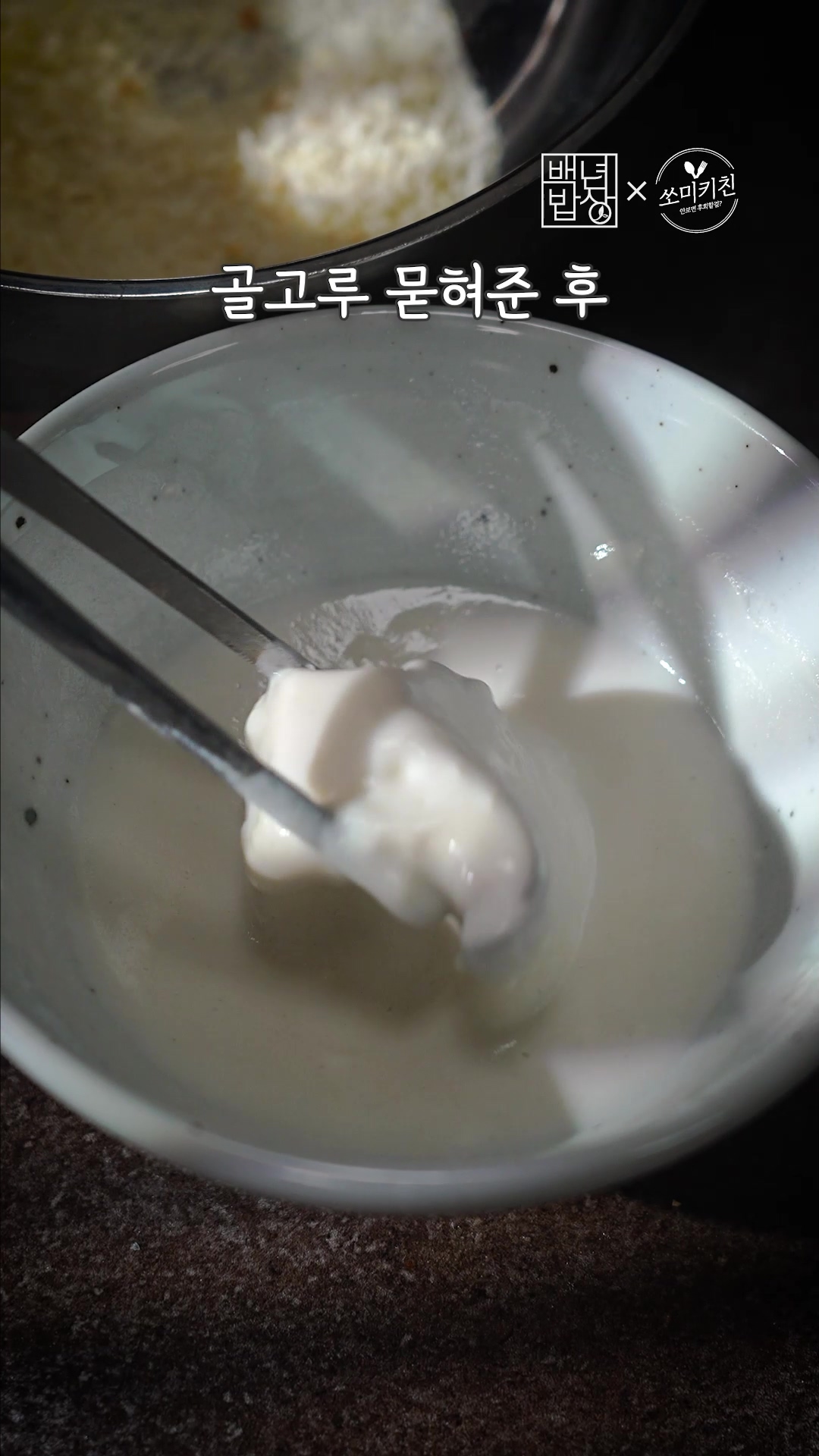 3. 물에 찹쌀가루 넣어 튀김반죽을 골고루 묻혀준 후, 빵가루를 입혀 기름에 바삭하게 튀겨줄게요.