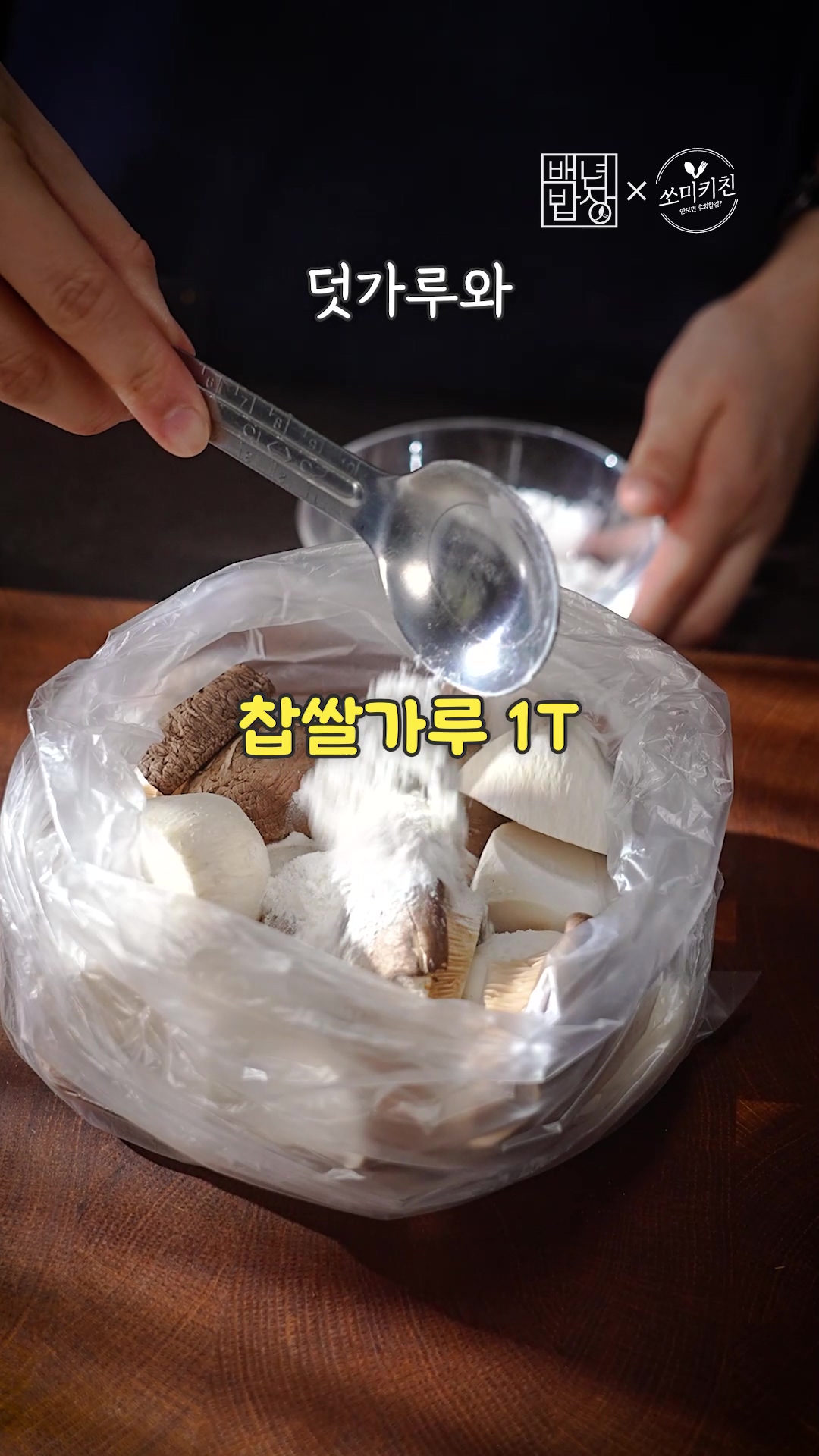 2. 비닐에 버섯을 넣고 덧가루(찹쌀가루)와 소금을 뿌려 흔들어주세요.
