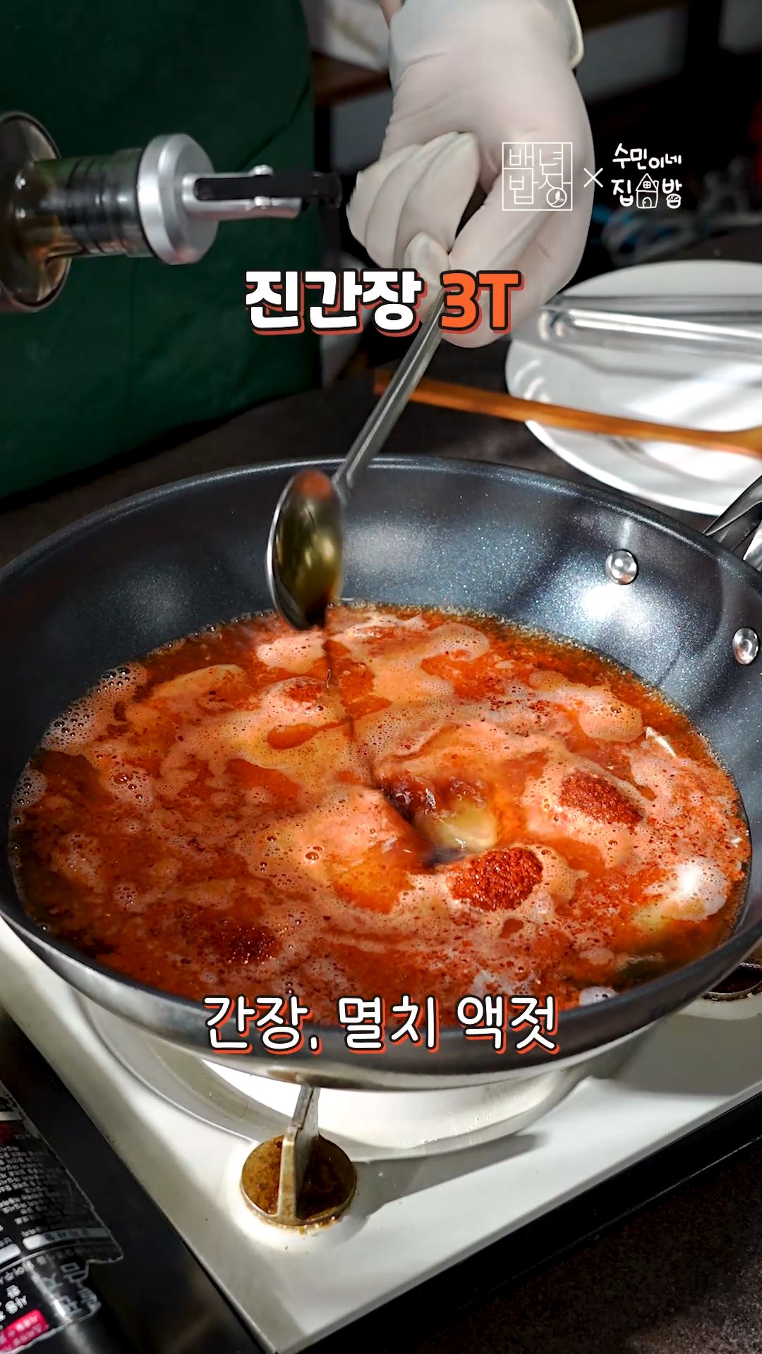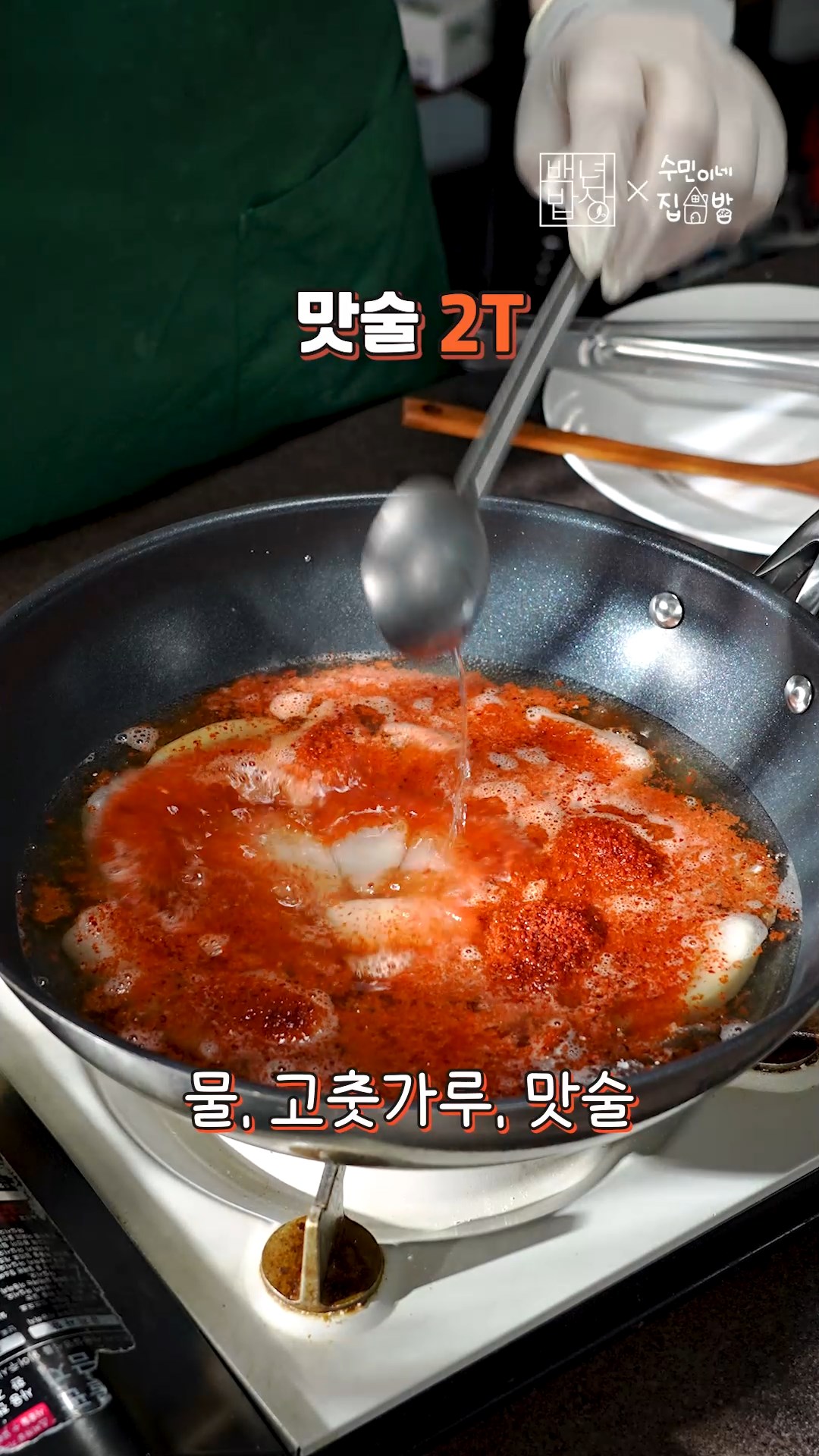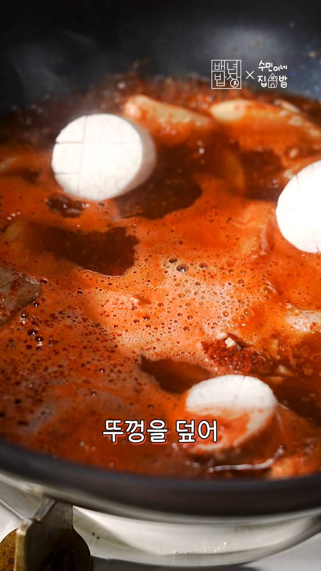 5. 물, 고춧가루, 맛술, 간장, 멸치액젓, 다진마늘, 버섯을 넣고 뚜껑을 덮어 푹 끓여주세요.