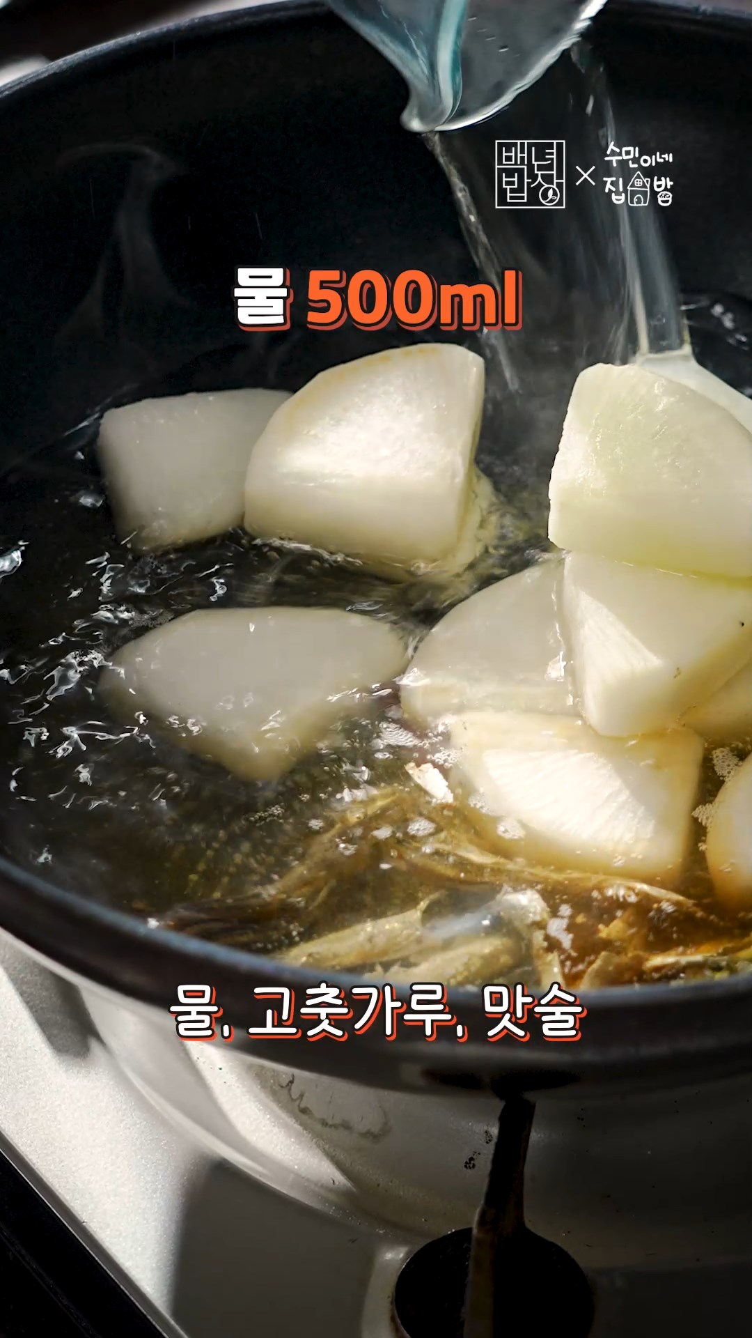 4. 팬에 약불로 무를 구워주고 멸치를 넣어 멸치의 수분을 날려 비린내를 제거해 주세요.