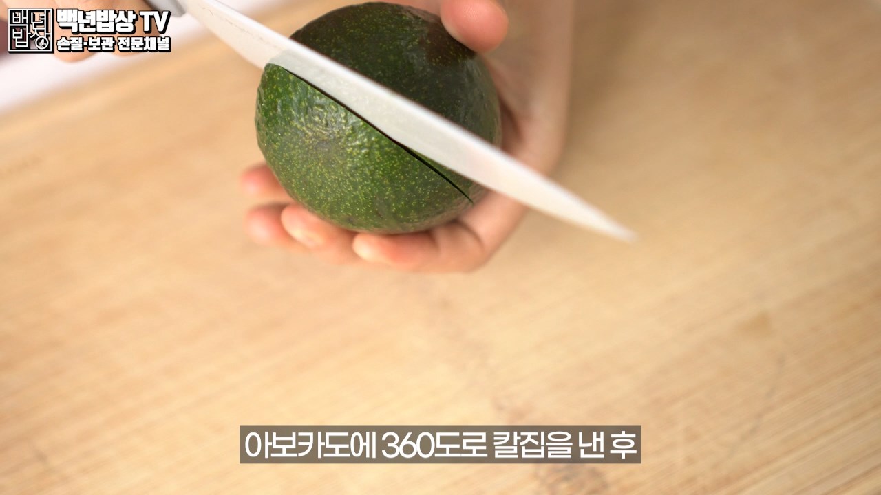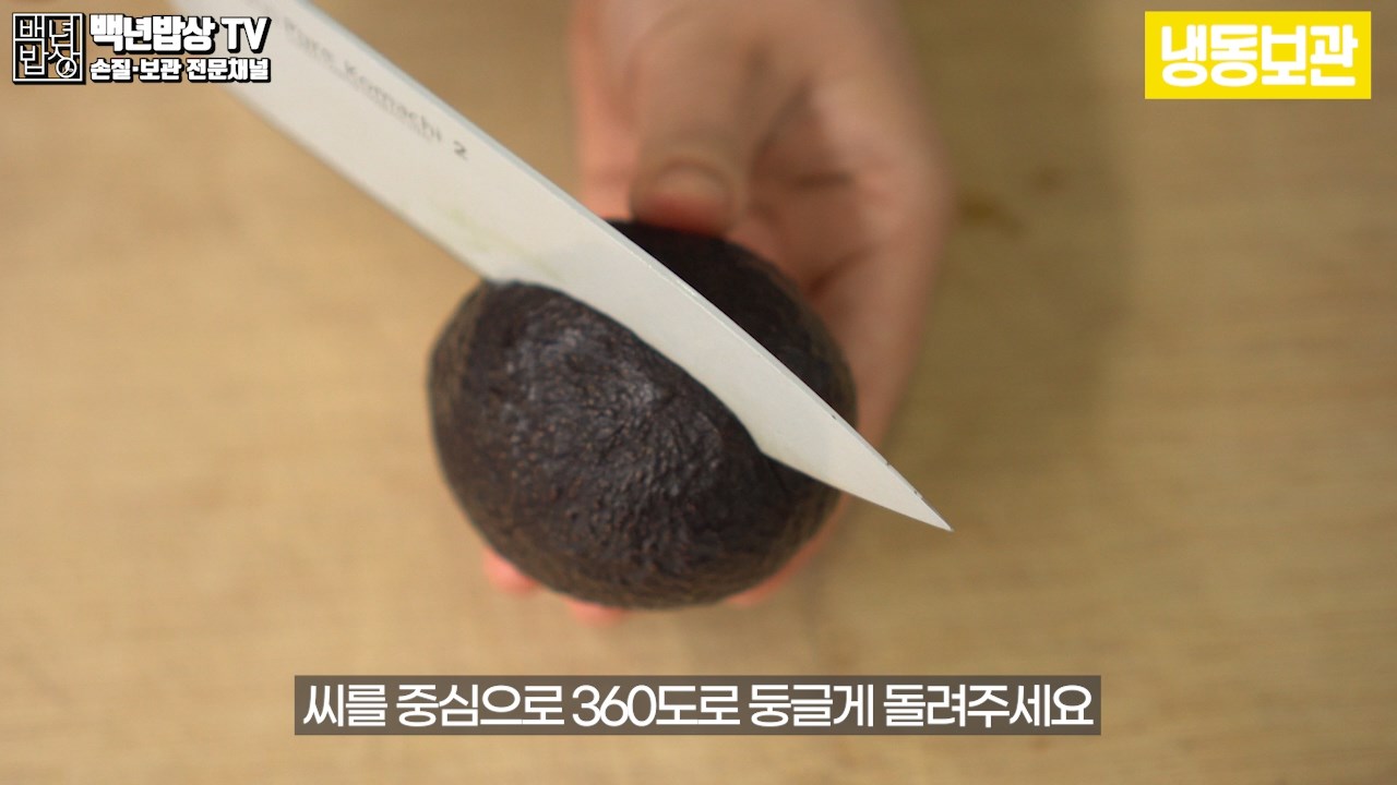 씨앗에 닿도록 세로 방향으로 칼집을 넣고, 씨를 중심으로 360도로 둥글게 돌려주세요. 양손으로 아보카도를 잡고 반대로 살짝 비틀면 반으로 분리됩니다.