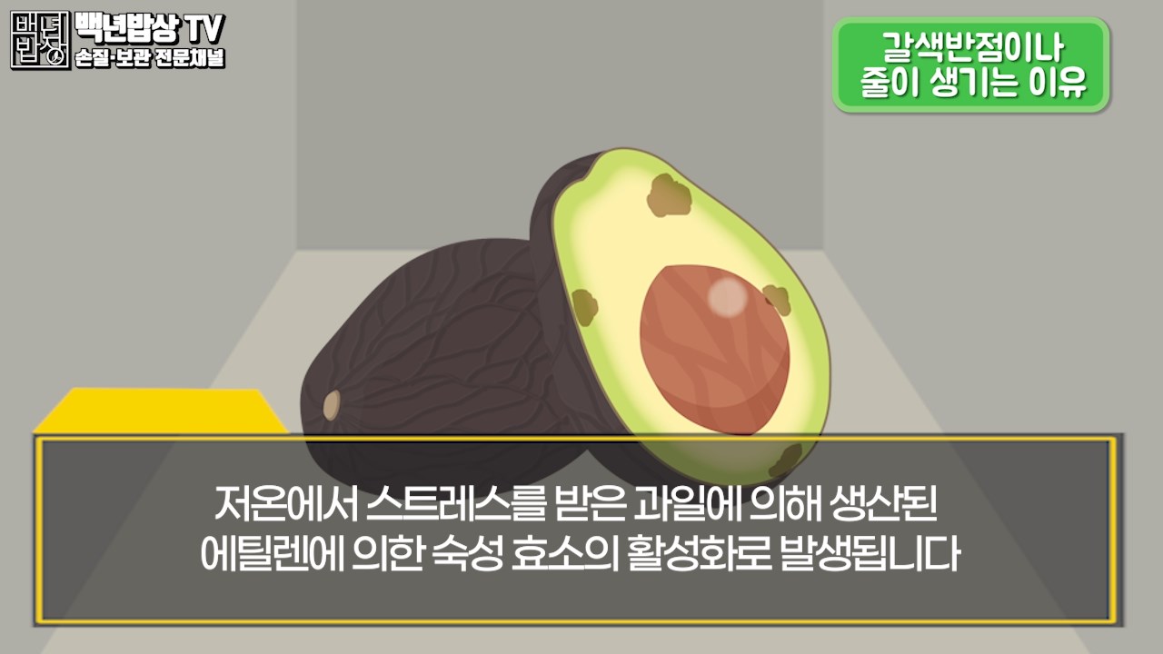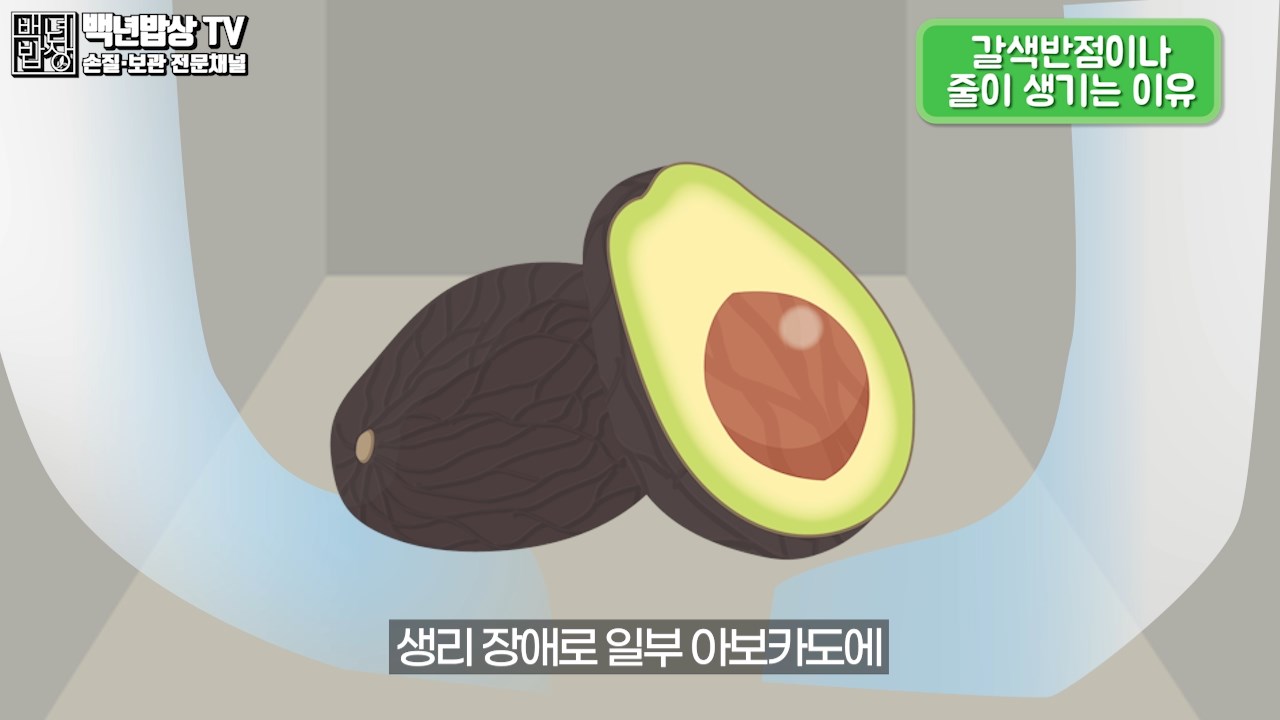갈색 반점이나 줄이 생기는 이유? 수확 후 유통과정에서 아보카도 내부에 냉기 상해를 입어 일어나는 생리 장애로 일부 아보카도에 갈색 반점이나 곳곳에 심지가 생길 수 있어요. (저온에서 스트레스를 받은 과일에 의해 생산된 에틸렌에 의한 숙성 효소의 활성화로 발생)
