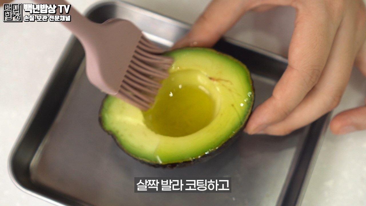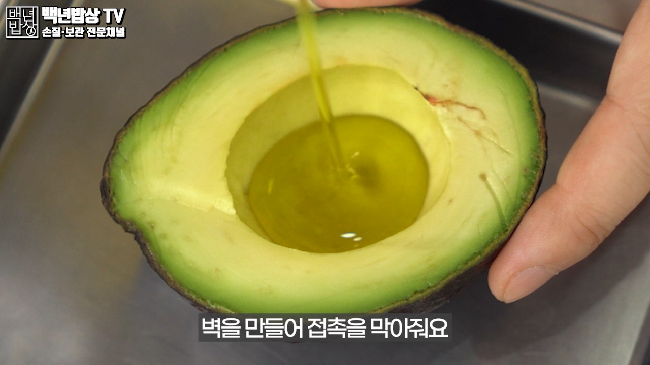 아보카도에 올리브오일을 살짝 발라 코팅하고 밀폐 용기에 아래를 향하도록 넣어 보관하세요. 올리브 오일은 아보카도와 공기 사이에 벽을 만들어 접촉을 막아줘요.