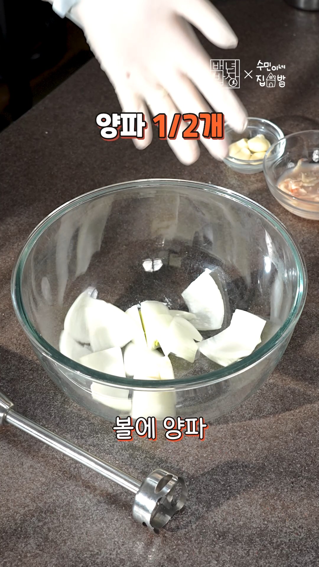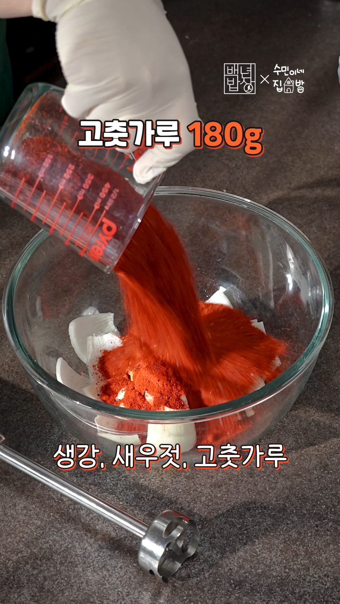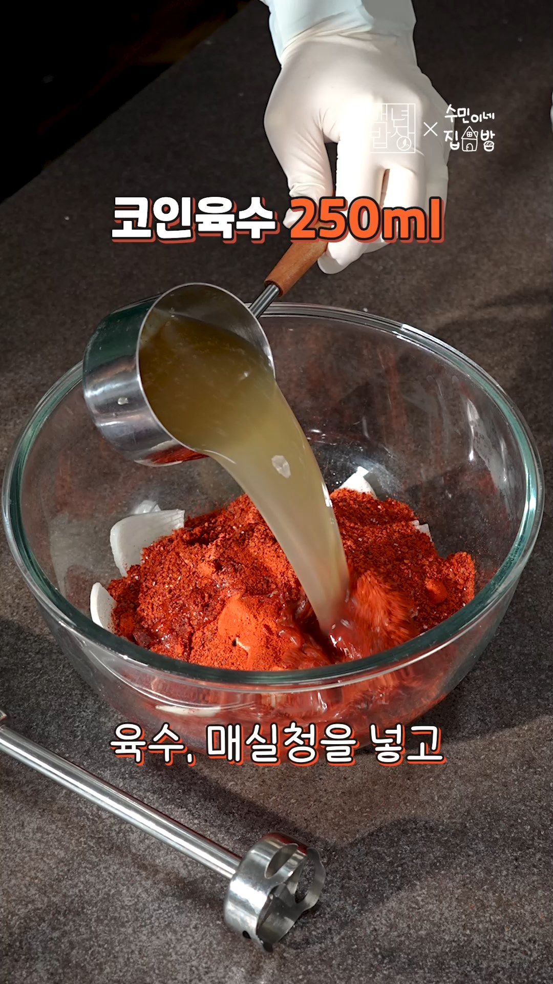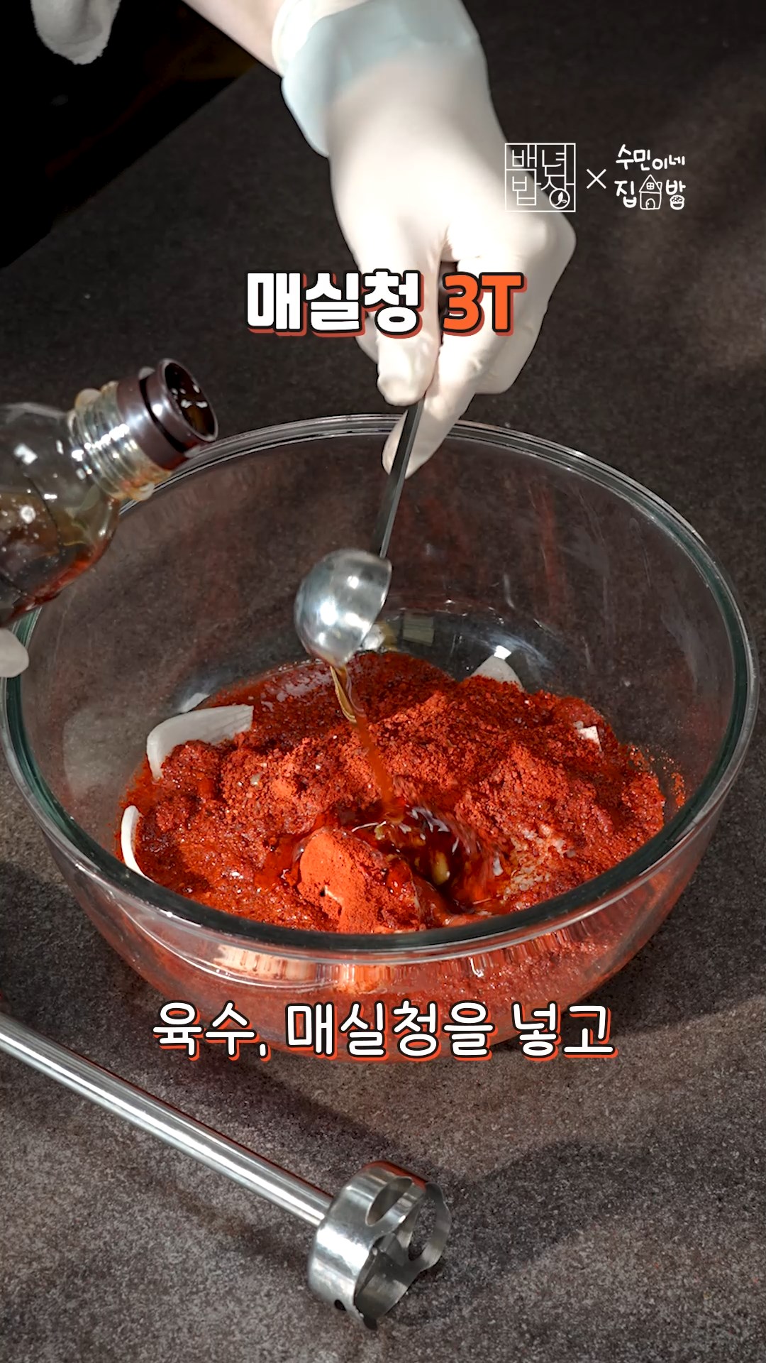 2. 양파, 밥, 마늘, 생강, 새우젓, 고춧가루, 육수, 매실청을 넣고 갈아 양념을 만들어 주세요.