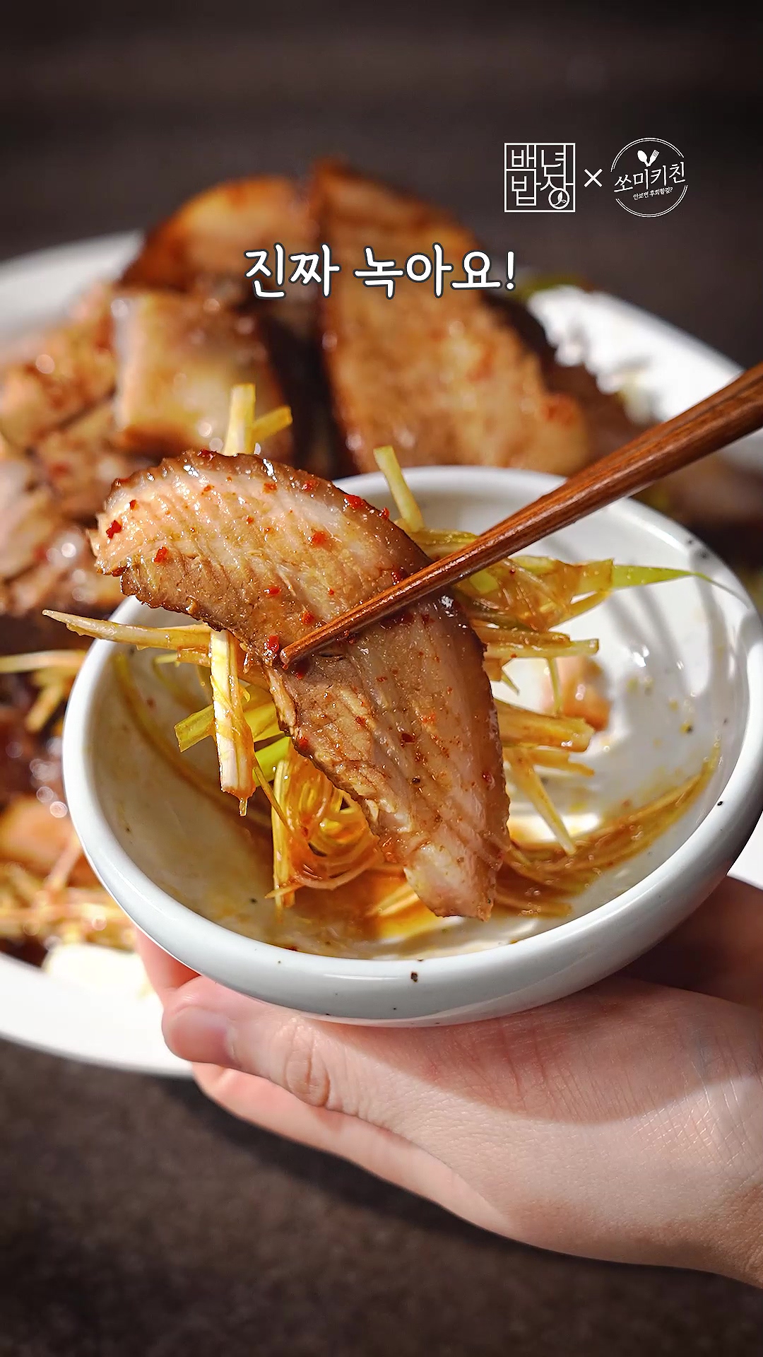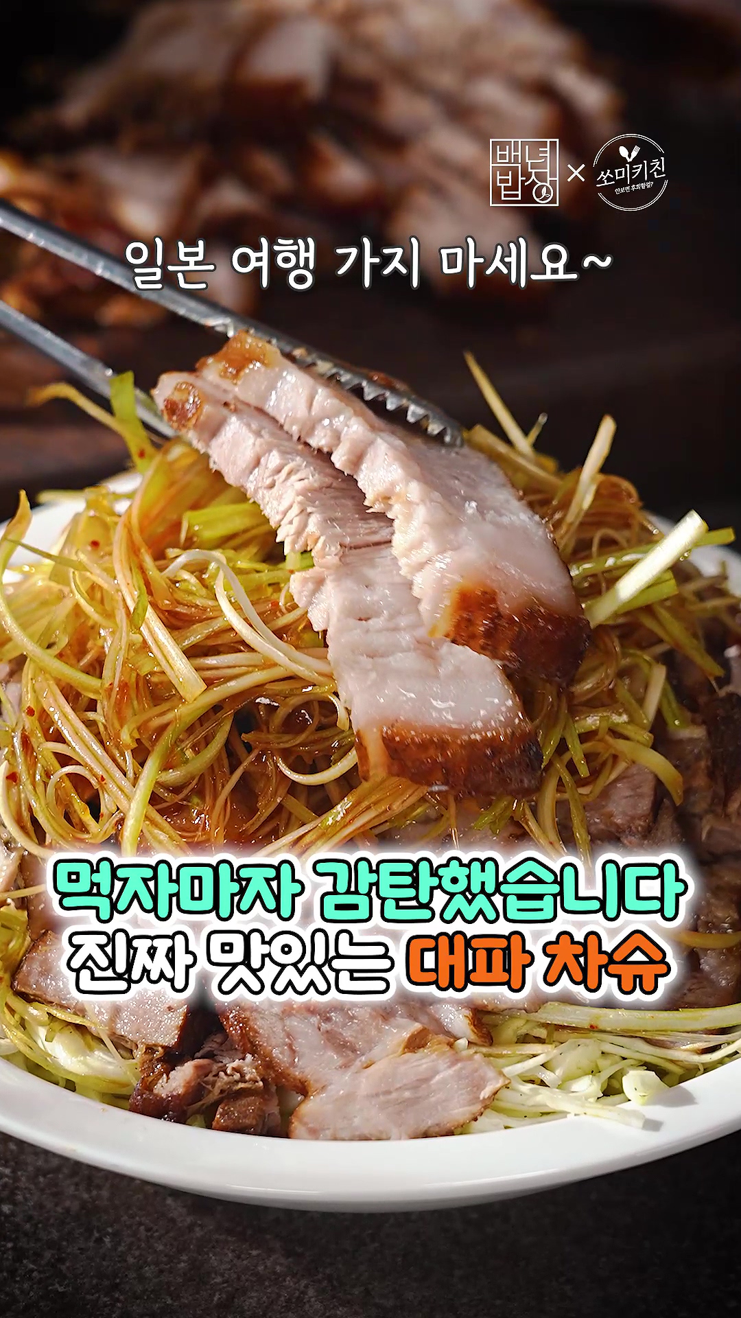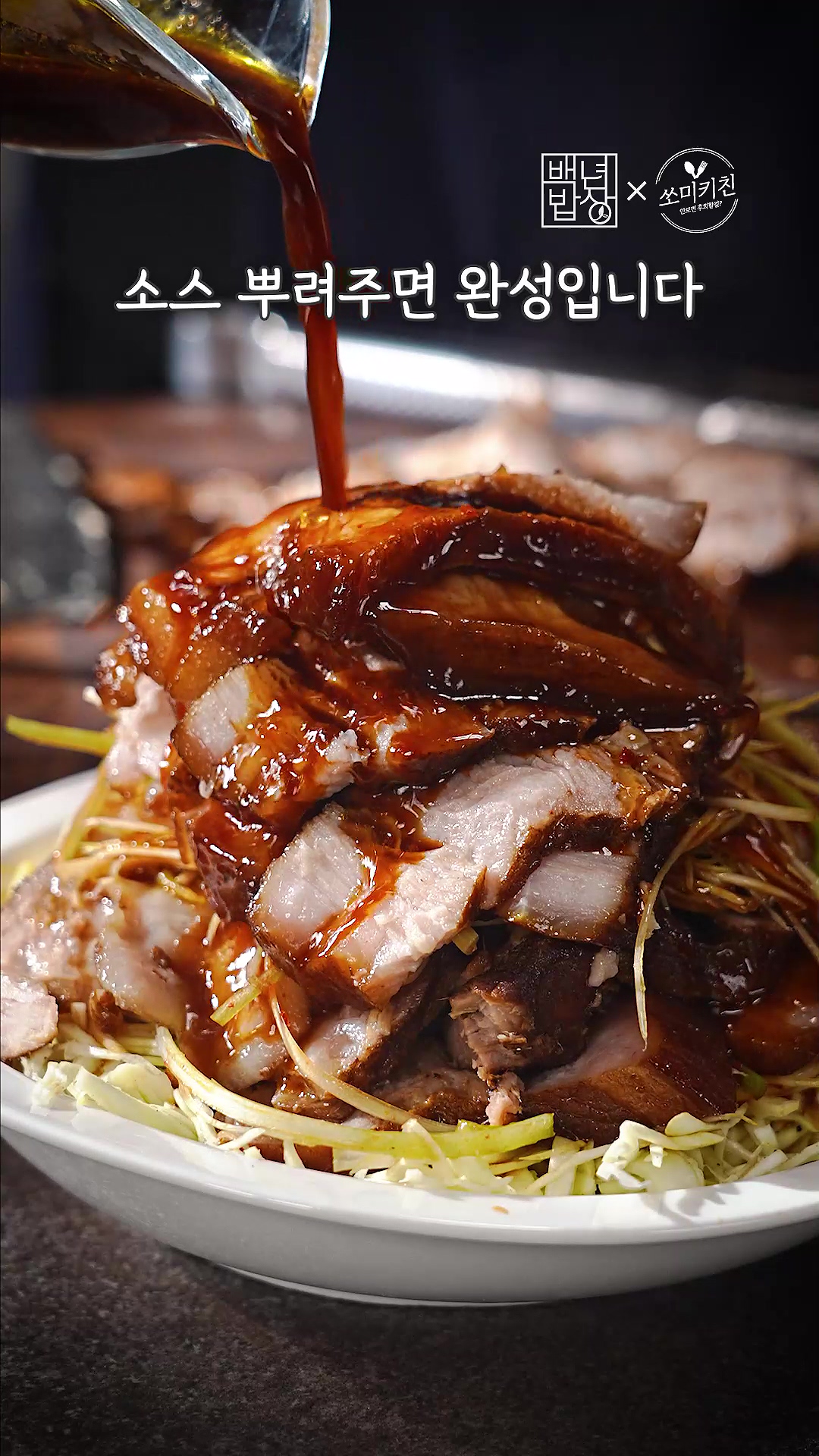 9. 접시에 양배추 절임, 파채, 차슈, 파채, 차슈를 쌓고 소스 뿌려주면 완성!