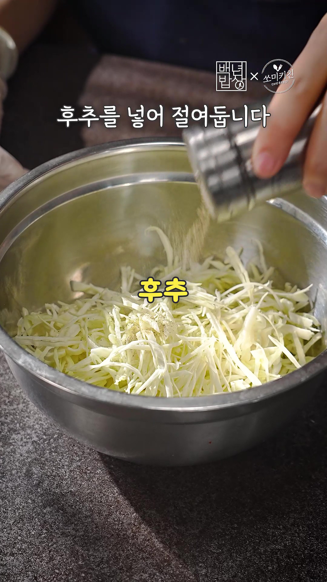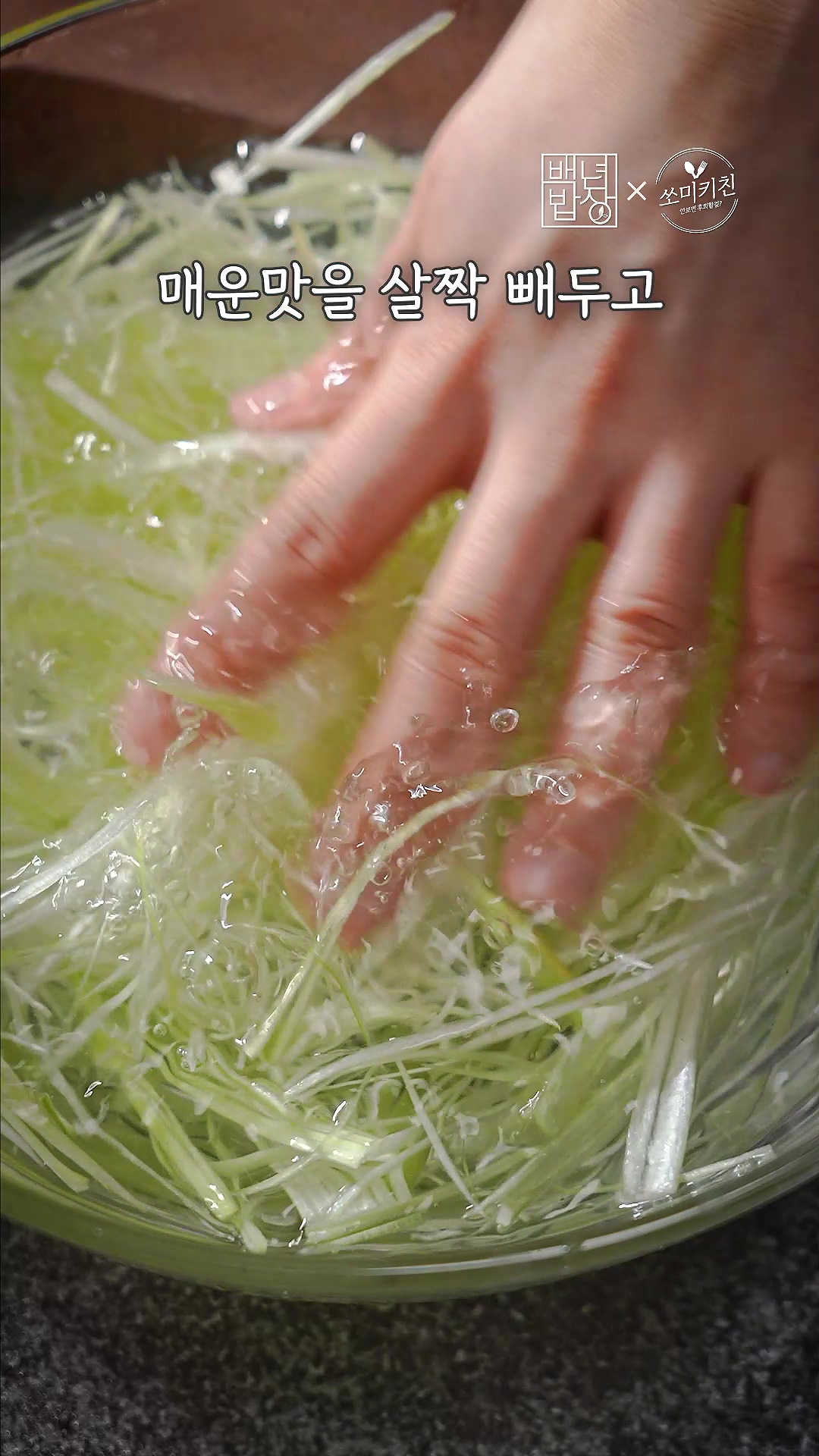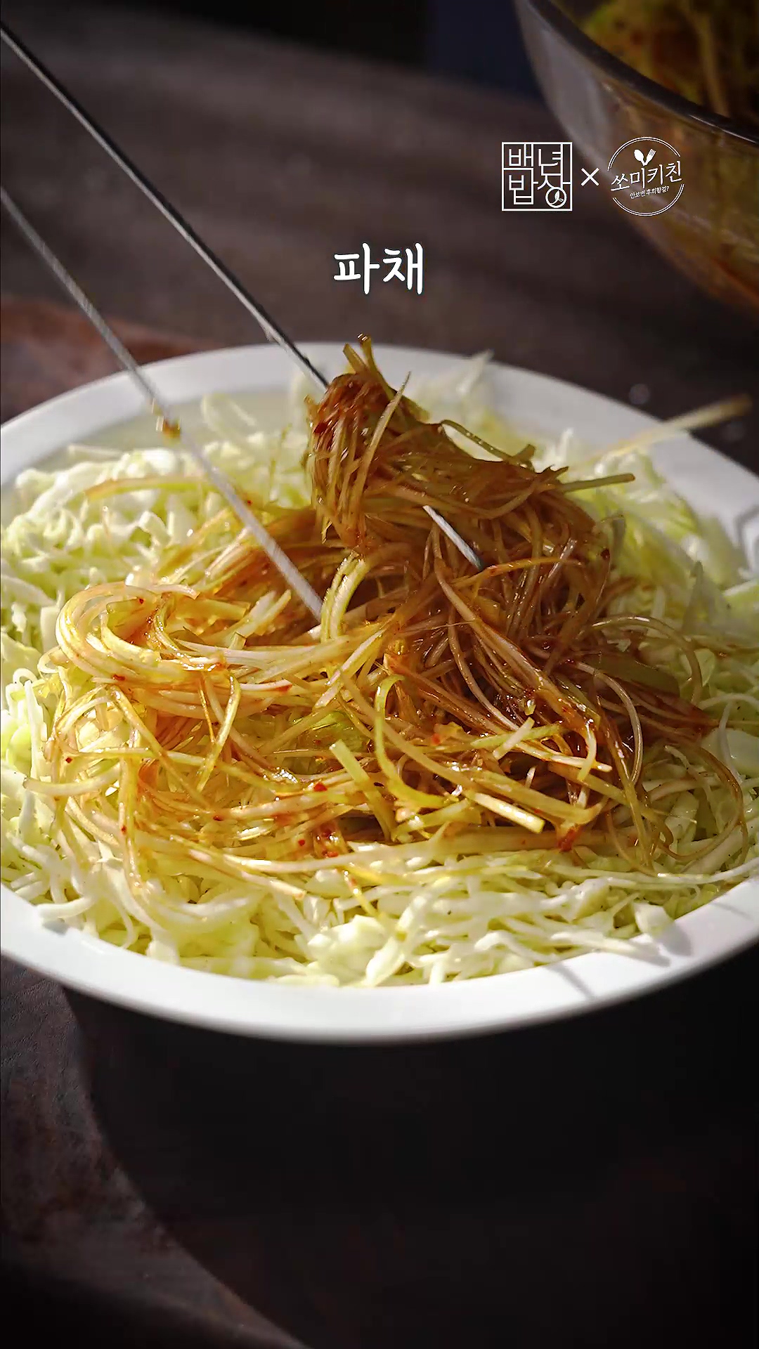 6. 대파는 채 썰어 물에 담가 매운맛을 빼주고, 양배추도 채 썰어 소금, 식초, 후추를 넣어 절여주세요.