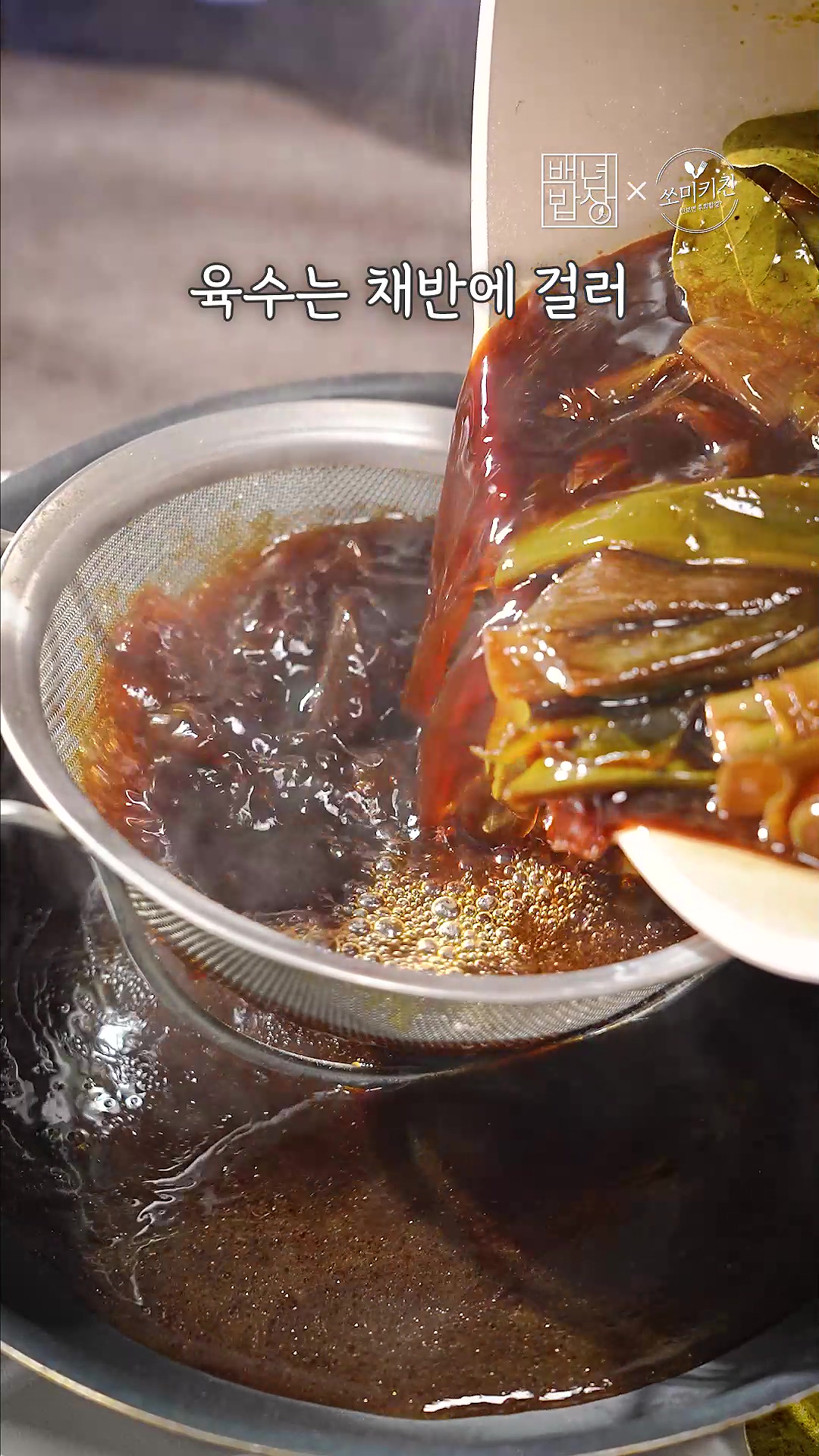 8. 육수는 채반에 걸러 황설탕, 고춧가루를 추가해 한 번 더 끓여주세요.