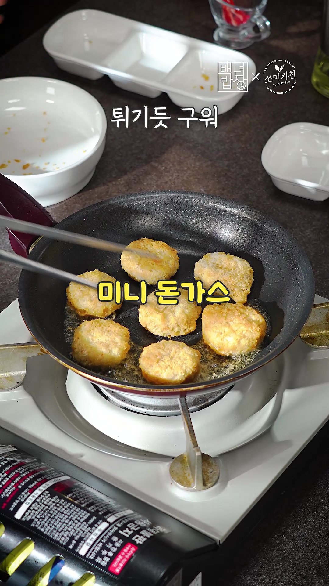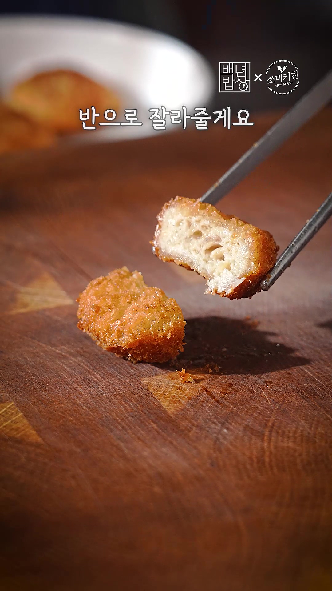 3. 귀여운 미니 돈까스도 튀기듯 구워 반으로 잘라줄게요.