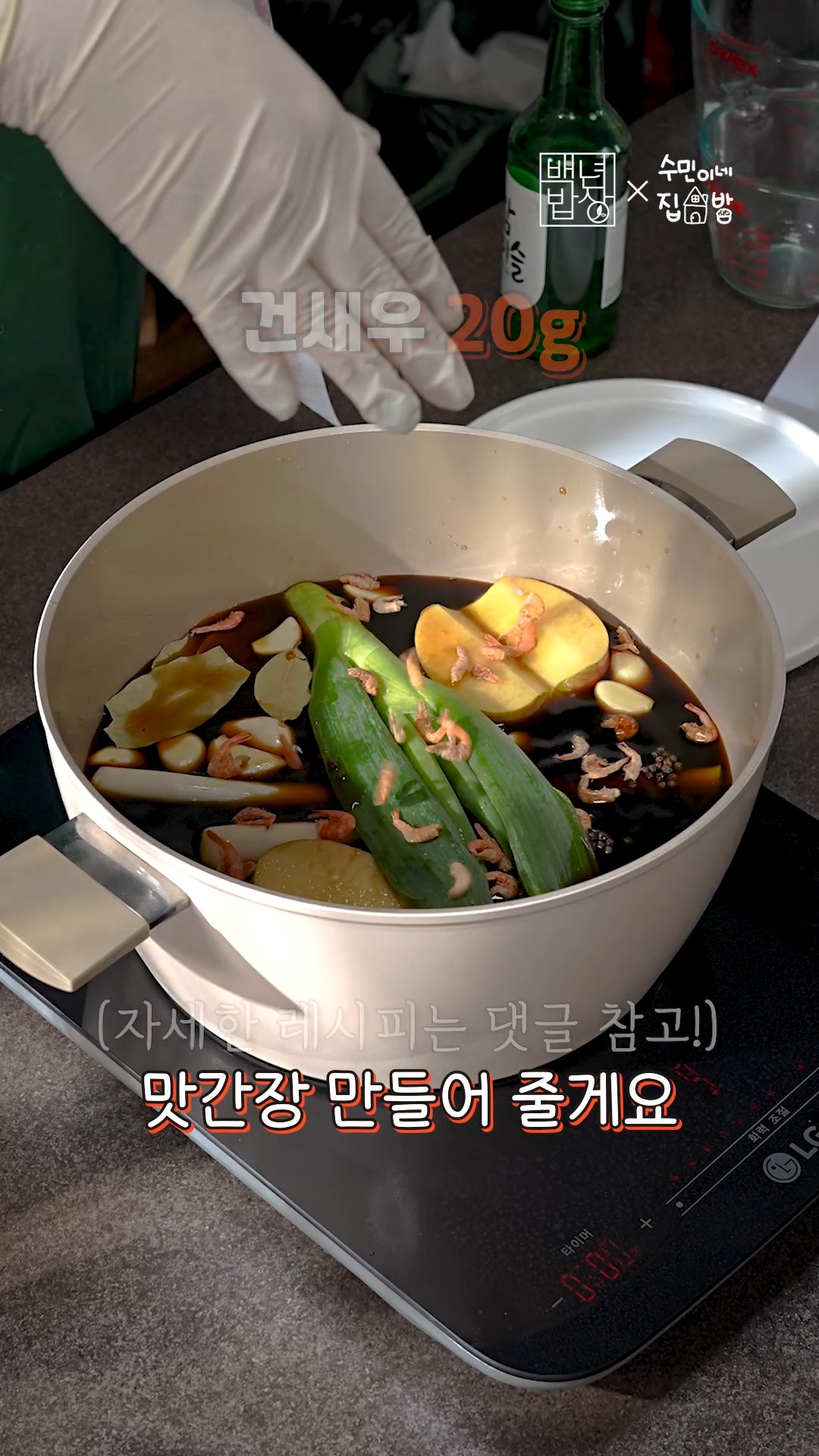 2. 진간장, 홍게간장, 물, 맛술, 설탕, 마늘, 대파, 건새우, 사과, 월계수잎, 통후추를 넣고 맛간장을 만들어주세요.