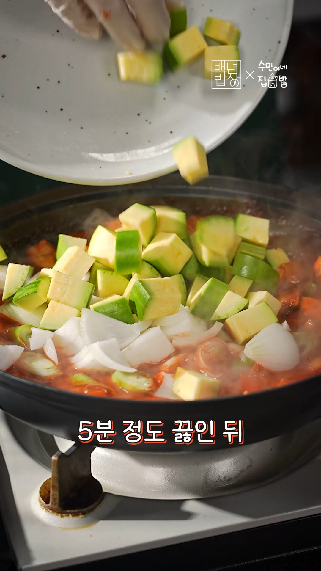 5. 국물이 걸쭉해지면 애호박, 양파, 대파를 넣고 5분간 끓여주세요.