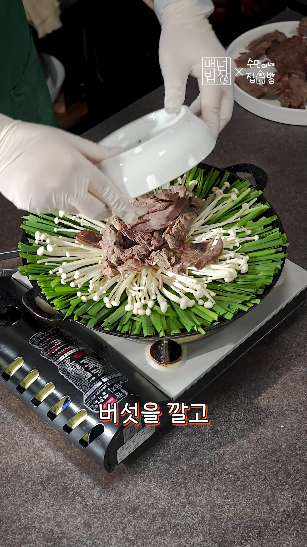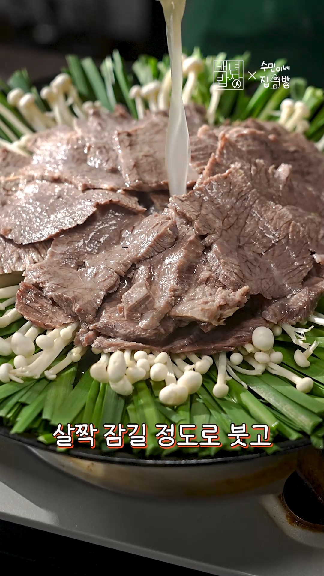 6. 얕은 냄비에 채소를 둘러주고 고기는 얇게 저며주세요.
