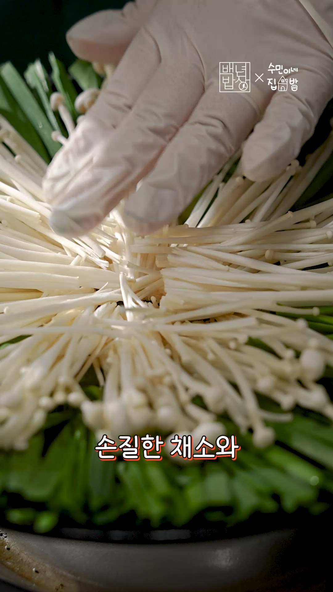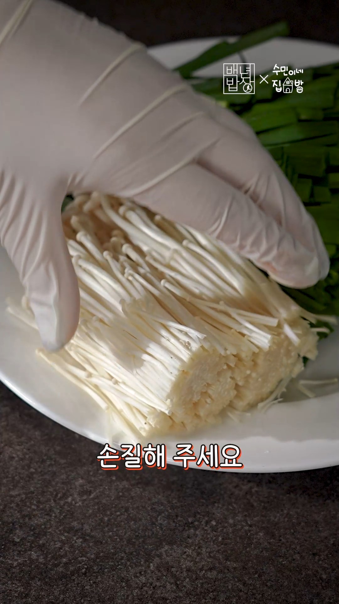 3. 그 동안 부추는 길게 자르고 팽이버섯도 밑동을 자르고 손으로 찢어주세요.