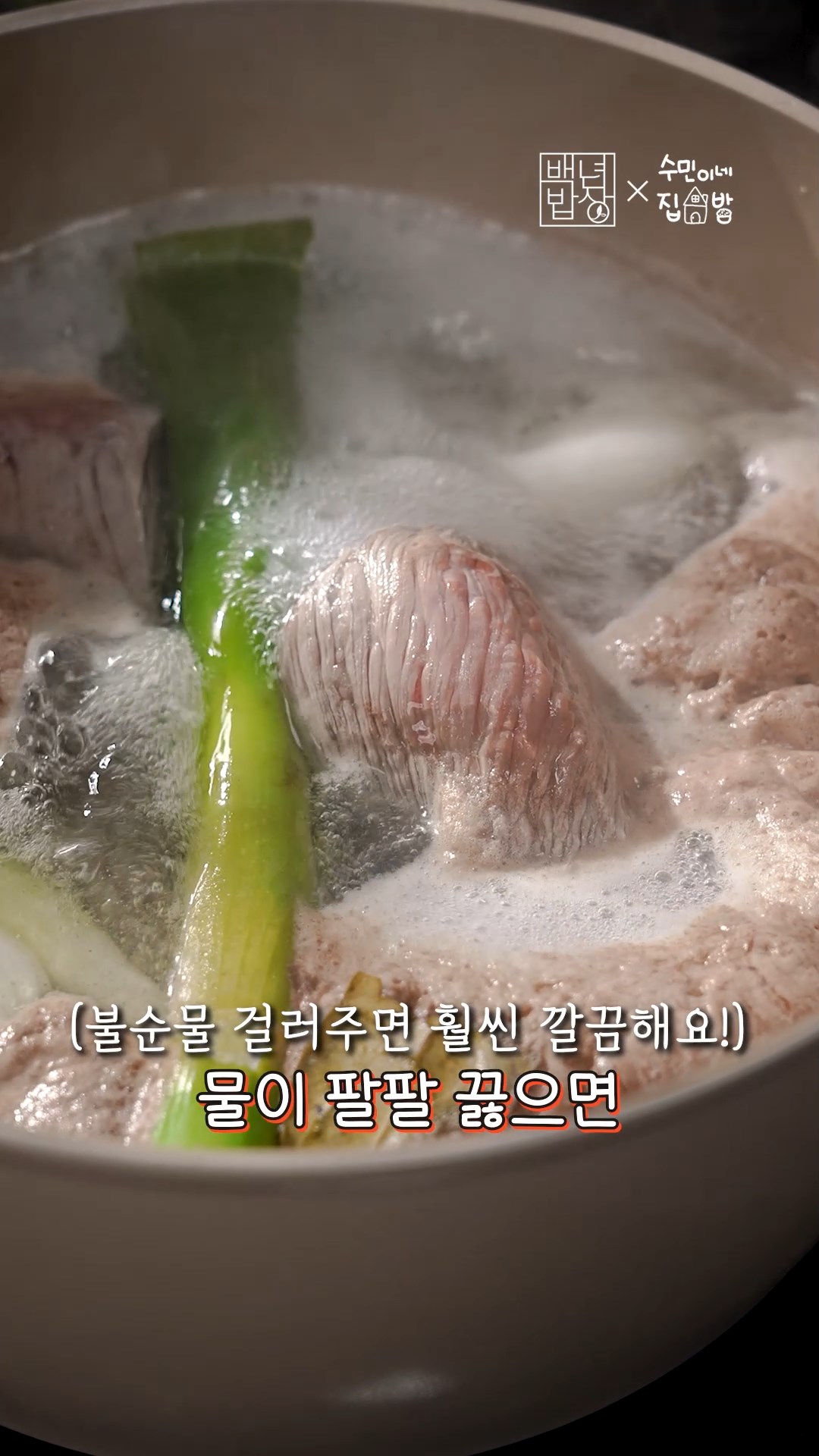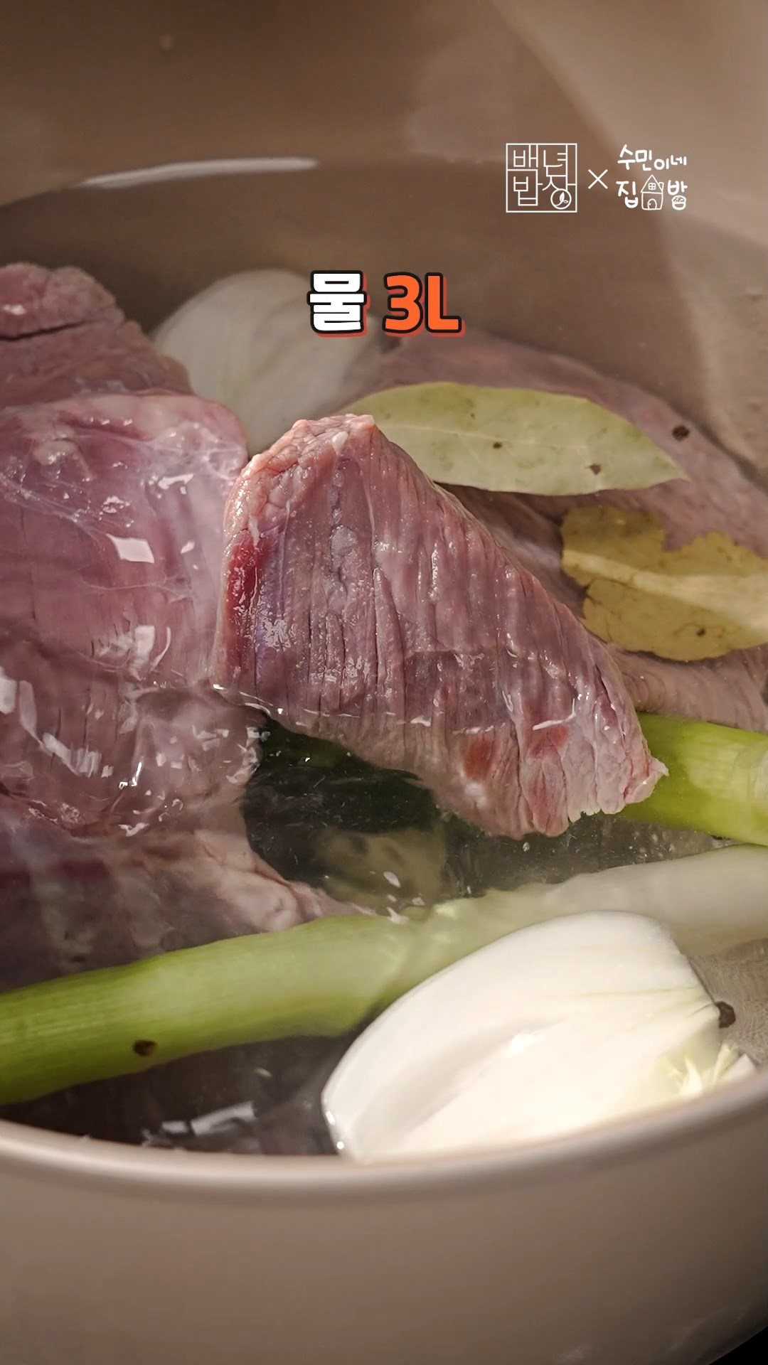 2. 냄비에 물, 통마늘, 대파, 양파, 통후추, 월계수잎, 양지를 넣어 1시간 30분정도 삶아주세요.