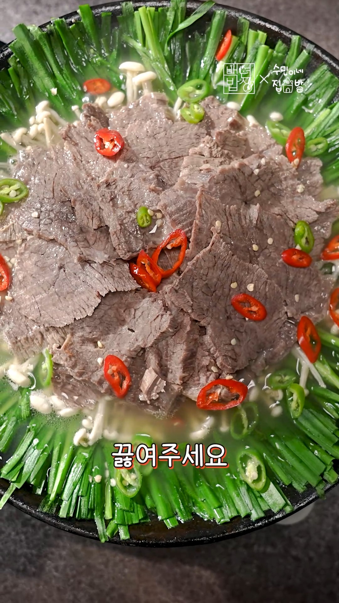 7. 고기도 채소에 맞춰서 동그랗게 둘러주고 육수를 채소가 살짝 잠길만큼만 부어 끓여주세요.