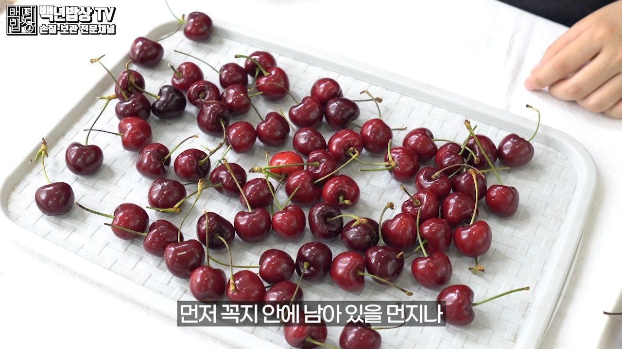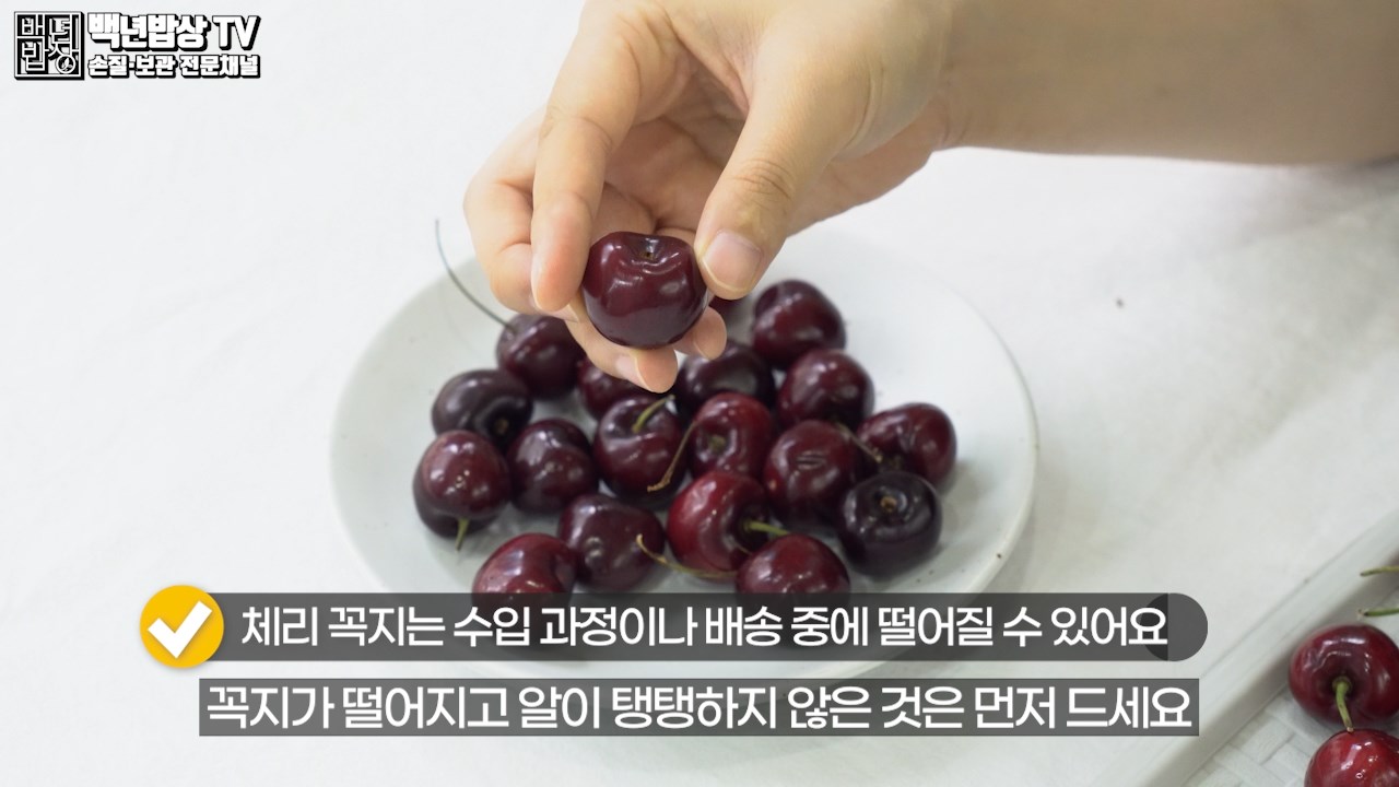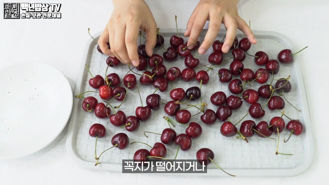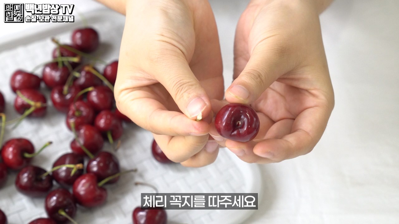 먼저 꼭지 안에 남아 있을 먼지나 노폐물을 깨끗이 세척하기 위해 체리 꼭지를 따주세요.
