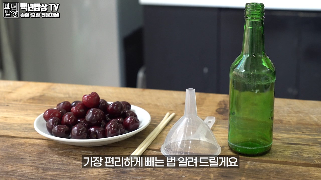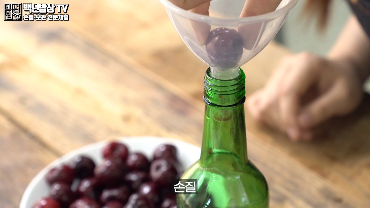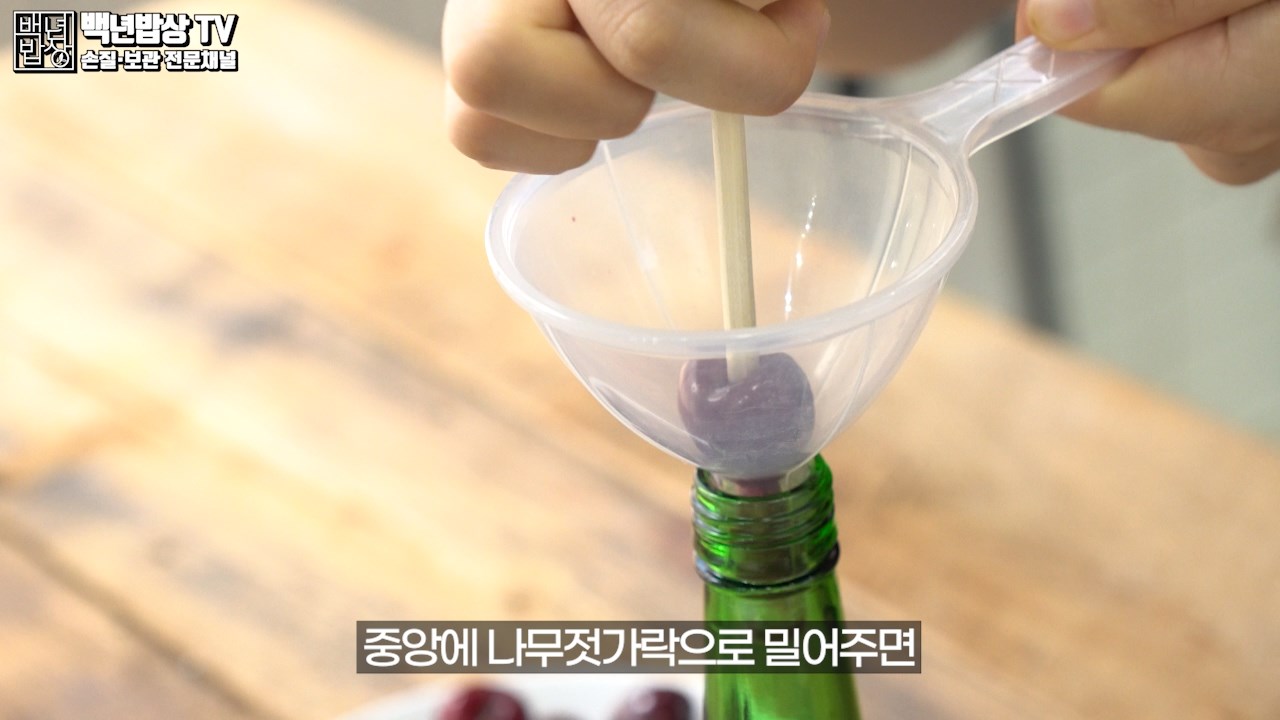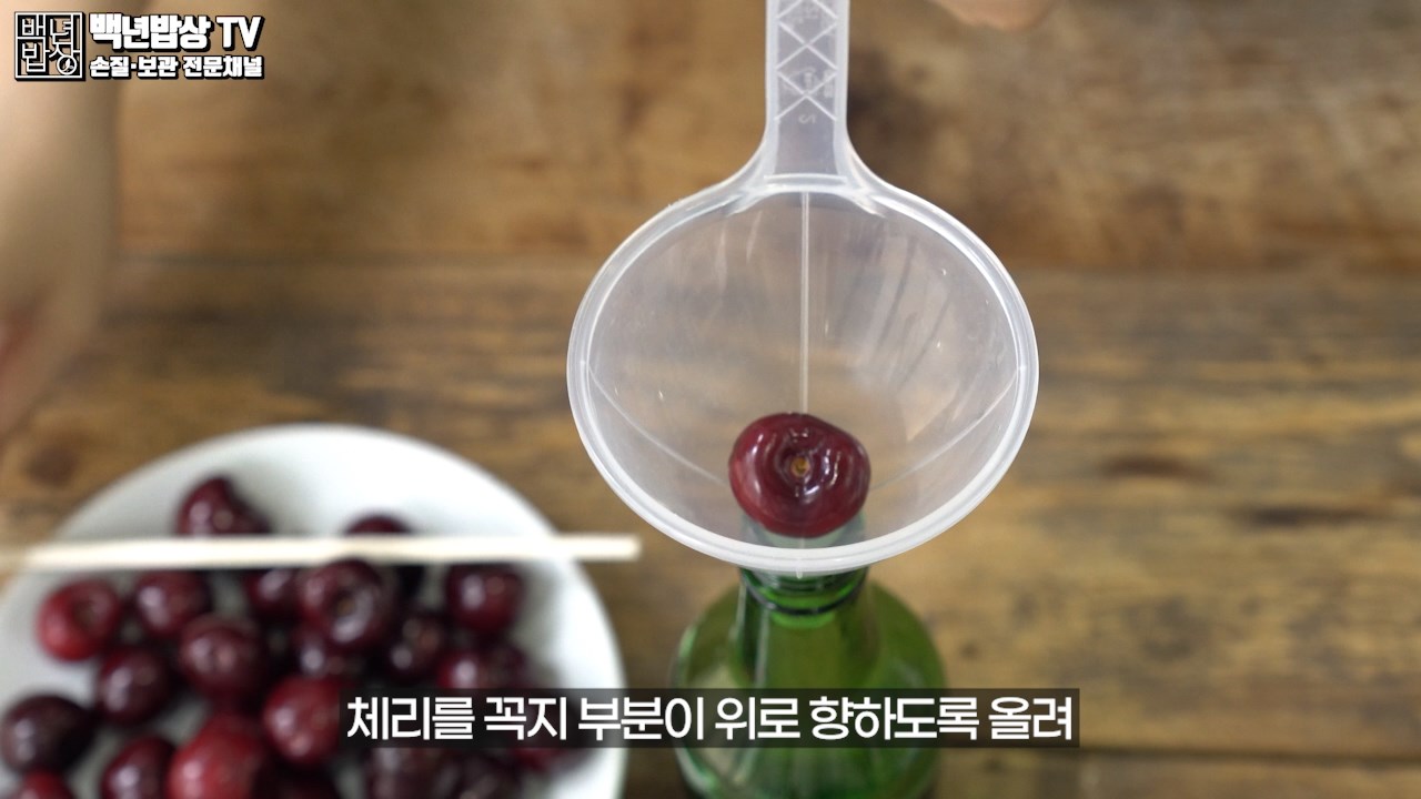 먼저 유리병을 준비하고 깔때기를 꽂아 주세요. 체리를 꼭지 부분이 위로 향하도록 올려 중앙에 나무젓가락으로 밀어주면 체리 씨를 쉽게 뺄 수 있어요. (얼린 체리를 손질하기 번거로움으로 씨 제거 후 보관 하는 게 좋아요.)