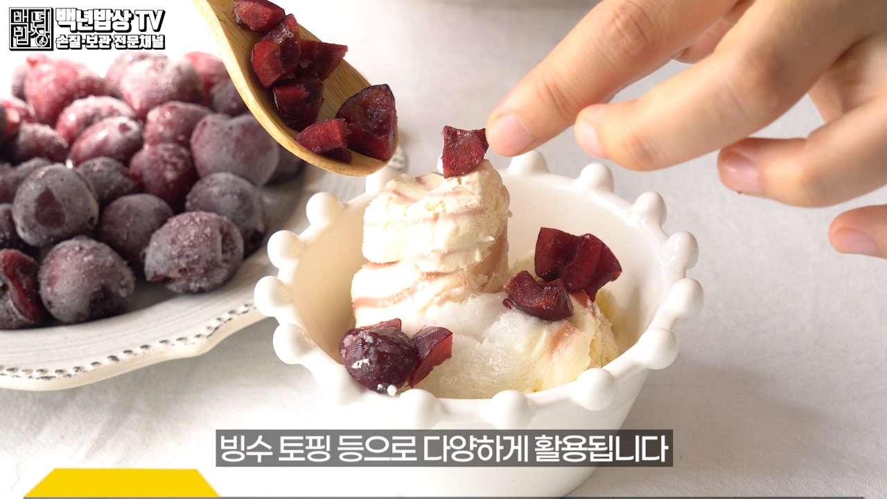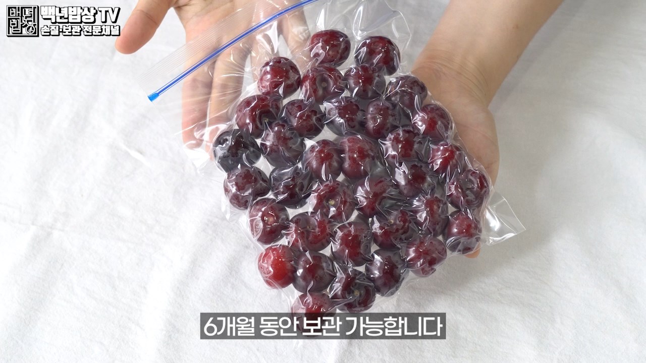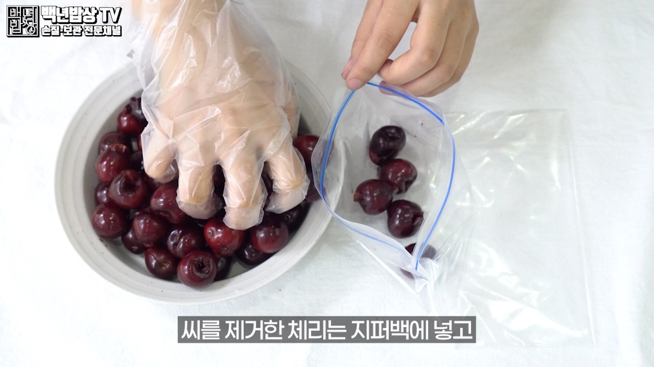 씨를 제거한 체리는 지퍼백에 넣고 빨대를 꽂아 진공상태로 밀봉하여 냉동고에 넣으면 6개월 동안 보관 가능합니다. (빨대를 꽂을 땐 내용물이 있는 대각선으로 꽂아 주세요.)