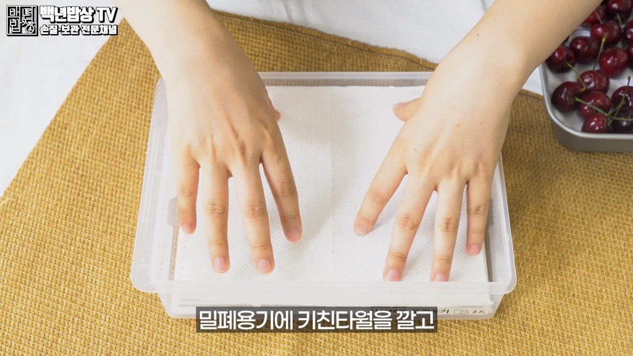 밀폐 용기에 키친타월을 깔고 꼭지가 있는 채로 올려 주세요. 층층이 쌓아 반복해 줍니다. 꼭지를 따면 과즙이 마르면서 상태가 안 좋아질 수 있어요.