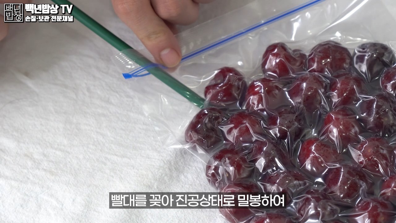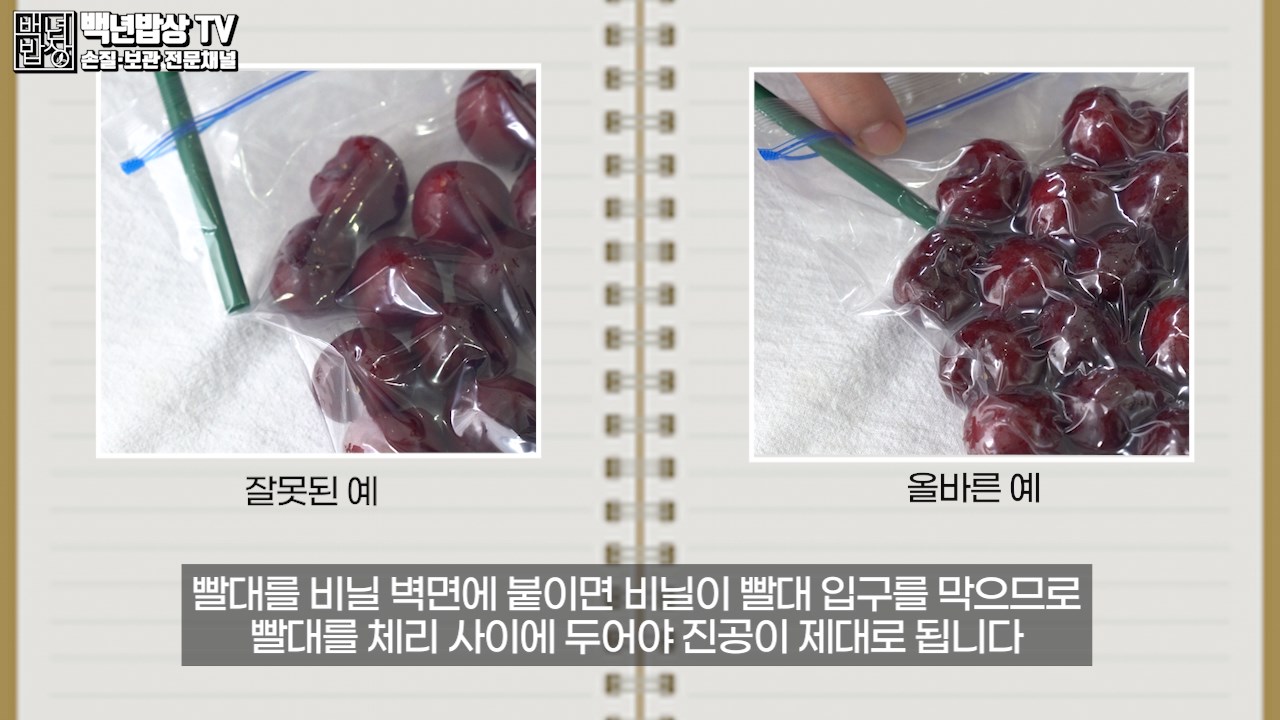 TIP. 빨대만 있으면 편리하게 진공포장 할 수 있어요. 빨대를 비닐 벽면에 붙이면 비닐이 빨대 입구를 막으므로 빨대를 체리 사이에 두어야 진공이 제대로 됩니다.