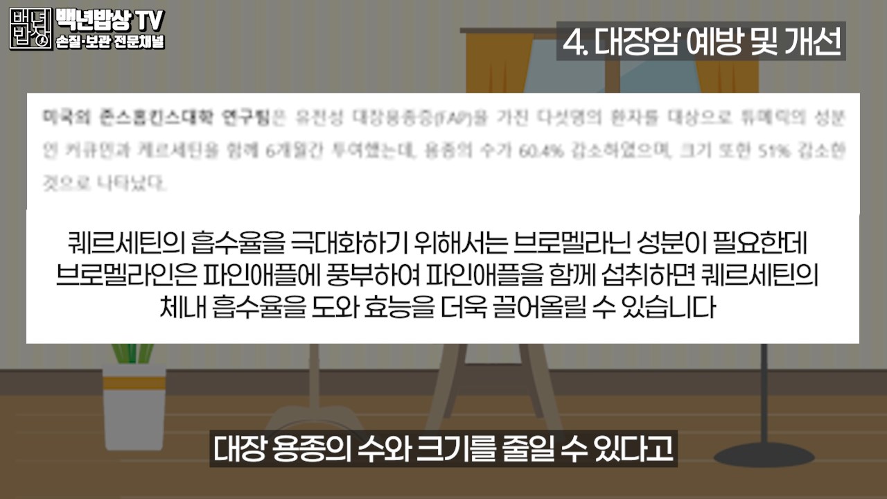 대장 용종의 수와 크기를 줄일 수 있다고 미국 존스 홉킨스대 연구팀이 밝혔습니다. (퀘르세틴의 흡수율을 극대화하기 위해서는 브로멜라닌 성분이 필요한데 브로멜라인은 파인애플에 풍부하여 퀘르세틴의 체내 흡수율을 도와 효능을 더욱 끌어올릴 수 있다.)