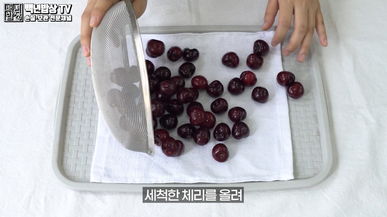 신선한 체리로 골라낸 것이 수분이 있다면 펼쳐서 면 타월로 제거해 줍니다. (물에 닿으면 쉽게 물러 질 수 있으니 세척하지 마세요.)