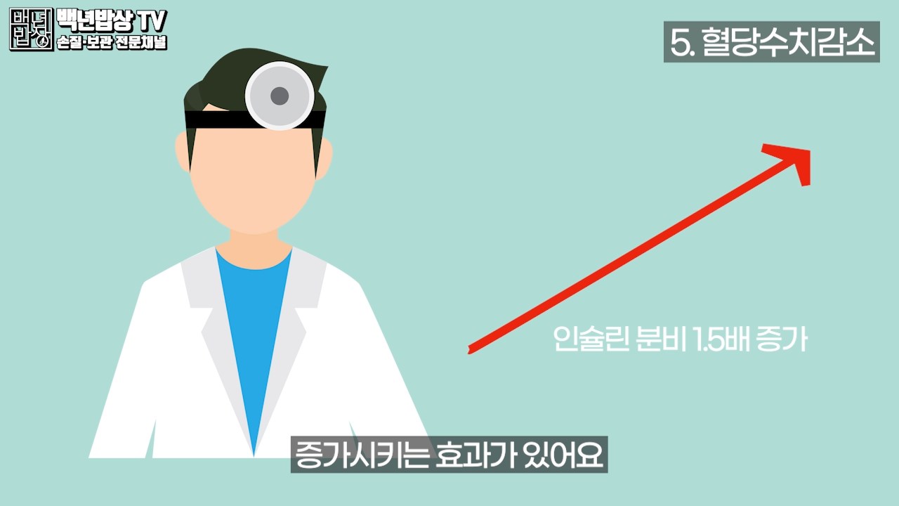 5.혈당수치감소 : 췌장에서 인슐린 분비를 1.5가량 증가시키는 효과가 있어요. 장에서 당을 분해하는 효소를 억제하고 혈액으로 포도당이 흡수되는 것을 막아줘요.
