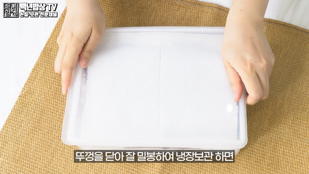 습기가 차지 않도록 마지막에도 키친타월을 올리고 뚜껑을 닫아 잘 밀봉하여 냉장보관 하면 7일간 보관 할 수 있어요. (보관 온도 1~3도)