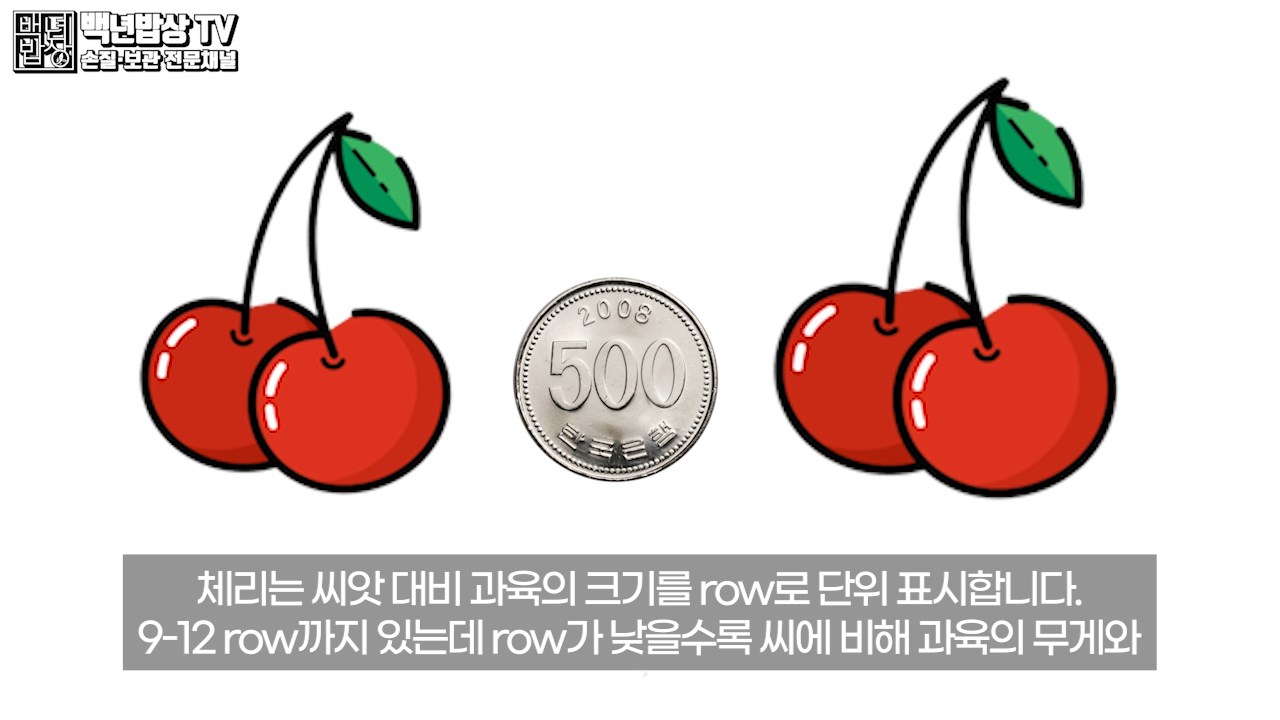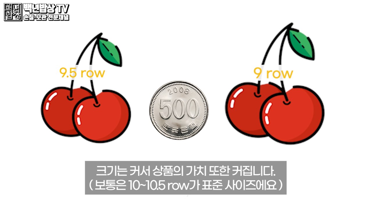 또한 포장 용기에 row가 표시되어 있다면 단위가 낮은 것으로 구매하세요. 체리는 씨앗 대비 과육의 크기를 row로 단위 표시합니다. 9-12 row까지 있는데 row가 낮을수록 씨에 비해 과육의 무게와 크기는 커서 상품의 가치 또한 커집니다. (보통은 10~10.5 row가 표준 사이즈에요)
