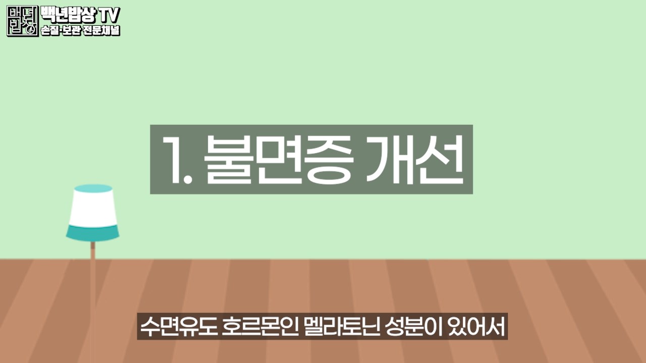 1. 불면증 개선 : 수면 유도 호르몬인 멜라토닌 성분이 있어서 신경 안정과 수면을 도와 불면증 예방에도 크게 도움이 됩니다.