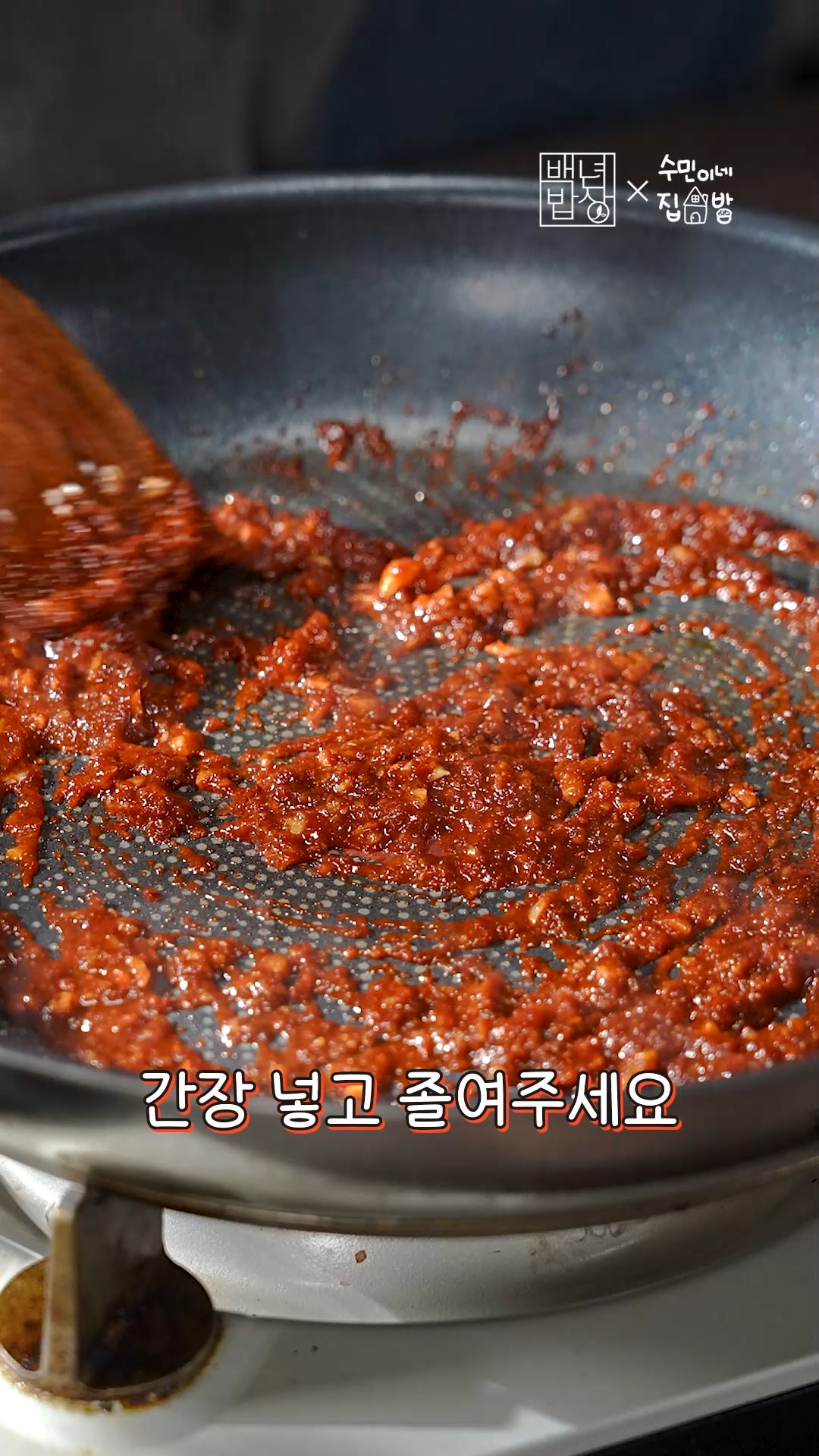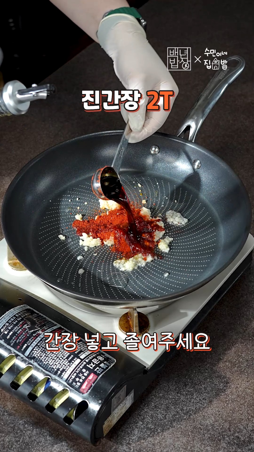 3. 팬에 다진 마늘, 고춧가루, 간장 넣고 졸여주세요